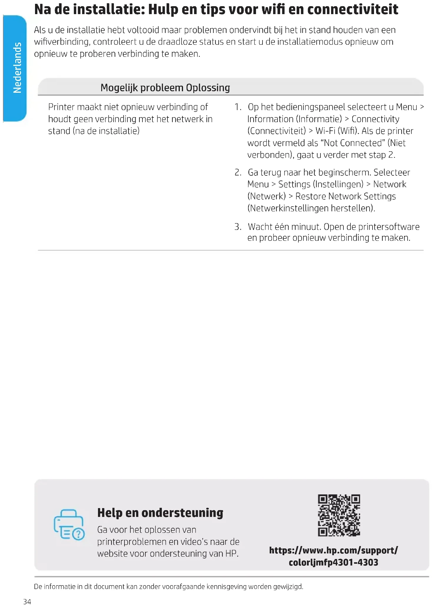 en probeer opnieuw verbinding te maken. https://www.hp.com/support/ colorljmfp4301-4303 Help en ondersteuning Ga voor het oplossen van printerproblemen en video’s naar de website voor ondersteuning van HP. De informatie in dit document kan zonder voorafgaande kennisgeving worden gewijzigd. Nederlands35 Eesti Juhtpaneel Abi paberi laadimisel Kui laadite Legal-tüüpi paberit, siis pigistage salve esiosa taga olevat juhikut ja tõmmake seda ettepoole. Salv 2 ulatub printeri esiosast välja umbes 51 mm jagu. Printeripõhist abiinfot leiate veebisaidilt hp.com/support/colorljmfp4301-4303. Töölaud Printeri ülesannetele ja olekule juurdepääsemiseks avage töölaud, puudutades või pühkides ekraani ülaosas. Menüü Vaadake kõiki printeri võimalusi. Logi sisse / Logi välja Annab printerile juurdepääsu kontrolli. Töö Printimine Skannimine Kopeerimine Faks USB spikker Paber36 Eesti