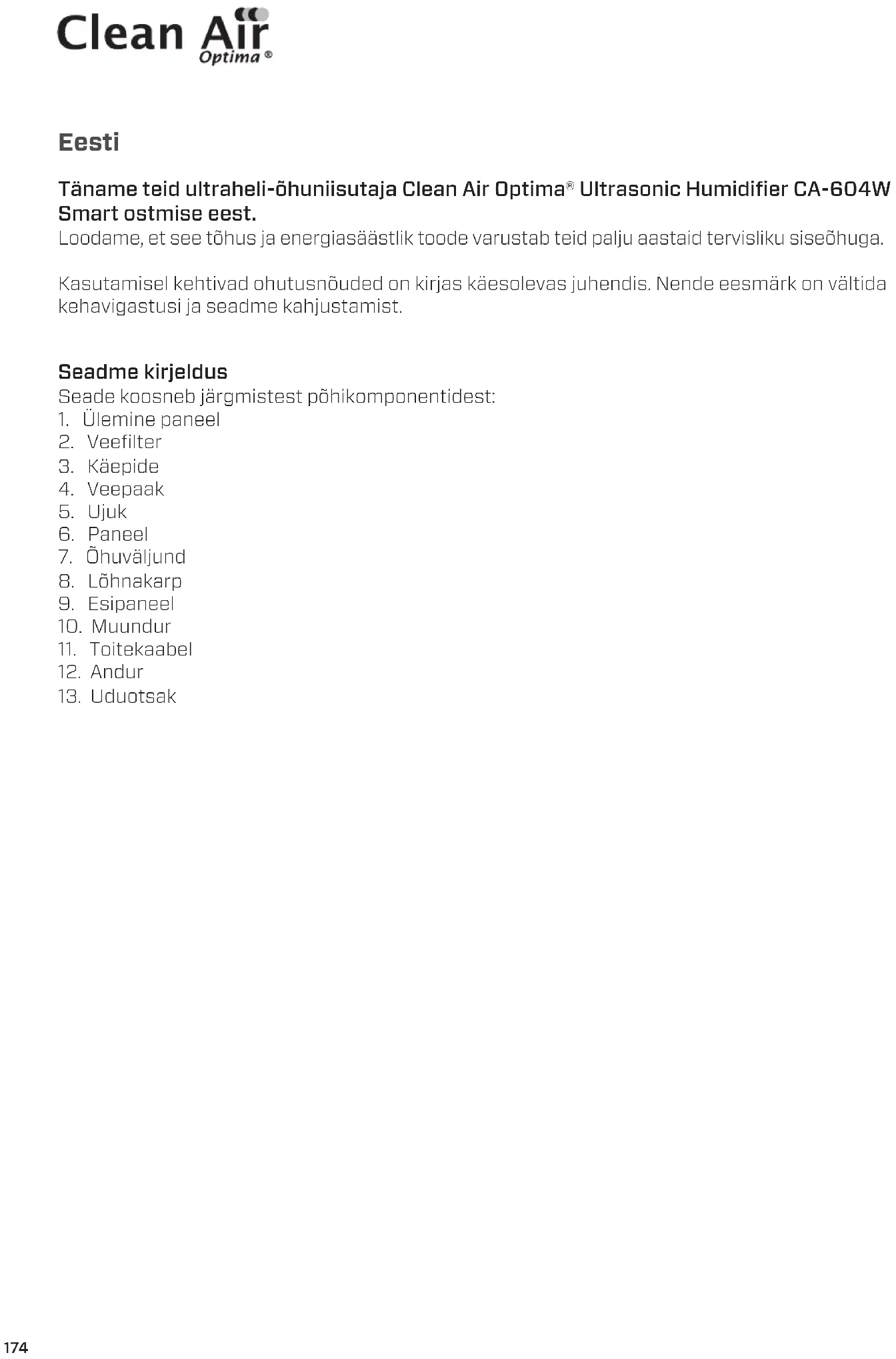 CA-604W Smart / Ekraan174 Eesti Täname teid ultraheli-õhuniisutaja Clean Air Optima® Ultrasonic Humidifier CA-604W Smart ostmise eest. Loodame, et see tõhus ja energiasäästlik toode varustab teid palju aastaid tervisliku siseõhuga. Kasutamisel kehtivad ohutusnõuded on kirjas käesolevas juhendis. Nende eesmärk on vältida kehavigastusi ja seadme kahjustamist. Seadme kirjeldus Seade koosneb järgmistest põhikomponentidest:
