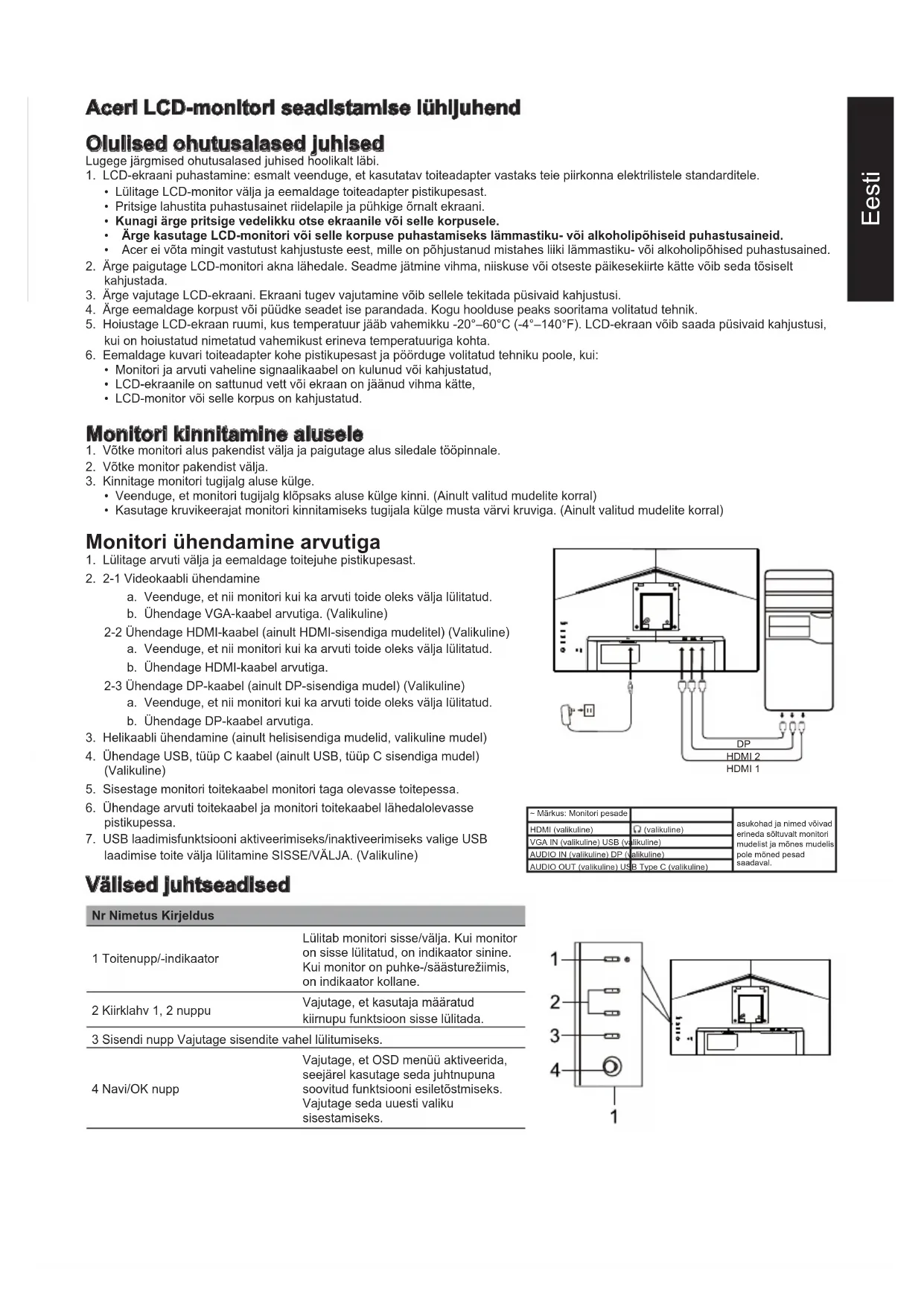 240HzEesti Aceri LCD-monitori seadistamise lühijuhend Olulised ohutusalased juhised Lugege järgmised ohutusalased juhised hoolikalt läbi. 1. LCD-ekraani puhastamine: esmalt veenduge, et kasutatav toiteadapter vastaks teie piirkonna elektrilistele standarditele.
