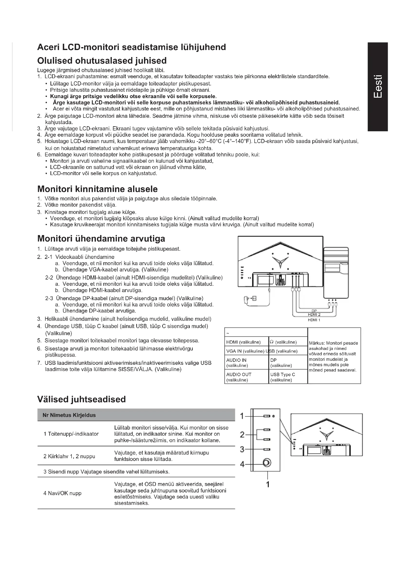 (tavaline) Kontrastsus Max 100000000:1 (ACM) Vaatenurk 178° (H) 178° (V) (CR = 10) Reaktsiooniaeg 2 ms (hallilt hallile), 0,5 ms (hallilt hallile, min) Paneeli tüüp VA Horisontaalsagedus HDMI: 31,469 - 192,692 KHz DP: 31,469 - 192,692 KHz Vertikaalsagedus HDMI: 48 – 165 Hz DP: 48 – 165 Hz Värvitäpsus 16,7 miljonit värvi Punkti taktsagedus HDMI: 393,092 MHz DP: 393,092 MHz Max eraldusvõime HDMI: 1920 x 1080 @ 165 Hz DP: 1920 x 1080 @ 165 Hz Automaatselt häälestuv VESA DDCCI / DDC2B Energiatarve Töörežiimis 25 W (tüüpiline) Puhkerežiimis 0,5 W (tüüpiline) Väljalülitatuna 0,3 W (tüüpiline) Sisendpistik HDMI (ainult HDMI-sisendiga mudel, valikuline) DP (ainult DP-sisendiga mudelitel) (valikuline) Video sisendsignaal DP (ainult DP-sisendiga mudelitel) (valikuline) HDMI (ainult HDMI-sisendiga mudel, valikuline) Kõlarid 2 W, 2 tk (ainult helisisendiga mudel, valikuline) Ekraani maksimaalsed mõõtmed Horisontaalne: 598 mm Vertikaalne: 336 mm Toiteallikas SISEND: 100–240 V, vahelduvvool, sagedus 50/60 Hz Ümbritseva keskkonna tingimused Töötemperatuur: 0° kuni 40°C Hoiustamise temperatuur: -20° kuni 60°C Suhteline niiskus: 20% kuni 80% Mõõtmed 614,7 (L) × 456,1 (K) × 240,7 (S) mm Mass (neto) 3,80 kg (netomass) Mehhanismi andmed Kallutamine: -5° kuni +15° Pööramine: Ei Kõrguse reguleerimine: Ei Telje ümber pööramine: Ei Eemaldatav tugijalg: Jah Välised juhtseadised Lüliti/nupud Toitenupp Kiirklahv 1 Kiirklahv 2 Sisend Menüü/Navi/OK Funktsioonid Heledus Kontrastsus Madalatasemeline sinine valgus Musta võimendus ACM HDR Üliteravus Gamma Värvitemperatuur Režiimid Värviruumile Hallskaala režiim 6-komponendiline värvitoon 6-komponendiline küllastus Helitugevus Vaigistatud Helimoonutused FreeSync Premium VRB Värskendussageduse väärtus Ülilühikest peiteaega AimPoint-sihik Keel Ekraanilekuvatava teate kestus Läbipaistvus Ekraanikuva lukk Sisend Allika automaatvalimine Lai (dün.) režiim Kiirklahvi määramine DDC/CI HDMI musta tase Kiirkäivitusrežiim Teave Lähtesta kõik sätted Tehnilised andmed erinevad mudeliti ja/või piirkonniti. Aceri toote kasutusjuhend ja muud dokumendid on saadaval Aceri ametlikul veebisaidil.Lietuvių LCD monitoriaus „Acer“ trumpasis sąrankos vadovas Svarbios saugos instrukcijos Atidžiai perskaitykite šias instrukcijas. 1. LCD ekrano valymas: pirmiausia užtikrinkite, kad maitinimo adapteris, kurį naudojate, atitiktų jūsų regiono elektros standartus.