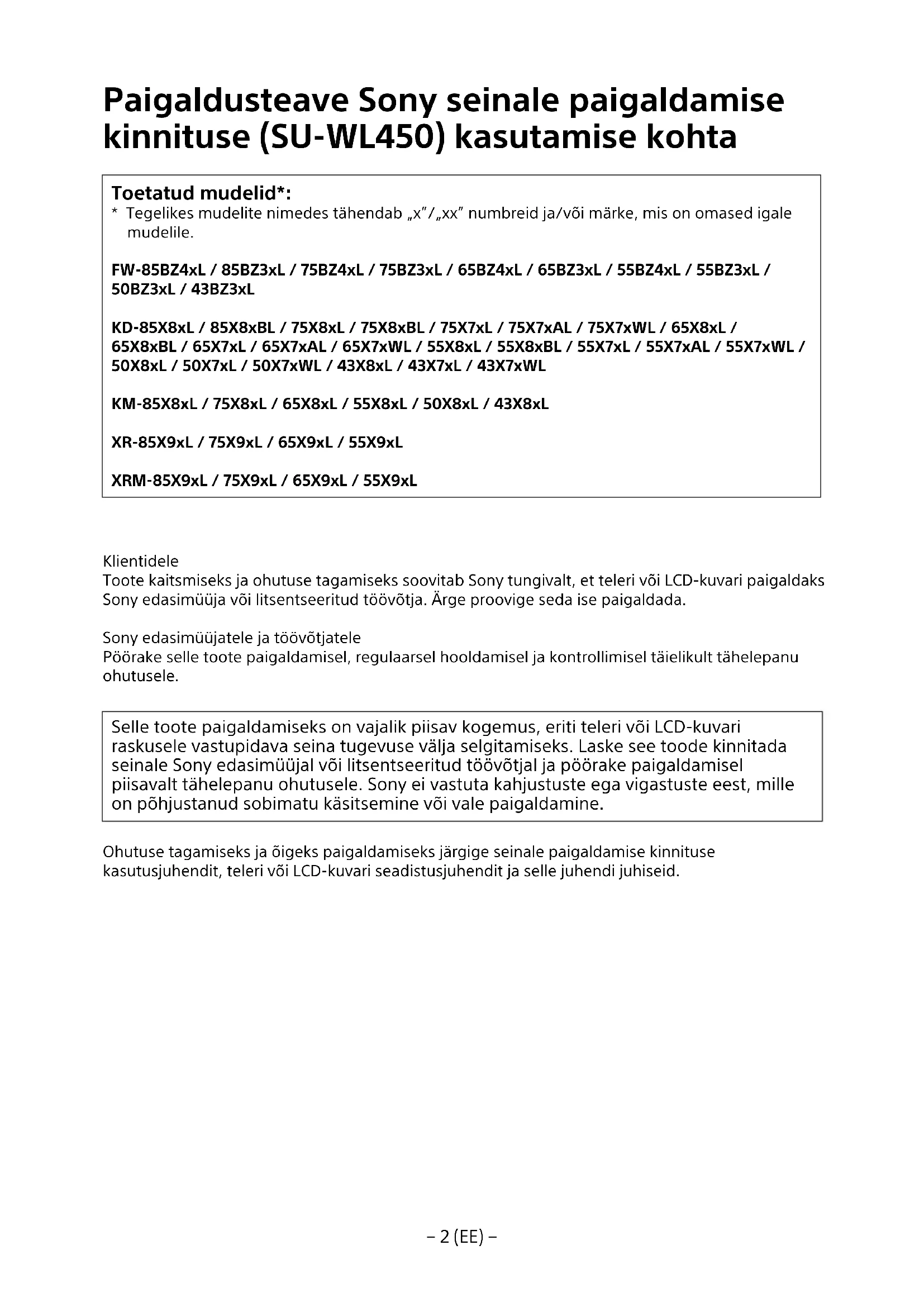 - Tegelikes mudelite nimedes tähendab „x”/„xx” numbreid ja/või märke, mis on omased igale mudelile. FW-85BZ4xL / 85BZ3xL / 75BZ4xL / 75BZ3xL / 65BZ4xL / 65BZ3xL / 55BZ4xL / 55BZ3xL / 50BZ3xL / 43BZ3xL KD-85X8xL / 85X8xBL / 75X8xL / 75X8xBL / 75X7xL / 75X7xAL / 75X7xWL / 65X8xL / 65X8xBL/ 65X7xL / 65X7xAL / 65X7xWL / 55X8xL / 55X8xBL / 55X7xL / 55X7xAL / 55X7xWL / 50X8xL / 50X7xL / 50X7xWL / 43X8xL / 43X7xL / 43X7xWL KM-85X8xL / 75X8xL / 65X8xL / 55X8xL / 50X8xL / 43X8xL XR-85X9xL / 75X9xL / 65X9xL / 55X9xL XRM-85X9xL / 75X9xL / 65X9xL / 55X9xL Klientidele Toote kaitsmiseks ja ohutuse tagamiseks soovitab Sony tungivalt, et teleri või LCD-kuvari paigaldaks Sony edasimüüja või litsentseeritud töövõtja. Ärge proovige seda ise paigaldada. Sony edasimüüjatele ja töövõtjatele Pöörake selle toote paigaldamisel, regulaarsel hooldamisel ja kontrollimisel täielikult tähelepanu ohutusele. Selle toote paigaldamiseks on vajalik piisav kogemus, eriti teleri või LCD-kuvari raskusele vastupidava seina tugevuse välja selgitamiseks. Laske see toode kinnitada seinale Sony edasimüüjal või litsentseeritud töövõtjal ja pöörake paigaldamisel piisavalt tähelepanu ohutusele. Sony ei vastuta kahjustuste ega vigastuste eest, mille on põhjustanud sobimatu käsitsemine või vale paigaldamine. Ohutuse tagamiseks ja õigeks paigaldamiseks järgige seinale paigaldamise kinnituse kasutusjuhendit, teleri või LCD-kuvari seadistusjuhendit ja selle juhendi juhiseid.− 3 (EE) −