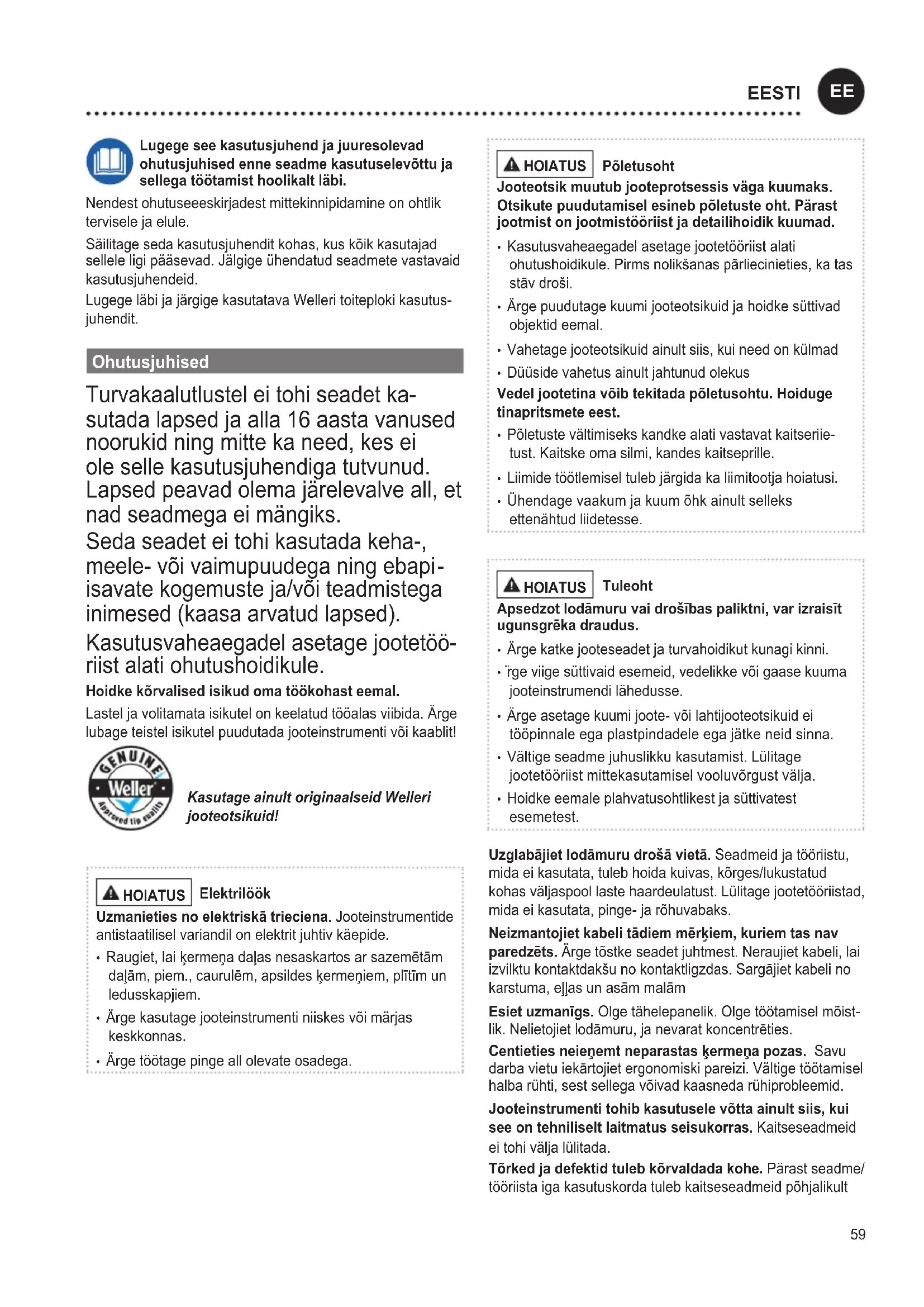 riist alati ohutushoidikule. Hoidke kõrvalised isikud oma töökohast eemal. Lastel ja volitamata isikutel on keelatud tööalas viibida. Ärge lubage teistel isikutel puudutada jooteinstrumenti või kaablit! Kasutage ainult originaalseid Welleri jooteotsikuid! HOIATUS Elektrilöök Uzmanieties no elektriskā trieciena. Jooteinstrumentide antistaatilisel variandil on elektrit juhtiv käepide.