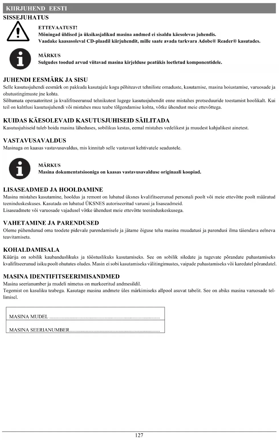 Oleme pühendunud oma toodete pidevale parendamisele ja jätame õiguse teha masina muudatusi ja parendusi ilma täiendava eelneva teavitamiseta. KOHALDAMISALA Küürija on sobilik kaubanduslikuks ja tööstuslikuks kasutamiseks. See on sobilik siledate ja tugevate põrandate puhastamiseks kvalifitseerunud isiku poolt ohututes oludes. Masin ei sobi kasutamiseks välitingimustes, vaipade puhastamiseks või karedatel põrandatel. MASINA IDENTIFITSEERIMISANDMED Masina seerianumber ja mudeli nimetus on markeeritud andmesildil. Tegemist on kasuliku teabega. Kasutage masina andmete üles märkimiseks allpool asuvat tabelit. See on abiks masina varuosade tel- limisel. MASINA MUDEL ........................................................................................