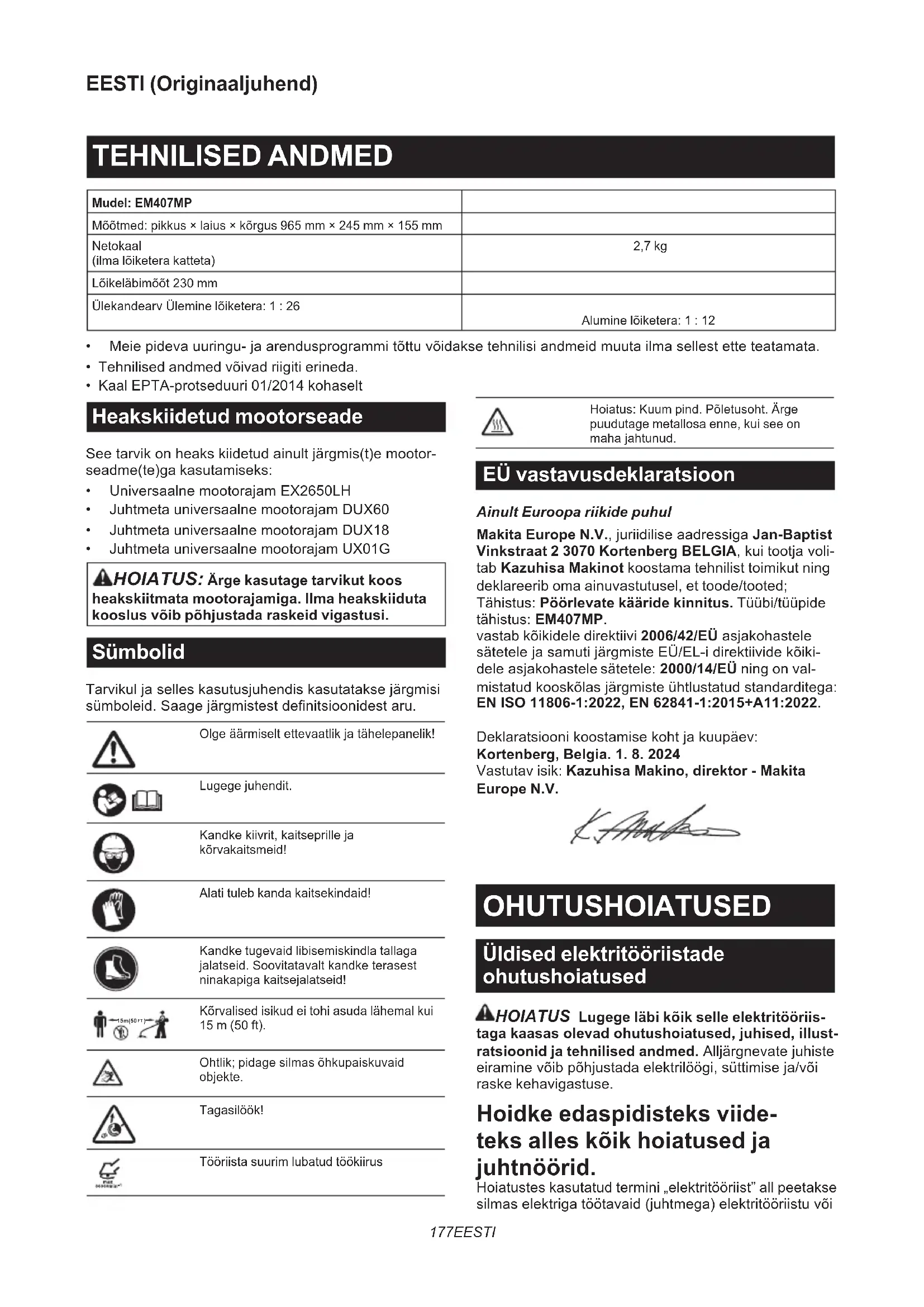 Kõrvalised isikud ei tohi asuda lähemal kui 15 m (50 ft).Ohtlik; pidage silmas õhkupaiskuvaid objekte.Tagasilöök!Tööriista suurim lubatud töökiirusHoiatus: Kuum pind. Põletusoht. Ärge puudutage metallosa enne, kui see on mahajahtunud. EÜ vastavusdeklaratsioon Ainult Euroopa riikide puhulMakita Europe N.V.,juriidiliseaadressigaJan-Baptist Vinkstraat 2 3070 Kortenberg BELGIA,kuitootjavoli-tab Kazuhisa Makinot koostama tehnilist toimikut ning deklareerib oma ainuvastutusel, et toode/tooted;Tähistus: Pöörlevate kääride kinnitus. Tüübi/tüüpide tähistus: EM407MP.vastab kõikidele direktiivi 2006/42/EÜasjakohastelesätetelejasamutijärgmisteEÜ/EL-idirektiividekõiki- deleasjakohastelesätetele:2000/14/EÜ ning on val- mistatudkooskõlasjärgmisteühtlustatudstandarditega:EN ISO 11806-1:2022, EN 62841-1:2015+A11:2022. Deklaratsioonikoostamisekohtjakuupäev:Kortenberg, Belgia. 1. 8. 2024 Vastutav isik: Kazuhisa Makino, direktor - Makita Europe N.V. OHUTUSHOIATUSED Üldised elektritööriistade ohutushoiatused HOIATUS Lugege läbi kõik selle elektritööriis- taga kaasas olevad ohutushoiatused, juhised, illust-ratsioonid ja tehnilised andmed.Alljärgnevatejuhisteeiraminevõibpõhjustadaelektrilöögi,süttimiseja/võiraske kehavigastuse. Hoidke edaspidisteks viide- teks alles kõik hoiatused ja juhtnöörid. Hoiatustes kasutatud termini „elektritööriist” all peetakse silmaselektrigatöötavaid(juhtmega)elektritööriistuvõi178 EESTI akugatöötavaid(juhtmeta)elektritööriistu. Tööpiirkonna ohutus