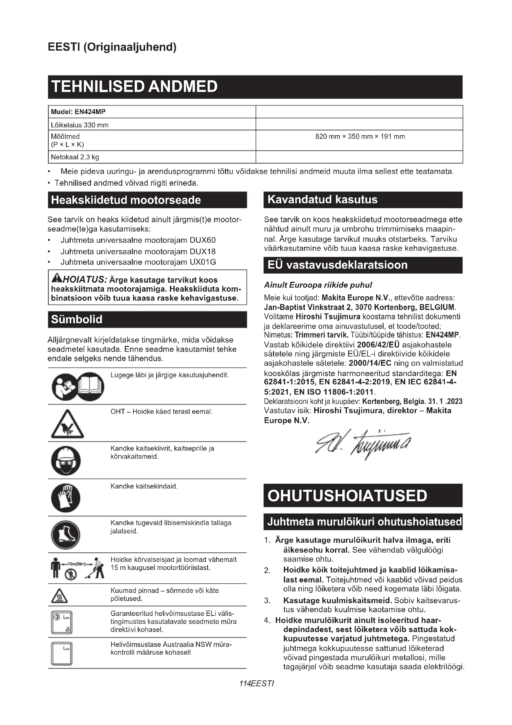 - JuhtmetauniversaalnemootorajamUX01G HOIATUS: Ärge kasutage tarvikut koos heakskiitmata mootorajamiga. Heakskiiduta kom- binatsioon võib tuua kaasa raske kehavigastuse. Sümbolid Alljärgnevaltkirjeldataksetingmärke,midavõidakse seadmetel kasutada. Enne seadme kasutamist tehke endale selgeks nende tähendus. Lugegeläbijajärgigekasutusjuhendit. OHT – Hoidke käed terast eemal. Kandkekaitsekiivrit,kaitseprilleja kõrvakaitsmeid. Kandke kaitsekindaid. Kandketugevaidlibisemiskindlatallaga jalatseid. Hoidkekõrvalseisjadjaloomadvähemalt 15 m kaugusel mootortööriistast. Kuumad pinnad – sõrmede või käte põletused. Garanteeritud helivõimsustase ELi välis- tingimustes kasutatavate seadmete müra direktiivi kohasel. Helivõimsustase Austraalia NSW müra- kontrolli määruse kohaselt Kavandatud kasutus See tarvik on koos heakskiidetud mootorseadmega ette nähtudainultmurujaumbrohutrimmimiseksmaapin- nal.Ärgekasutagetarvikutmuuksotstarbeks.Tarviku väärkasutaminevõibtuuakaasaraskekehavigastuse. EÜ vastavusdeklaratsioon Ainult Euroopa riikide puhul Meiekuitootjad:Makita Europe N.V., ettevõtte aadress: Jan-Baptist Vinkstraat 2, 3070 Kortenberg, BELGIUM. Volitame Hiroshi Tsujimura koostama tehnilist dokumenti jadeklareerimeomaainuvastutusel,ettoode/tooted; Nimetus: Trimmeri tarvik.Tüübi/tüüpidetähistus:EN424MP. Vastabkõikideledirektiivi2006/42/EÜasjakohastele säteteleningjärgmisteEÜ/EL-idirektiividekõikidele asjakohastelesätetele:2000/14/EC ning on valmistatud kooskõlasjärgmisteharmoneeritudstandarditega:EN 62841-1:2015, EN 62841-4-2:2019, EN IEC 62841-4- 5:2021, EN ISO 11806-1:2011. Deklaratsioonikohtjakuupäev:Kortenberg, Belgia. 31. 1 .2023 Vastutav isik: Hiroshi Tsujimura, direktor – Makita Europe N.V. OHUTUSHOIATUSED Juhtmeta murulõikuri ohutushoiatused