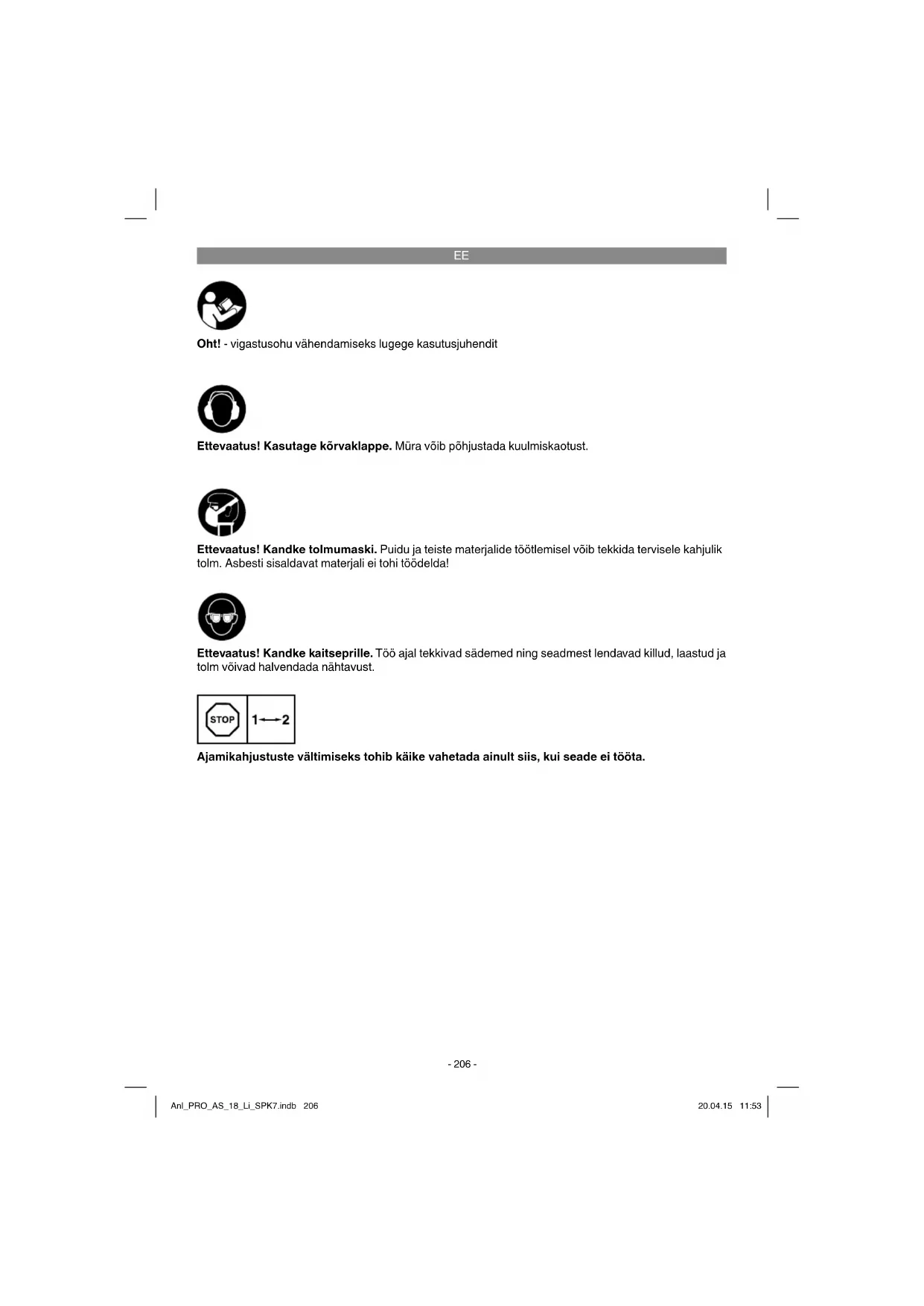 Oht! - vigastusohu vähendamiseks lugege kasutusjuhendit Ettevaatus! Kasutage kõrvaklappe. Müra võib põhjustada kuulmiskaotust. Ettevaatus! Kandke kaitseprille. Töö ajal tekkivad sädemed ning seadmest lendavad killud, laastud ja tolm võivad halvendada nähtavust. Ettevaatus! Kandke tolmumaski. Puidu ja teiste materjalide töötlemisel võib tekkida tervisele kahjulik tolm. Asbesti sisaldavat materjali ei tohi töödelda! Ajamikahjustuste vältimiseks tohib käike vahetada ainult siis, kui seade ei tööta. Anl_PRO_AS_18_Li_SPK7.indb 206Anl_PRO_AS_18_Li_SPK7.indb 206 20.04.15 11:5320.04.15 11:53EE