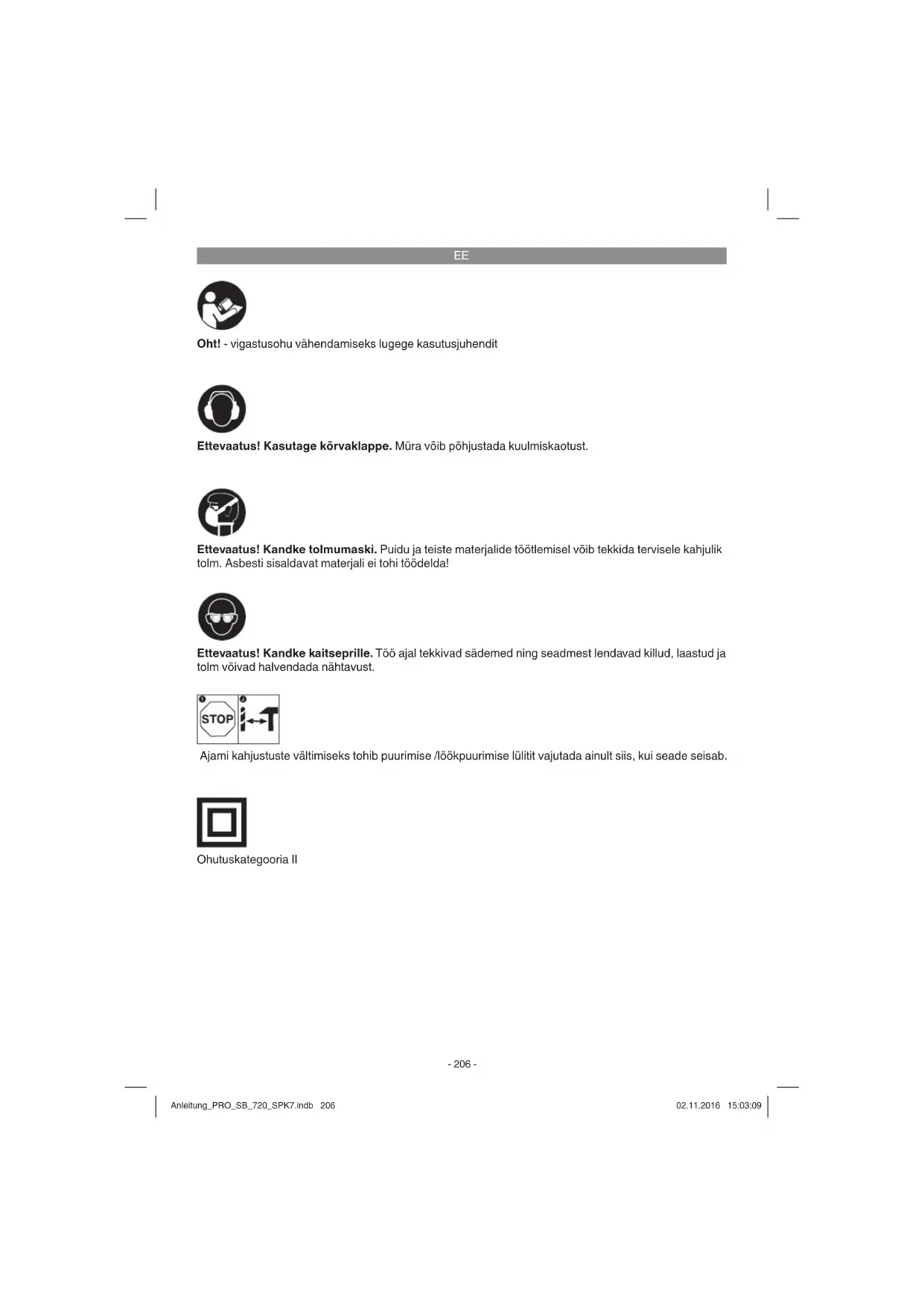 Oht! - vigastusohu vähendamiseks lugege kasutusjuhendit Ettevaatus! Kasutage kõrvaklappe. Müra võib põhjustada kuulmiskaotust. Ettevaatus! Kandke kaitseprille. Töö ajal tekkivad sädemed ning seadmest lendavad killud, laastud ja tolm võivad halvendada nähtavust. Ettevaatus! Kandke tolmumaski. Puidu ja teiste materjalide töötlemisel võib tekkida tervisele kahjulik tolm. Asbesti sisaldavat materjali ei tohi töödelda! Ajami kahjustuste vältimiseks tohib puurimise /löökpuurimise lülitit vajutada ainult siis, kui seade seisab. Ohutuskategooria II Anleitung_PRO_SB_720_SPK7.indb 206Anleitung_PRO_SB_720_SPK7.indb 206 02.11.2016 15:03:0902.11.2016 15:03:09EE