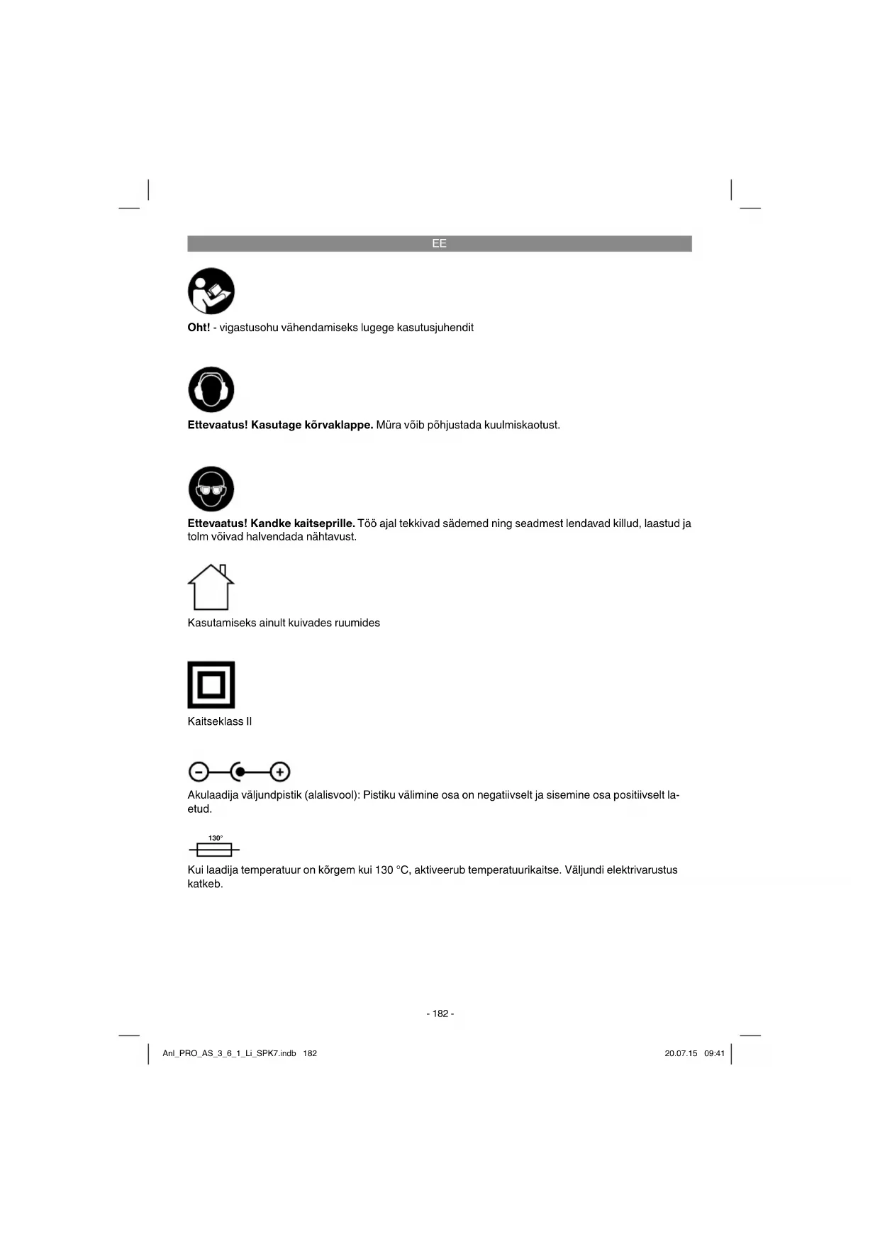 Oht! - vigastusohu vähendamiseks lugege kasutusjuhendit Ettevaatus! Kasutage kõrvaklappe. Müra võib põhjustada kuulmiskaotust. Ettevaatus! Kandke kaitseprille. Töö ajal tekkivad sädemed ning seadmest lendavad killud, laastud ja tolm võivad halvendada nähtavust. Kasutamiseks ainult kuivades ruumides Kaitseklass II Akulaadija väljundpistik (alalisvool): Pistiku välimine osa on negatiivselt ja sisemine osa positiivselt la- etud. 130° Kui laadija temperatuur on kõrgem kui 130 °C, aktiveerub temperatuurikaitse. Väljundi elektrivarustus katkeb. Anl_PRO_AS_3_6_1_Li_SPK7.indb 182Anl_PRO_AS_3_6_1_Li_SPK7.indb 182 20.07.15 09:4120.07.15 09:41EE
