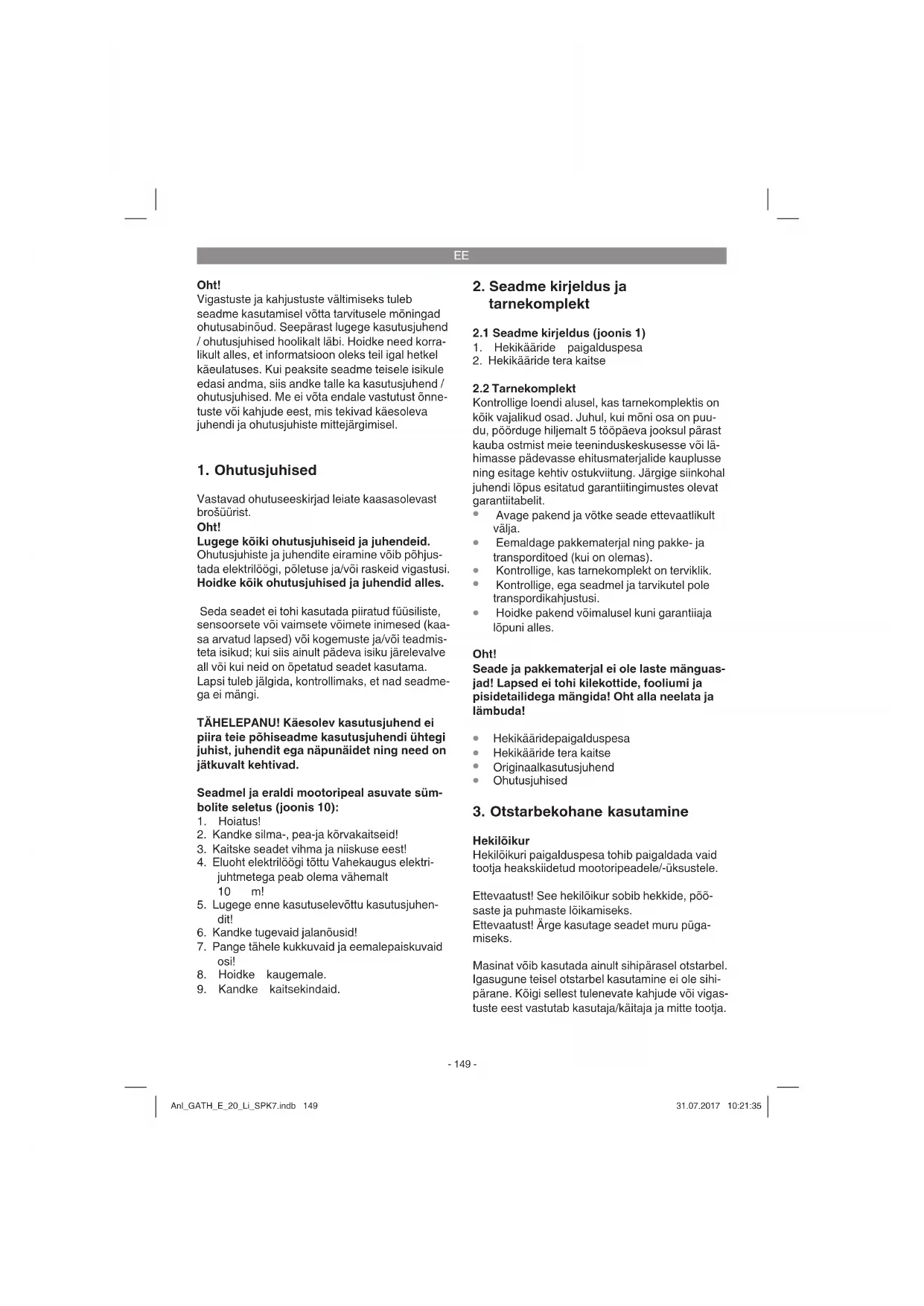 Hekilõikur Hekilõikuri paigalduspesa tohib paigaldada vaid tootja heakskiidetud mootoripeadele/-üksustele. Ettevaatust! See hekilõikur sobib hekkide, põõ- saste ja puhmaste lõikamiseks. Ettevaatust! Ärge kasutage seadet muru püga- miseks. Masinat võib kasutada ainult sihipärasel otstarbel. Igasugune teisel otstarbel kasutamine ei ole sihi- pärane. Kõigi sellest tulenevate kahjude või vigas- tuste eest vastutab kasutaja/käitaja ja mitte tootja. Anl_GATH_E_20_Li_SPK7.indb 149Anl_GATH_E_20_Li_SPK7.indb 149 31.07.2017 10:21:3531.07.2017 10:21:35EE