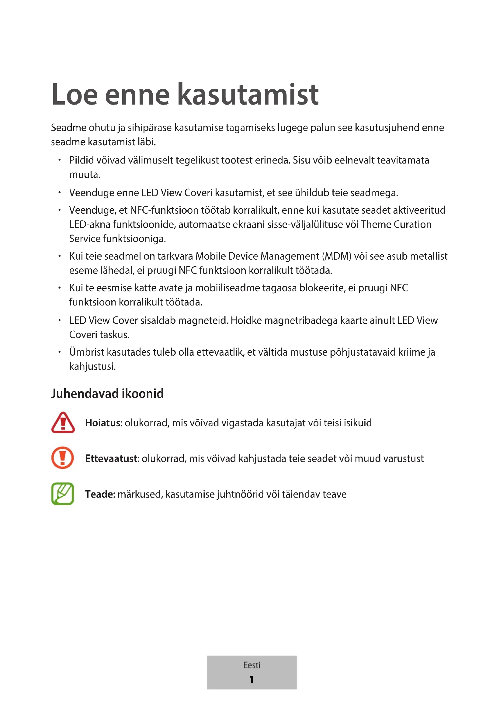 Ümbrist kasutades tuleb olla ettevaatlik, et vältida mustuse põhjustatavaid kriime ja kahjustusi. Juhendavad ikoonid Hoiatus: olukorrad, mis võivad vigastada kasutajat või teisi isikuid Ettevaatust: olukorrad, mis võivad kahjustada teie seadet või muud varustust Teade: märkused, kasutamise juhtnöörid või täiendav teave Eesti