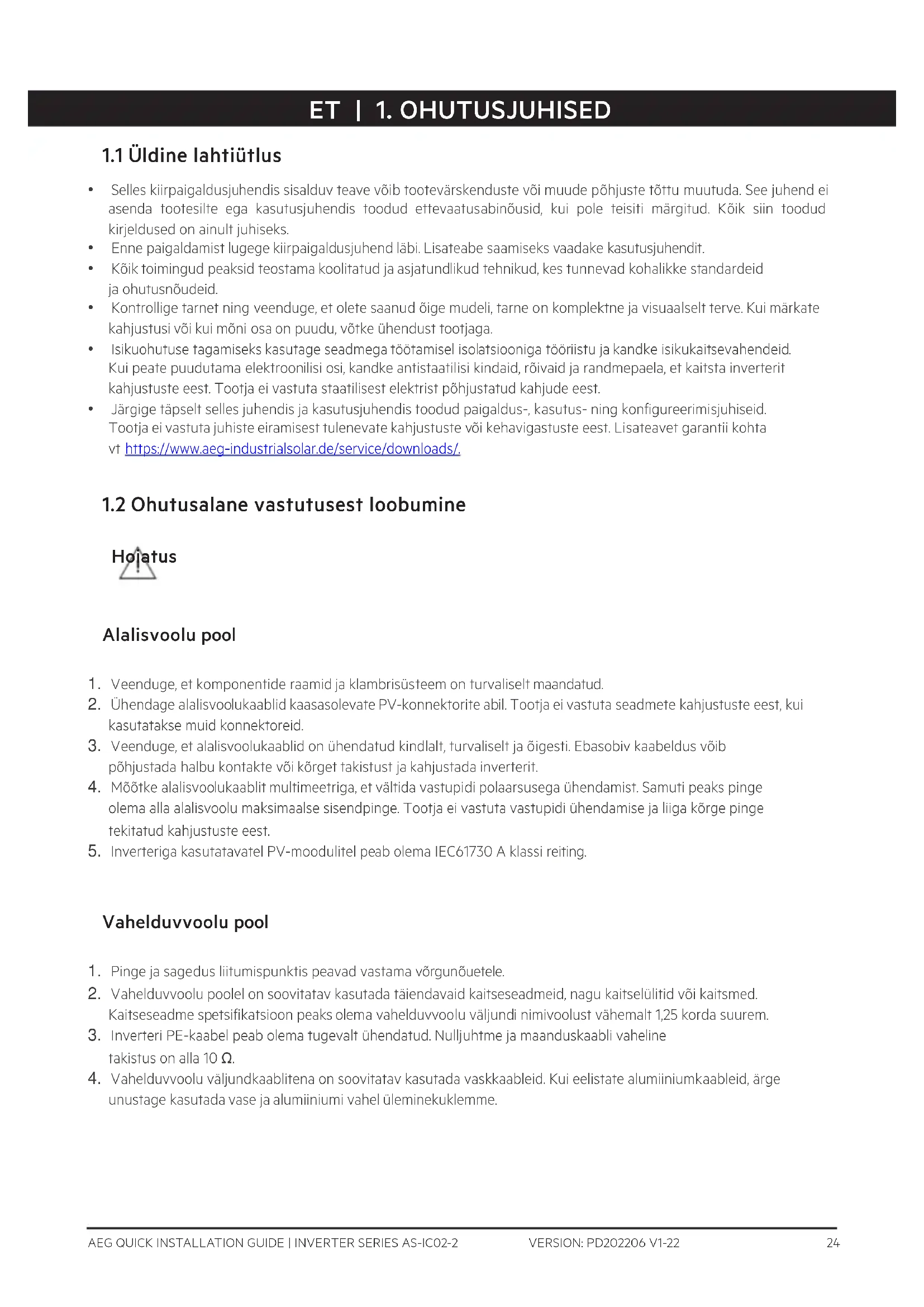 - Kemikaalide registreerimise, hindamise, autoriseerimise ja piiramise direktiiv (EÜ) nr 1907/2006 (REACH) ELi vastavusdeklaratsiooni saate alla laadida aadressilt https://www.aeg-industrialsolar.de/service/downloads/.