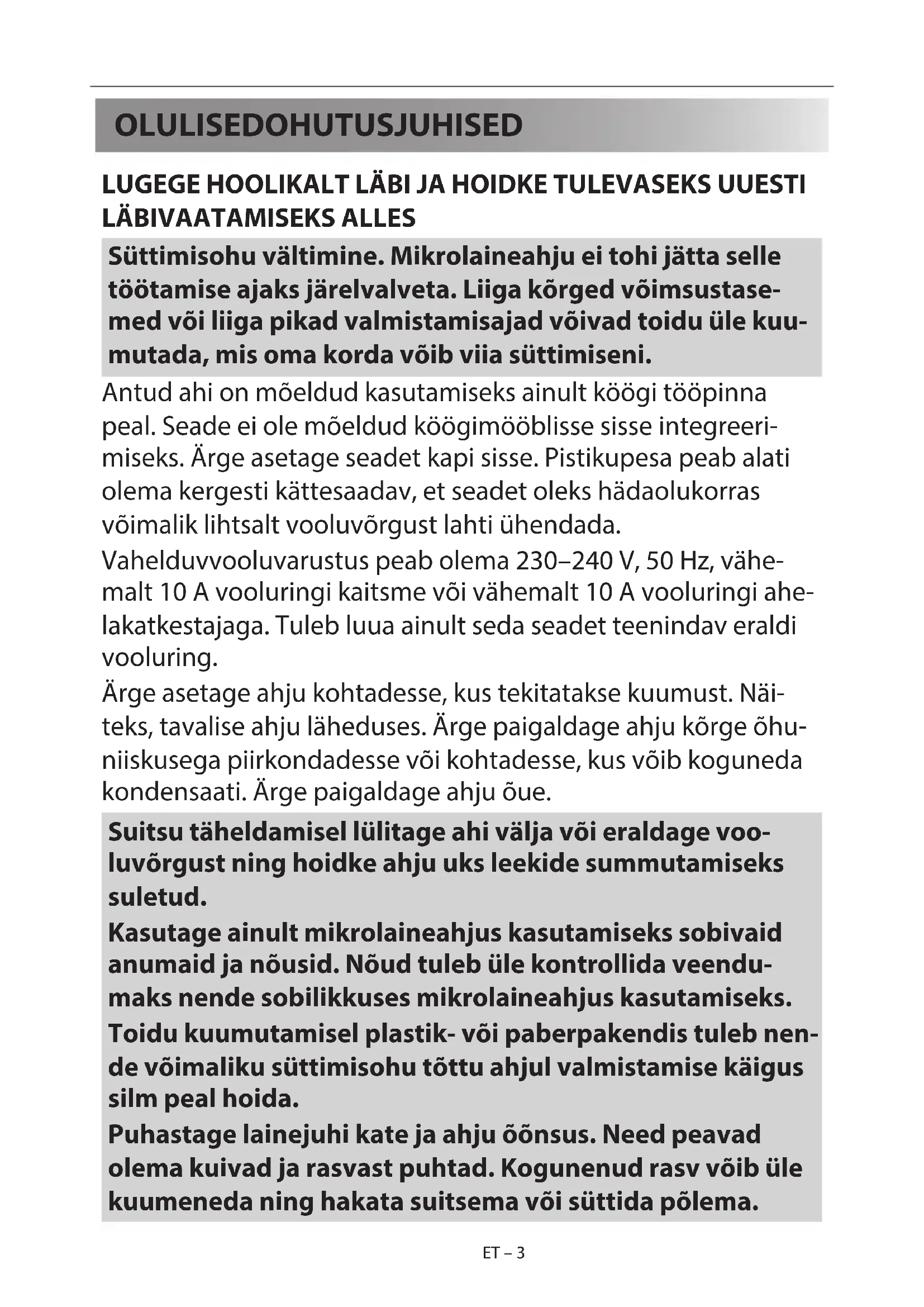 Süttimisohu vältimine. Mikrolaineahju ei tohi jätta selle töötamise ajaks järelvalveta. Liiga kõrged võimsustase- med või liiga pikad valmistamisajad võivad toidu üle kuu- mutada, mis oma korda võib viia süttimiseni. Antud ahi on mõeldud kasutamiseks ainult köögi tööpinna peal. Seade ei ole mõeldud köögimööblisse sisse integreeri- miseks. Ärge asetage seadet kapi sisse. Pistikupesa peab alati olema kergesti kättesaadav, et seadet oleks hädaolukorras võimalik lihtsalt vooluvõrgust lahti ühendada. Vahelduvvooluvarustus peab olema 230–240V, 50Hz, vähe- malt 10A vooluringi kaitsme või vähemalt 10A vooluringi ahe- lakatkestajaga. Tuleb luua ainult seda seadet teenindav eraldi vooluring. Ärge asetage ahju kohtadesse, kus tekitatakse kuumust. Näi- teks, tavalise ahju läheduses. Ärge paigaldage ahju kõrge õhu- niiskusega piirkondadesse või kohtadesse, kus võib koguneda kondensaati. Ärge paigaldage ahju õue. Suitsu täheldamisel lülitage ahi välja või eraldage voo- luvõrgust ning hoidke ahju uks leekide summutamiseks suletud. Kasutage ainult mikrolaineahjus kasutamiseks sobivaid anumaid ja nõusid. Nõud tuleb üle kontrollida veendu- maks nende sobilikkuses mikrolaineahjus kasutamiseks. Toidu kuumutamisel plastik- või paberpakendis tuleb nen- de võimaliku süttimisohu tõttu ahjul valmistamise käigus silm peal hoida. Puhastage lainejuhi kate ja ahju õõnsus. Need peavad olema kuivad ja rasvast puhtad. Kogunenud rasv võib üle kuumeneda ning hakata suitsema või süttida põlema. ET – 4ET ET – 3 ET – 4ET – 4 Ärge pange kergesti süttivaid materjale ahju või ventilatsioo- niavade lähedusse. Ärge katke ventilatsiooniavasid kinni. Eemaldage toidult ja toidupakenditelt kõik metallist ja traadist kinnitused jms. Metallpindadel tekkiv kaarlekk võib põhjustada süttimise. Ärge kasutage mikrolaineahju fritüürimise jaoks õli kuumuta- miseks. Temperatuuri ei ole võimalik kontrollida ning õli võib süttida põlema. Kasutage popkorni valmistamiseks ainult spetsiaalseid mikro- laine popkornivalmistajaid. Ärge kasutage ahju sisemust toidu või muude esemete hoidmi- seks. Kontrollige ahju käivitamise järel üle selle seadistused ja veen- duge, et ahi töötab nii nagu soovitud. Ärge jätke töötavat ahju järelvalveta. Ülekuumenemise ja süttimise vältimiseks tuleb suure suhkru- ja rasvasisaldusega toitude, näiteks vorstide või kookide, valmista- misel või taaskuumutamisel olla äärmiselt tähelepanelik. Tutvu- ge kasutusjuhendis vastavate näpunäidetega. Vigastumisohu vältimine. HOIATUS! Ärge kasutage ahju, kui see on kahjustatud või selle töös on tõrkeid. Kontrollige enne kasutamist järgmisi punkte: a) veenduge, et uks sulgub korralikult ning ei ole kaardus või kõveriti; b) kontrollige ja veenduge, et hinged ja ukse turvalukud pole purunenud ega lahti; c) veenduge, et uksetihendid ega tihenduspinnad ei ole kah- justatud; d) veenduge, et ahju sees ega uksel ei ole auke; e) veenduge, et toitejuhe ega pistik ei ole kahjustatud. Kui uks või uksetihendid on kahjustatud, ei tohi ahju kasutada kuni see on kompetentse isiku poolt ära parandatud. Ärge mitte kunagi ahju ise reguleerige, parandage egaET – 5ET – 5 muutke. Kõikidele teistele, peale asjatundjatest isikute, on igasugused hooldus- ja remonditööd, millised hõlma- vad mikrolainete eest kaitset pakkuva katte eemaldamist, ohtlikud. Ärge kasutage ahju, kui selle uks on avatud ega muutke ahjuuk- se turvalukke mingilgi moel. Ärge kasutage ahju, kui uksetihen- di ja tihenduspindade vahel on mõni ese. Ärge laske uksetihenditele ja ukse ümber asuvatele pinda- dele koguneda rasval või mustusel. Puhastage ahju regu- laarselt ning eemaldage kõik kogunenud toidujäägid. Järgige peatükis „Hooldamine ja puhastamine“ toodud juhiseid. Ahju puhtana mitte hoidmine võib viia pindade kahjustumiseni, mis võib omakorda mõjuda negatiivselt seadme elueale ning tuua kaasa ohuolukorra. Südamestimulaatoriga kasutajad peaksid pidama nõu oma arsti või südamestimulaatori tootjaga võimalike ettevaatusabinõude suhtes seoses mikrolaineahjudega. Elektrilöögi vältimine