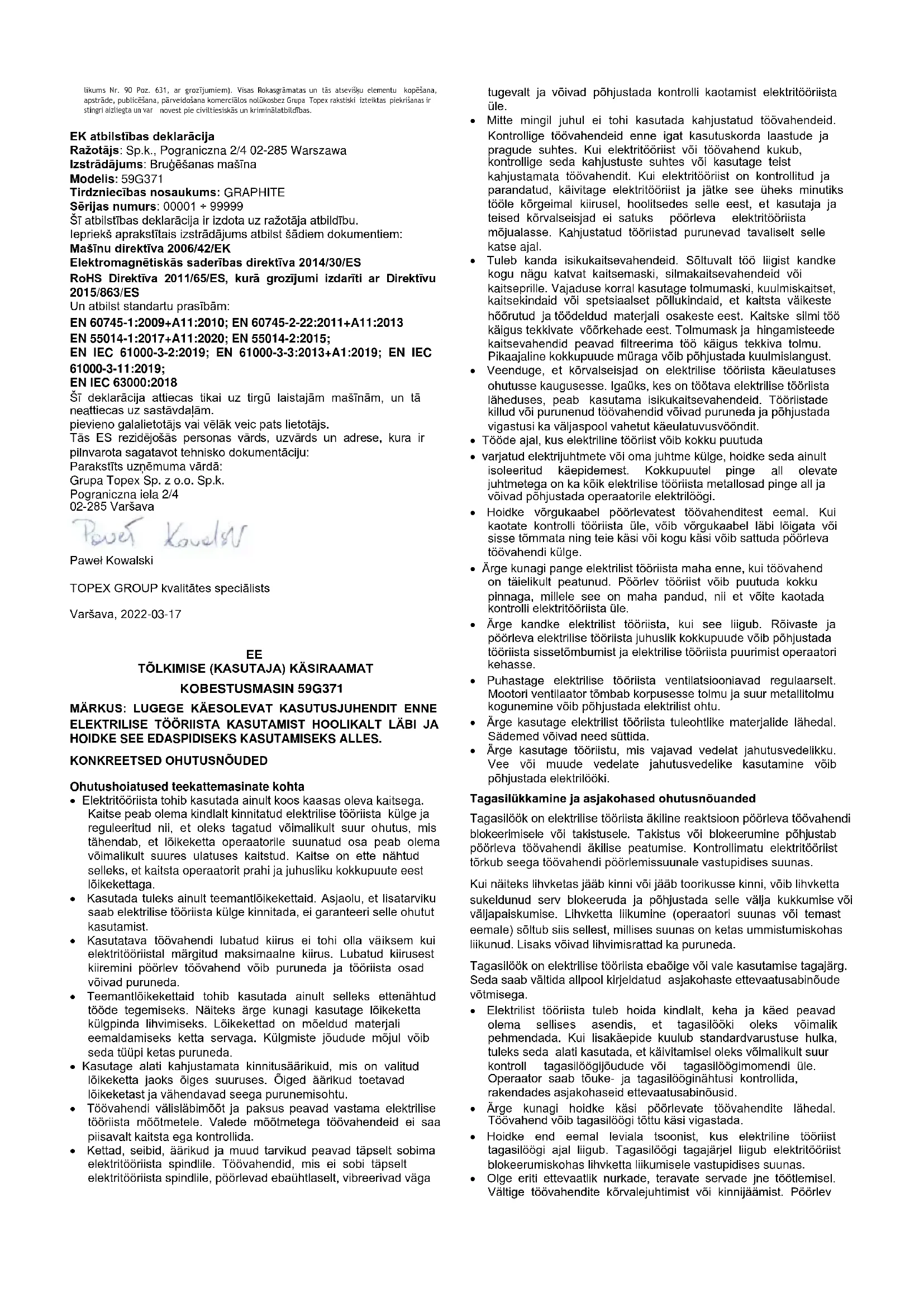 EÜ vastavusdeklaratsioon Tootja: Grupa Topex Sp. z o.o. Sp.k., Pograniczna 2/4 02-285 Warszawa: Grupa Topex Sp. z o.o. Sp.k., Pograniczna 2/4 02-285 Warszawa Toode: Teekattemasin: Teekattemasin Mudel: 59G371 Kaubanimi: GRAPHITE Seerianumber: 00001 ÷ 99999 Käesolev vastavusdeklaratsioon on välja antud tootja ainuvastutusel. Eespool kirjeldatud toode vastab järgmistele dokumentidele: Masinadirektiiv 2006/42/EÜ Elektromagnetilise ühilduvuse direktiiv 2014/30/EL RoHS direktiiv 2011/65/EL, muudetud direktiiviga 2015/863/EL Ja vastab standardite nõuetele: EN 60745-1:2009+A11:2010; EN 60745-2-22:2011+A11:2013 EN 55014-1:2017+A11:2020; EN 55014-2:2015; EN IEC 61000-3-2:2019; EN 61000-3-3:2013+A1:2019; EN IEC 61000-3-11:2019; EN IEC 63000:2018 Käesolev deklaratsioon käsitleb ainult masinat sellisena, nagu see on turule viidud, ja ei hõlma komponente mida lõppkasutaja lisab või mida ta teostab hiljem. Tehnilise toimiku koostamiseks volitatud ELi residendist isiku nimi ja aadress: Allkirjastatud järgmiste isikute nimel: Grupa Topex Sp. z o.o. Sp.k. 2/4 Pograniczna tänav 02-285 Varssavi Paweł Kowalski TOPEX GROUP Kvaliteediametnik Varssavi, 2022-03-17