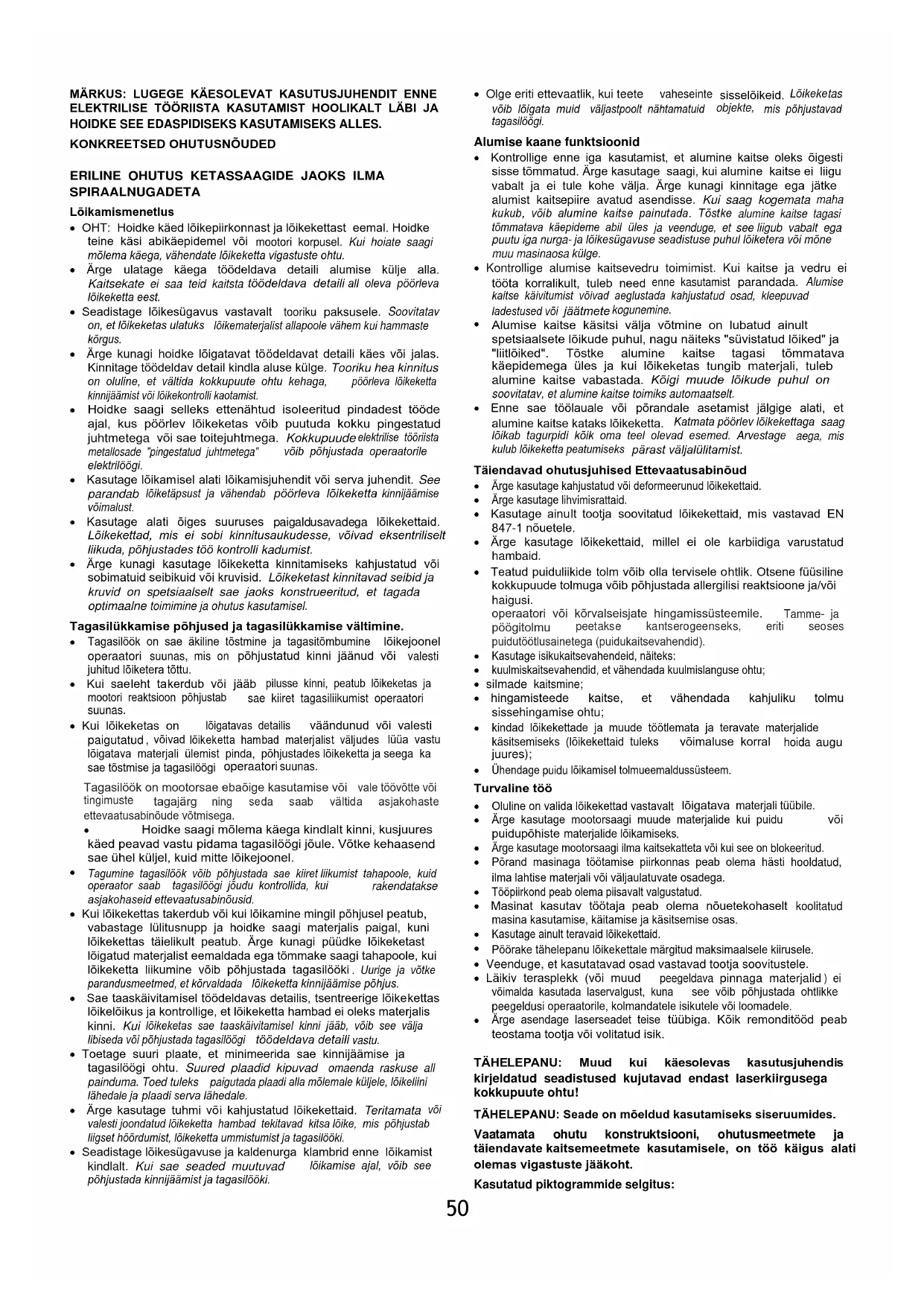 - OHT: Hoidke käed lõikepiirkonnast ja lõikekettast eemal. Hoidke teine käsi abikäepidemel või mootori korpusel. Kui hoiate saagi mõlema käega, vähendate lõikeketta vigastuste ohtu.
