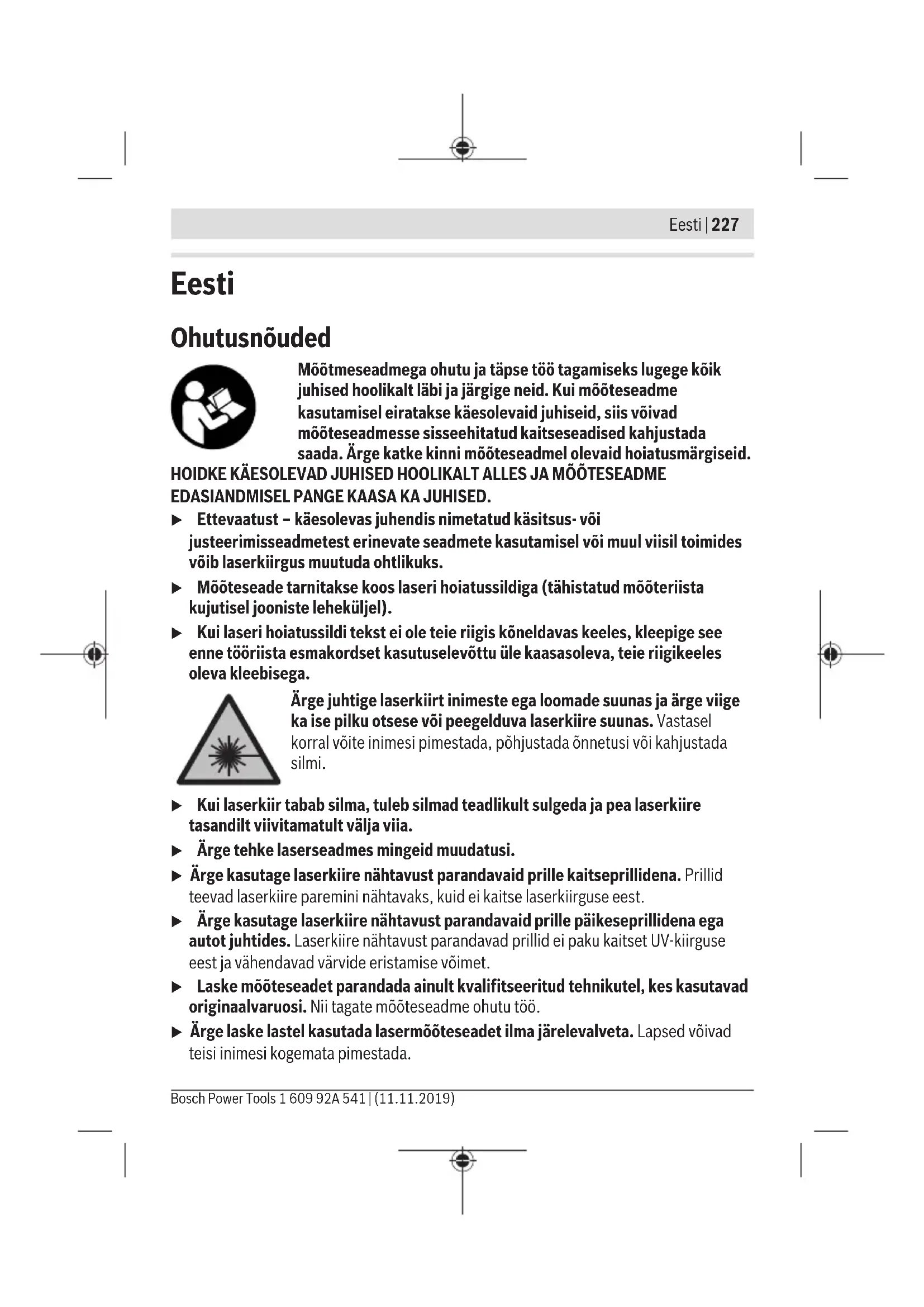 temperatuuril 20–25°C C) kehtib kahes ristumispunktis ja vastaskülgedel D) Näidatud väärtused eeldavad normaalseid kuni soodsaid keskkonnatingimusi (nt vibratsiooni, udu, suitsu, otsese päikesekiirguse puudumine). Suurte temperatuurikõikumiste järel võib tekkida täpsushälbeid. E) Esineb ainult mittejuhtiv määrdumine, mis võib aga ajutiselt kondensatsiooni tõttu juhtivaks muutuda. Teie mõõteseadme ühetähenduslikuks identimiseks kasutatakse tüübisildil olevat seerianumbrit (13). Paigaldamine Patareide paigaldamine/vahetamine Mõõteriistas on soovitatav kasutada leelis-mangaan-patareisid. Patareipesa kaane (11) avamiseks vajutage fiksaatorit (10) ja võtke patareipesa kaas ära. Pange patareid sisse. Järgige sealjuures patareipesa siseküljel toodud kujutisele vastavat õiget polaarsust. Kui patareid on tühjad, süttib olekunäit (3) punaselt ja laserkiired lülitatakse välja. Lülitage mõõteriist välja ja vahetage patareid. Vahetage alati kõik patareid korraga. Kasutage ainult ühe tootja ja ühesuguse mahtuvusega patareisid. u Kui te mõõteseadet pikemat aega ei kasuta, võtke patareid välja. Patareid võivad pikemal mõõteseadmes hoidmisel korrodeeruda ja iseeneslikult tühjeneda. Töö Seadme kasutuselevõtt u Kaitske mõõteriista niiskuse ja otsese päikesekiirguse eest. 1 609 92A 541 | (11.11.2019) Bosch Power ToolsEesti | 231 u Ärge jätke mõõteriista äärmuslike temperatuuride ja temperatuurikõikumiste kätte. Ärge jätke seda nt pikemaks ajaks autosse. Suurte temperatuurikõikumiste korral laske mõõteriistal enne kasutuselevõtmist esmalt keskkonnatemperatuuriga kohaneda. Äärmuslike temperatuuride või temperatuurikõikumiste korral võib mõõteriista täpsus väheneda. u Vältige tugevaid lööke või mõõteseadme kukkumist. Kahjustused võivad mõjutada mõõteseadme täpsust. Võrrelge pärast tugevat lööki või kukkumist laserjoont kontrolliks mõne tuntud horisontaalse või vertikaalse laserjoonega. u Transpordi ajaks lülitage mõõteseade välja. Väljalülitamisel lukustatakse pendlisõlm, mida järsud liigutused võiksid kahjustada. Sisse-/väljalülitamine Mõõteriista sisselülitamiseks lükake sisse-/väljalüliti (4) asendisse „ON“. Mõõteriist saadab kohe pärast sisselülitamist eesmisest ja ülemisest väljumisavast (6) välja laserjooned. u Ärge suunake laserkiirt inimestele ja loomadele ning ärge vaadake ise laserkiirt ka suure vahemaa tagant. Mõõteriista väljalülitamiseks lükake sisse-/väljalüliti (4) asendisse OFF. Väljalülitamisel pendlisõlm lukustatakse. u Ärge jätke sisselülitatud mõõteseadet järelevalveta ja lülitage mõõteseade pärast kasutamist välja. Laserkiir võib teisi inimesi pimestada. Töörežiimid Mõõteriistal on mitu töörežiimi, mida võite igal ajal vahetada: – ristjoonrežiim (vt jn A): moodustab horisontaalse lasertasandi (360° pöörlev laserjoon) ja vertikaalse laserjoone ettesuunas, – ristjoon- ja loodipunktirežiim (vt jn B): moodustab horisontaalse lasertasandi (360° pöörlev laserjoon), kaks vertikaalset ristuvat laserjoont ja loodipunkti alla, – horisontaalrežiim (vt jn C): moodustab horisontaalse lasertasandi (360° pöörlev laserjoon). Pärast sisselülitamist on mõõteseade automaatse nivelleerumisega ristjoonrežiimis. Töörežiimi vahetamiseks vajutage laseri töörežiimi nuppu Mode(1). Kõik töörežiimid on võimalikud nii nivelleerimisautomaatikaga kui ka kaldefunktsiooniga. Bosch Power Tools 1 609 92A 541 | (11.11.2019)232 | Eesti Nivelleerimisautomaatika Nivelleerimisautomaatikaga (vtjooniseidE−G) Nivelleerimisautomaatikaga töötamisel ei tohi olekunäit (3) põleda. Lülitage vajaduse korral kaldefunktsiooni nuppu (2) vajutades nivelleerimisautomaatika jälle sisse, nii et olekunäit kustub. Asetage mõõteriist horisontaalsele kindlale aluspinnale või kinnitage statiivile(7). Nivelleerimisautomaatika korrigeerib automaatselt ebatasasused isenivelleerumispiirkonnas ±4°. Nivelleerimine on lõpetatud, kui laseri jooned enam ei liigu. Kui automaatne nivelleerimine ei ole võimalik, kuna nt mõõteriista tugipind erineb horisontaalpinnast rohkem kui 4°, hakkavad laserkiired vilkuma. Sellisel juhul seadke mõõteriist horisontaalseks ja oodake ära automaatne nivelleerimine. Niipea kui mõõteriist on isenivelleerumispiirkonnas ±4°, põlevad laserkiired pidevalt. Väljaspool isenivelleerumispiirkonda ±4° ei ole nivelleerimisautomaatikaga töötamine võimalik, sest sel juhul ei ole tagatud laserkiirte nivelleerimistäpsus ega täisnurk laserjoonte vahel. Raputuste või asendimuutuste korral töö ajal nivelleeritakse mõõteseade automaatselt uuesti. Kontrollige mõõteriista nihkumisest tingitud vigade vältimiseks uue nivelleerumise järel horisontaalse või vertikaalse laserjoone asendit võrdluspunktide suhtes. Kaldefunktsiooniga töötamine (vt jn H) Kaldefunktsiooniga töötamiseks vajutage kaldefunktsiooni nuppu (2). Kaldefunktsioonis põleb olekunäit (3) roheliselt. Kaldefunktsiooniga töötamisel on nivelleerimisautomaatika välja lülitatud. Mõõteriista võite vabalt käes hoida või kaldu olevale alusele asetada. Laserkiiri enam ei nivelleerita ja nad ei pea enam omavahel tingimata ristuma. Töösuunised u Kasutage märgistamiseks alati ainult laserpunkti või laserjoone keskpunkti. Laserpunkti suurus või laserjoone laius muutuvad kauguse suurenedes. Töötamine statiiviga (lisavarustus) Statiiv pakub stabiilset, reguleeritava kõrgusega mõõtmisalust. Asetage mõõteseade statiivi kinnituskohaga 1/4" (9) statiivi (7) või standardse fotostatiivi keermele. Kinnitage mõõteseade statiivi kinnituskruvi abil. Enne mõõteseadme sisselülitamist joondage statiiv esialgselt. 1 609 92A 541 | (11.11.2019) Bosch Power ToolsEesti | 233 Laseri prillid (lisavarustus) Laseri prillid filtreerivad keskkonnavalgustust. Laseri valgus tundub seetõttu silmale heledam. u Ärge kasutage laserkiire nähtavust parandavaid prille