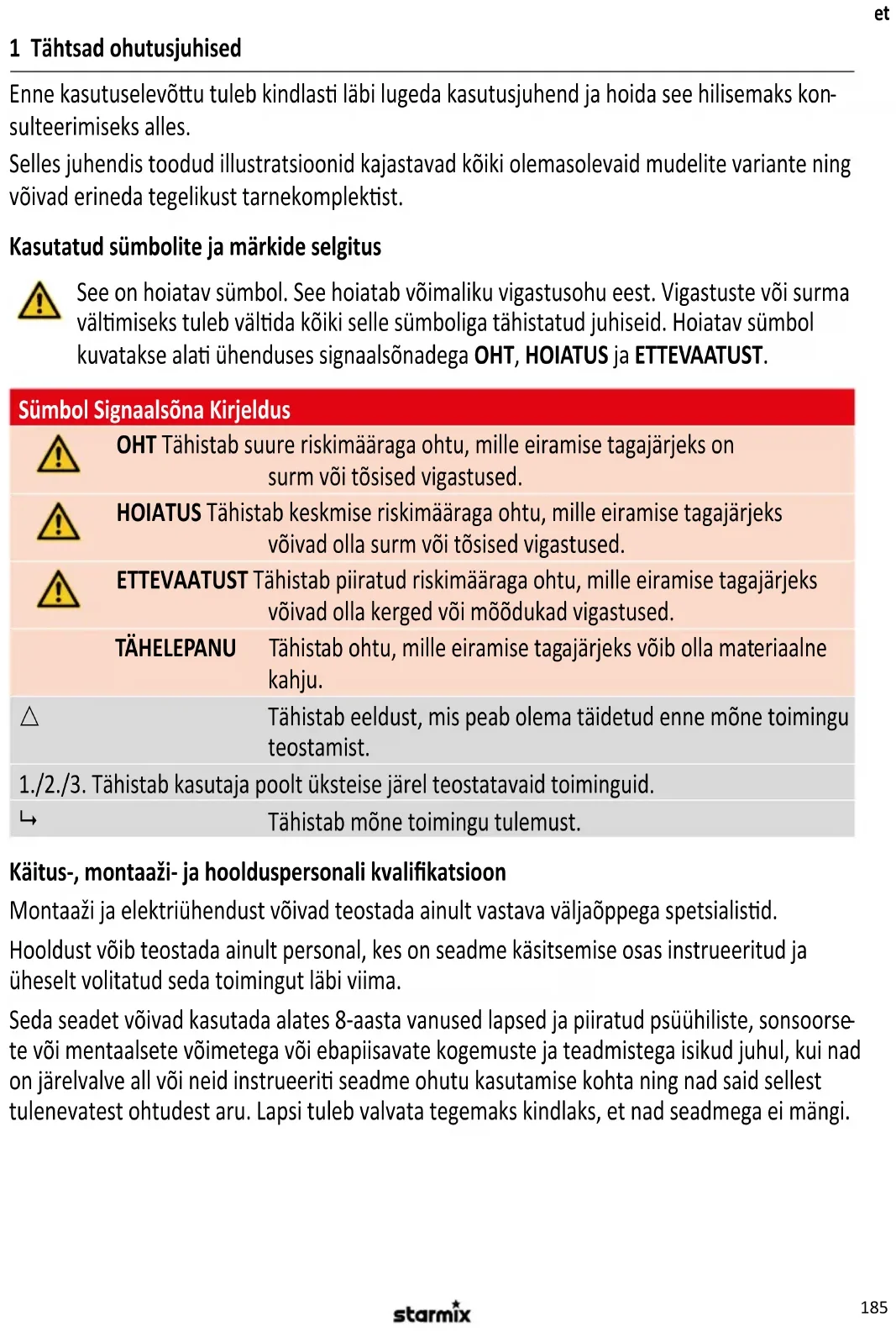 Tähistab mõne toimingu tulemust. Käitus-, montaaži- ja hoolduspersonali kvalikatsioon Montaaži ja elektriühendust võivad teostada ainult vastava väljaõppega spetsialisd. Hooldust võib teostada ainult personal, kes on seadme käsitsemise osas instrueeritud ja üheselt volitatud seda toimingut läbi viima. Seda seadet võivad kasutada alates 8-aasta vanused lapsed ja piiratud psüühiliste, sonsoorse