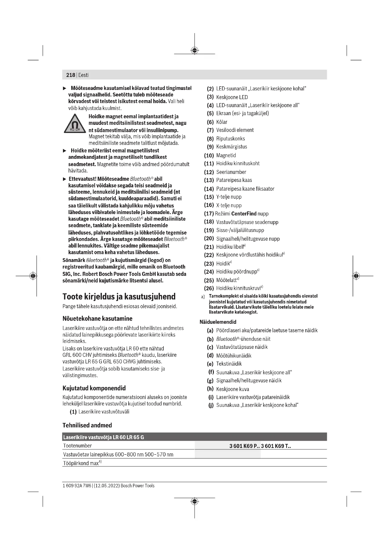 Tarnekomplekt ei sisalda kõiki kasutusjuhendis olevatel joonistel kujutatud või kasutusjuhendis nimetatud lisatarvikuid. Lisatarvikute täieliku loetelu leiate meie lisatarvikute kataloogist. Näiduelemendid (a) Pöördlaseri aku/patareide laetuse taseme näidik (b) Bluetooth®-ühenduse näit (c) Vastuvõtutäpsuse näidik (d) Mõõtühikunäidik (e) Tekstinäidik (f) Suunakuva „Laserikiir keskjoone all“ (g) Signaalheli/helitugevuse näidik (h) Keskjoone kuva (i) Laserikiire vastuvõtja patareinäidik (j) Suunakuva „Laserikiir keskjoone kohal“ Tehnilised andmed Laserikiire vastuvõtja LR60 LR 65G Tootenumber 3601K69P.. 3601K69T.. Vastuvõetav lainepikkus 600−800nm 500−570nm Tööpiirkond max