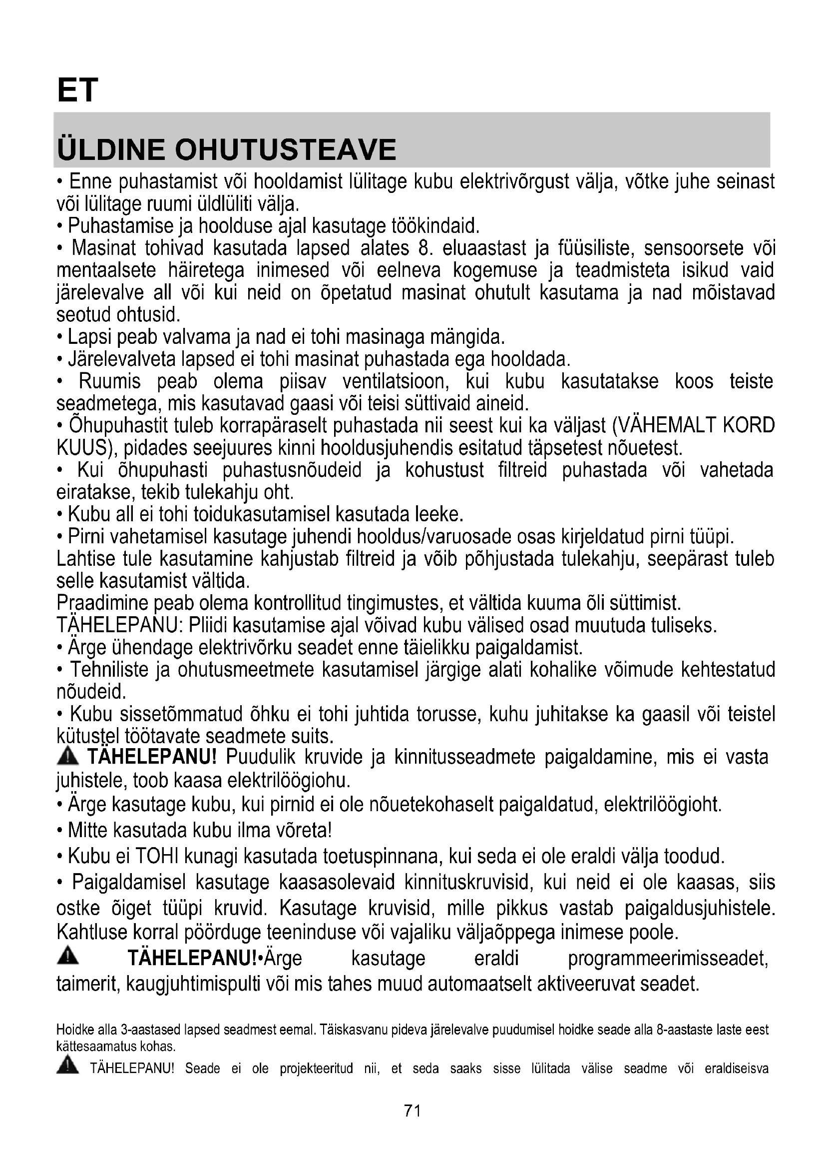 - Paigaldamisel kasutage kaasasolevaid kinnituskruvisid, kui neid ei ole kaasas, siis ostke õiget tüüpi kruvid. Kasutage kruvisid, mille pikkus vastab paigaldusjuhistele. Kahtluse korral pöörduge teeninduse või vajaliku väljaõppega inimese poole. TÄHELEPANU!•Ärge kasutage eraldi programmeerimisseadet, taimerit, kaugjuhtimispulti või mis tahes muud automaatselt aktiveeruvat seadet. Hoidke alla 3-aastased lapsed seadmest eemal. Täiskasvanu pideva järelevalve puudumisel hoidke seade alla 8-aastaste laste eest kättesaamatus kohas. TÄHELEPANU! Seade ei ole projekteeritud nii, et seda saaks sisse lülitada välise seadme või eraldiseisva72 kaugjuhtimissüsteemiga. Seadme kasutamine ei eelda eriväljaõpet. Ärge kasutage seadet õues. Vigastuste vältimiseks peaks seadet teisaldama ja paigaldama vähemalt kahekesi. Seadme peaks paigaldama, sh looma vajaduse korral vee- (kui see on ettenähtud) ja elektriühenduse ning tegema parandustöid sobiva väljaõppega tehnik. Kui seade on paigaldatud, hoidke pakkematerjali (plastkotid, vahtplast jne) lastele kättesaamatus kohas, sest need võivad kaasa tuua lämbumisohu. . Ärge kasutage seadet märgade kätega ega paljajalu. Keelatud on kasutada seadet auruga puhastamiseks – elektrilöögioht. Pakkematerjal on 100% taaskasutatav ja märgistatud taaskasutamise sümboliga