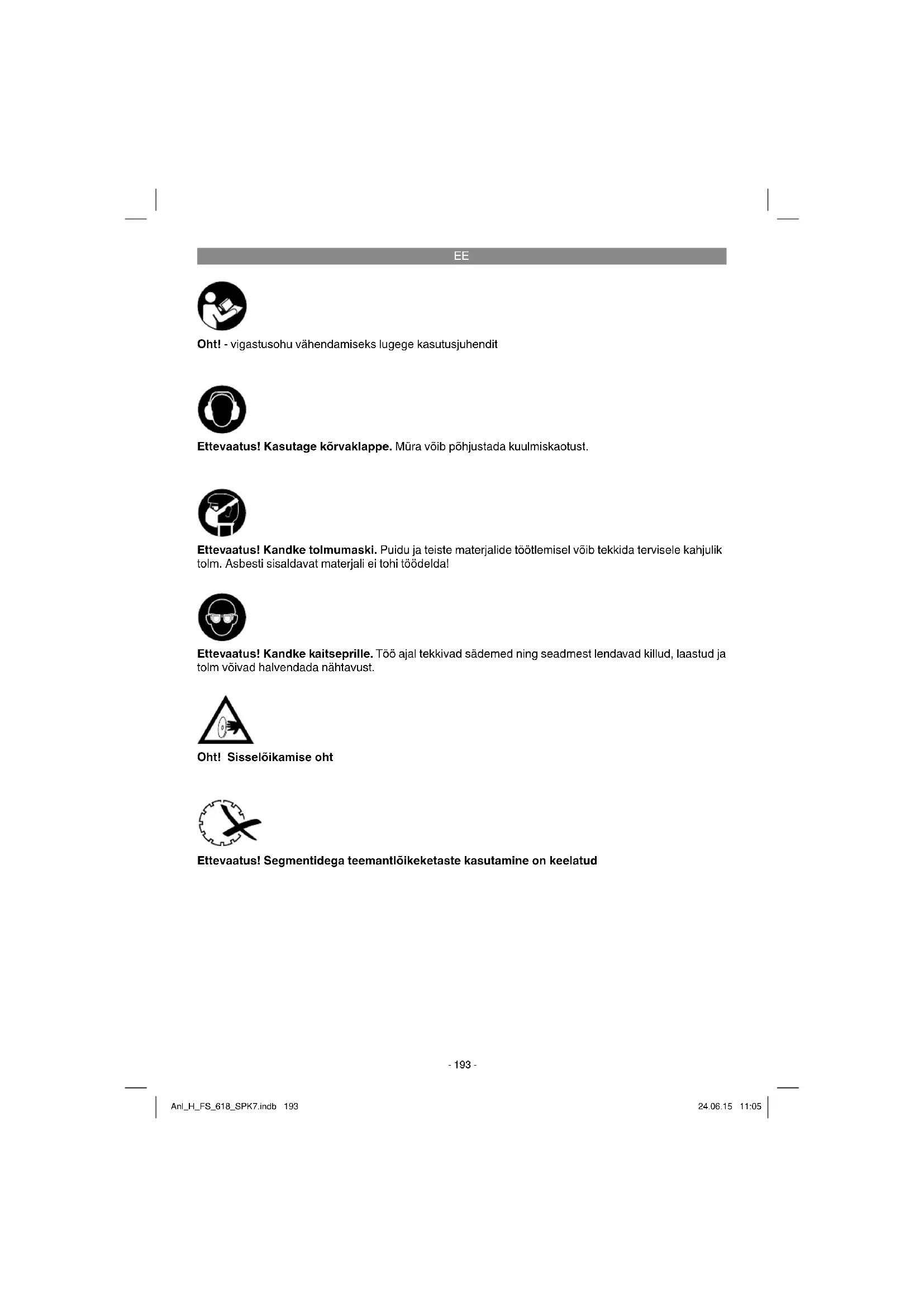 Oht! Sisselõikamise oht Ettevaatus! Segmentidega teemantlõikeketaste kasutamine on keelatud Oht! - vigastusohu vähendamiseks lugege kasutusjuhendit Ettevaatus! Kasutage kõrvaklappe. Müra võib põhjustada kuulmiskaotust. Ettevaatus! Kandke kaitseprille. Töö ajal tekkivad sädemed ning seadmest lendavad killud, laastud ja tolm võivad halvendada nähtavust. Ettevaatus! Kandke tolmumaski. Puidu ja teiste materjalide töötlemisel võib tekkida tervisele kahjulik tolm. Asbesti sisaldavat materjali ei tohi töödelda! Anl_H_FS_618_SPK7.indb 193Anl_H_FS_618_SPK7.indb 193 24.06.15 11:0524.06.15 11:05EE
