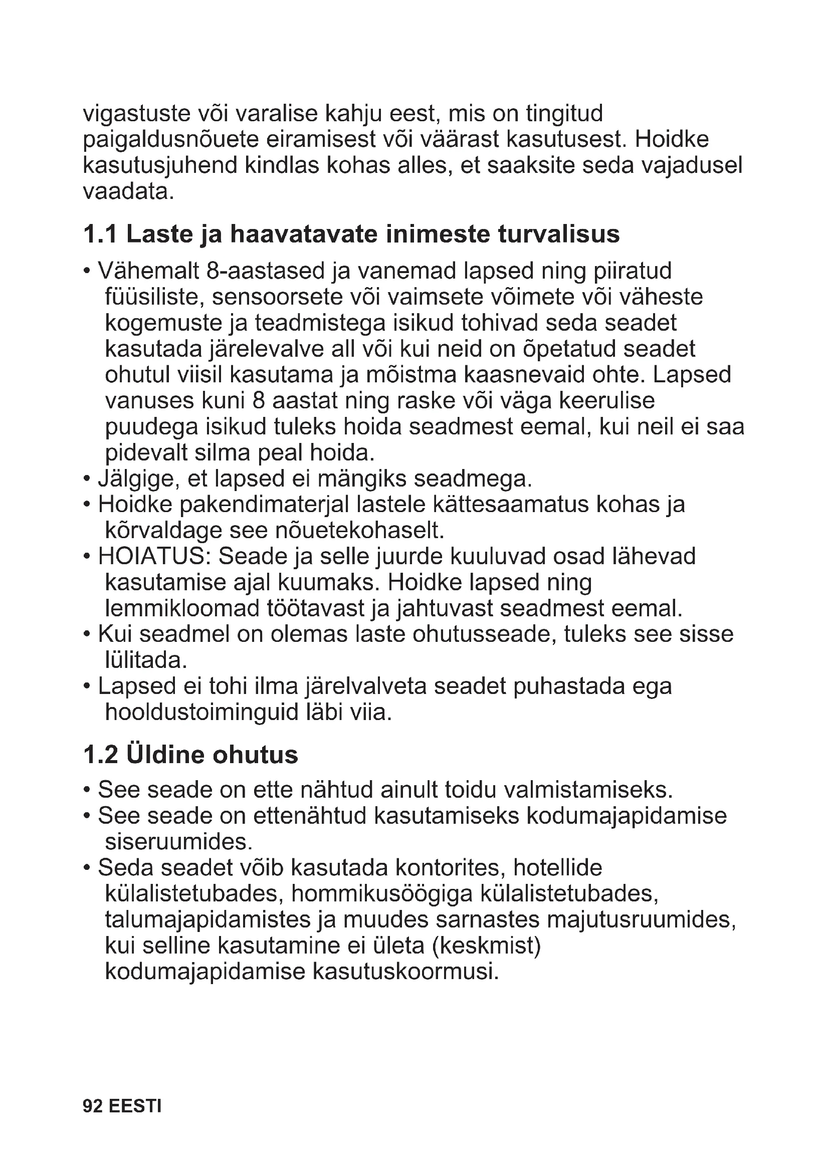 - Vähemalt 8-aastased ja vanemad lapsed ning piiratud füüsiliste, sensoorsete või vaimsete võimete või väheste kogemuste ja teadmistega isikud tohivad seda seadet kasutada järelevalve all või kui neid on õpetatud seadet ohutul viisil kasutama ja mõistma kaasnevaid ohte. Lapsed vanuses kuni 8 aastat ning raske või väga keerulise puudega isikud tuleks hoida seadmest eemal, kui neil ei saa pidevalt silma peal hoida.