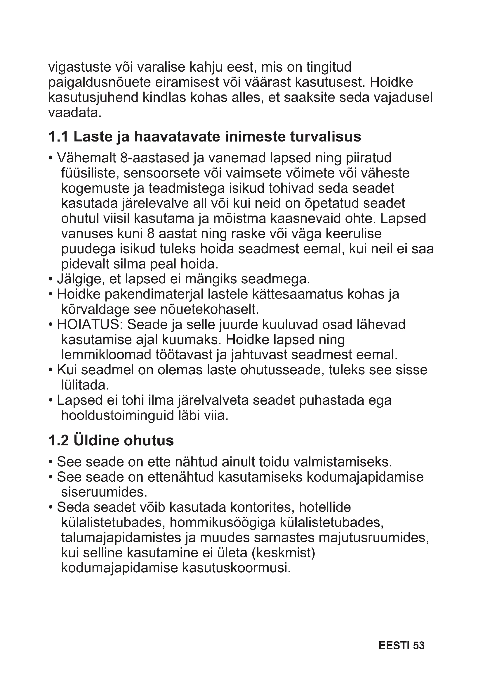 - Vähemalt 8-aastased ja vanemad lapsed ning piiratud füüsiliste, sensoorsete või vaimsete võimete või väheste kogemuste ja teadmistega isikud tohivad seda seadet kasutada järelevalve all või kui neid on õpetatud seadet ohutul viisil kasutama ja mõistma kaasnevaid ohte. Lapsed vanuses kuni 8 aastat ning raske või väga keerulise puudega isikud tuleks hoida seadmest eemal, kui neil ei saa pidevalt silma peal hoida.