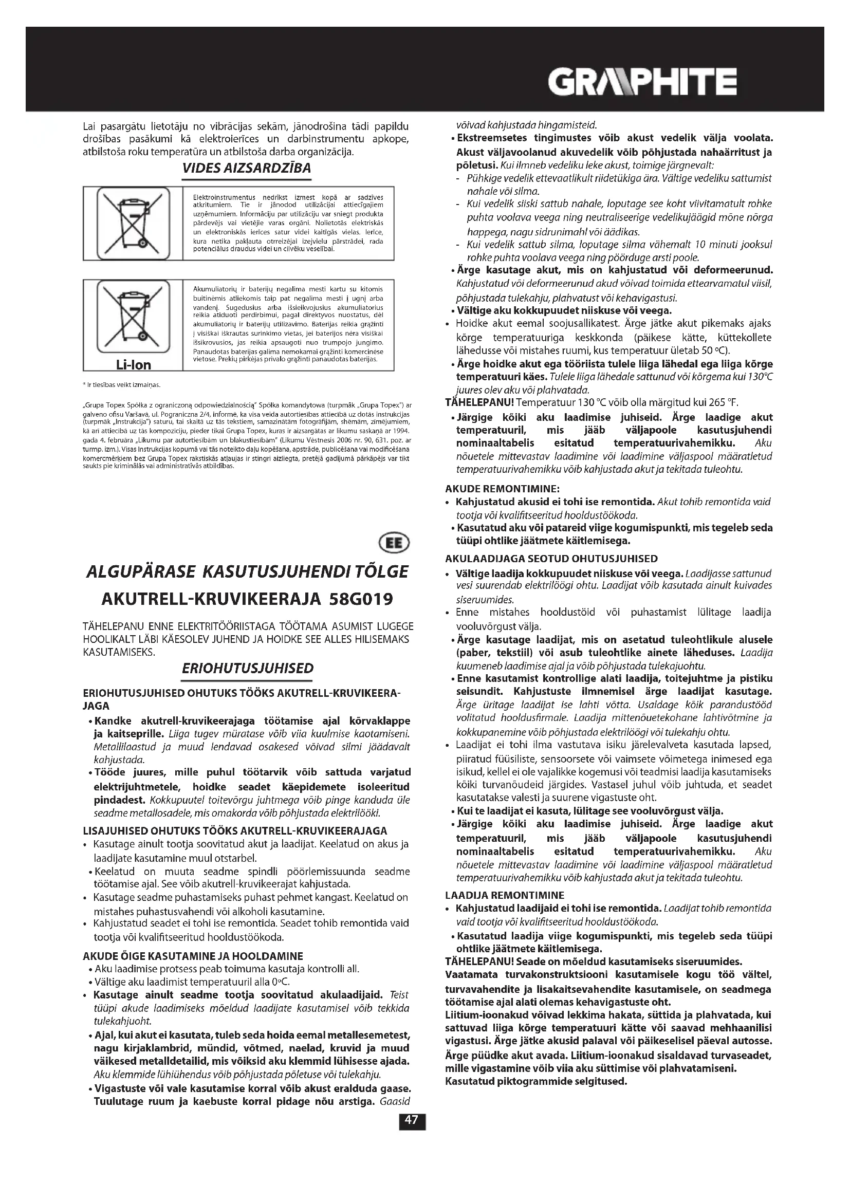 võib kasutada seadmete võrdlemiseks ja üldise vibratsioonitaseme esialgseks hindamiseks. Esitatud vibratsioonitase on piisavalt esinduslik tööriista tavakasutuse puhul. Kui seadet kasutatakse muul viisil või koos muude töötarvikutega, võib vibratsioonitase muutuda. Vibratsioonitaset võib tõsta ka seadme ebapiisav või liiga harv hooldamine. Ülaltoodud põhjused võivad suurendada kokkupuudet vibratsiooniga kogu tööaja vältel. Vibratsiooniga kokkupuute põhjalikuks hindamiseks tuleb arvesse võtta ka ajavahemikke, mil tööriist on välja lülitatud või on sisse lülitatud, aga seda ei kasutata töö tegemiseks. Nii võib kõiki tegureid põhjalikult arvesse võttes olla vibratsiooniga kokkupuute koguväärtus märgatavalt väiksem. Seadmega töötaja kaitsmiseks vibratsiooni mõju eest tuleb võtta täiendavaid ohutusmeetmeid, nagu tööriista ja töötarvikute regulaarne hooldamine, käte õige temperatuuri tagamine, sobiv töökorraldus. KESKKONNAKAITSE Ärge visake elektriseadmeid olmeprügi hulka, viige need käitlemiseks vastavasse asutusse. Infot toote utiliseerimise kohta annab müüja või kohalik omavalitsus. Kasutatud elektrilised ja elektroonilised seadmed sisaldavad keskkonnale ohtlikke aineid. Ümbertöötlemata seade kujutab endast ohtu keskkonnale ja inimeste tervisele. Li-Ion Ärge pange akut / patareisid olmejäätmete hulka ega visake neid tulle ega vette. Kahjustatud või kulunud akud tuleb nõuetekohaselt utiliseerida kooskõlas kehtiva akude ja patareide utiliseerimise direktiiviga. Patareid tuleks tagasi laadida kogumiskohtadesse täielikult tühjenenud, kui akud pole täielikult tühjenenud, tuleb neid kaitsta lühiste eest. Kasutatud patareisid saab kaubanduslikes kohtades tasuta tagastada. Kauba ostja on kohustatud kasutatud patareid tagastama.