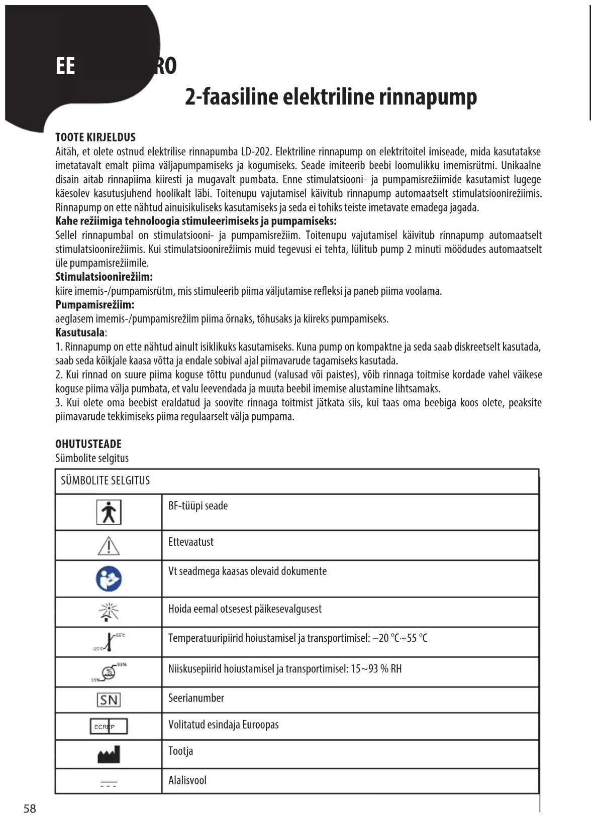 2-faasiline elektriline rinnapump TOOTE KIRJELDUS Aitäh, et olete ostnud elektrilise rinnapumba LD-202. Elektriline rinnapump on elektritoitel imiseade, mida kasutatakse imetatavalt emalt piima väljapumpamiseks ja kogumiseks. Seade imiteerib beebi loomulikku imemisrütmi. Unikaalne disain aitab rinnapiima kiiresti ja mugavalt pumbata. Enne stimulatsiooni- ja pumpamisrežiimide kasutamist lugege käesolev kasutusjuhend hoolikalt läbi. Toitenupu vajutamisel käivitub rinnapump automaatselt stimulatsioonirežiimis. Rinnapump on ette nähtud ainuisikuliseks kasutamiseks ja seda ei tohiks teiste imetavate emadega jagada. Kahe režiimiga tehnoloogia stimuleerimiseks ja pumpamiseks: Sellel rinnapumbal on stimulatsiooni- ja pumpamisrežiim. Toitenupu vajutamisel käivitub rinnapump automaatselt stimulatsioonirežiimis. Kui stimulatsioonirežiimis muid tegevusi ei tehta, lülitub pump 2 minuti möödudes automaatselt üle pumpamisrežiimile. Stimulatsioonirežiim: kiire imemis-/pumpamisrütm, mis stimuleerib piima väljutamise reeksi ja paneb piima voolama. Pumpamisrežiim: aeglasem imemis-/pumpamisrežiim piima õrnaks, tõhusaks ja kiireks pumpamiseks. Kasutusala: