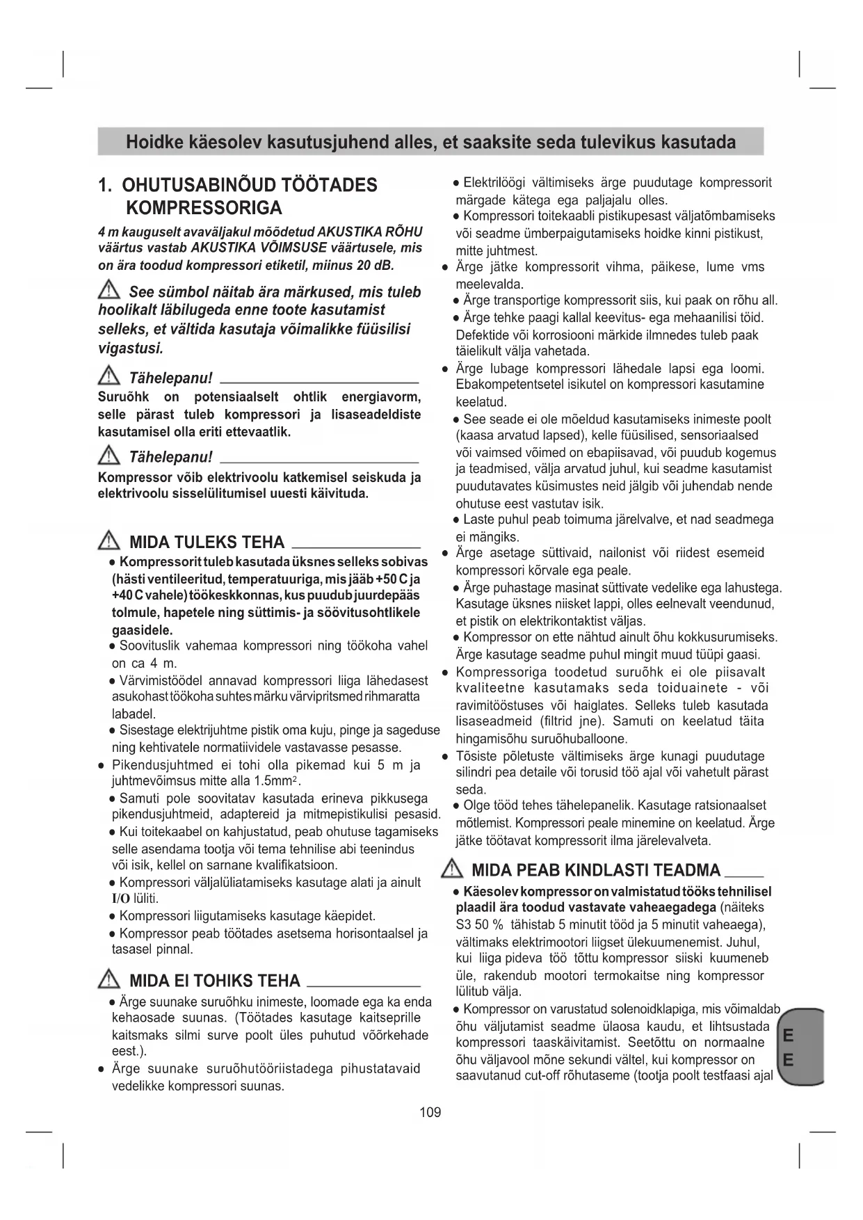 KOMPRESSORIGA 4 m kauguselt avaväljakul mõõdetud AKUSTIKA RÕHU väärtus vastab AKUSTIKA VÕIMSUSE väärtusele, mis on ära toodud kompressori etiketil, miinus 20 dB. See sümbol näitab ära märkused, mis tuleb hoolikalt läbilugeda enne toote kasutamist selleks, et vältida kasutaja võimalikke füüsilisi vigastusi. Tähelepanu! Suruõhk on potensiaalselt ohtlik energiavorm, selle pärast tuleb kompressori ja lisaseadeldiste kasutamisel olla eriti ettevaatlik. Tähelepanu! Kompressor võib elektrivoolu katkemisel seiskuda ja elektrivoolu sisselülitumisel uuesti käivituda.