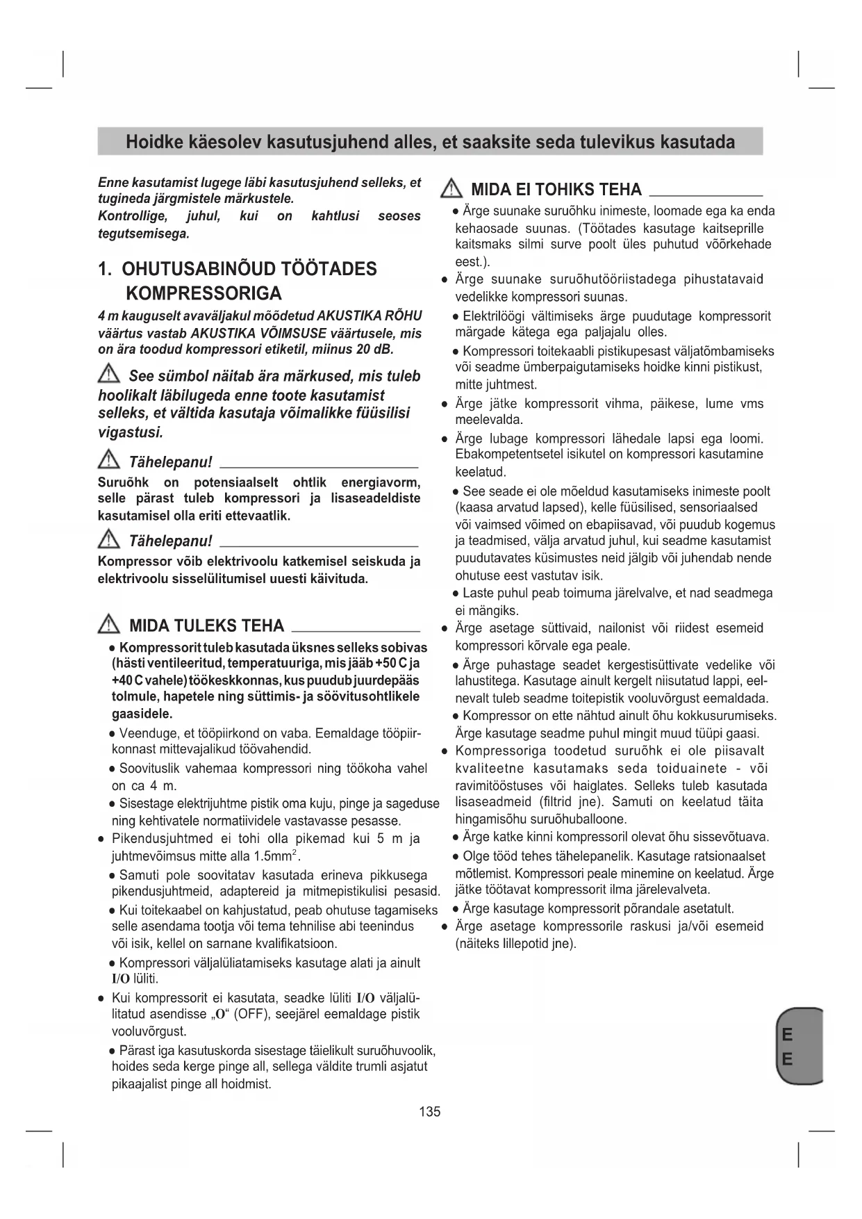 KOMPRESSORIGA 4 m kauguselt avaväljakul mõõdetud AKUSTIKA RÕHU väärtus vastab AKUSTIKA VÕIMSUSE väärtusele, mis on ära toodud kompressori etiketil, miinus 20 dB. See sümbol näitab ära märkused, mis tuleb hoolikalt läbilugeda enne toote kasutamist selleks, et vältida kasutaja võimalikke füüsilisi vigastusi. Tähelepanu! Suruõhk on potensiaalselt ohtlik energiavorm, selle pärast tuleb kompressori ja lisaseadeldiste kasutamisel olla eriti ettevaatlik. Tähelepanu! Kompressor võib elektrivoolu katkemisel seiskuda ja elektrivoolu sisselülitumisel uuesti käivituda.
