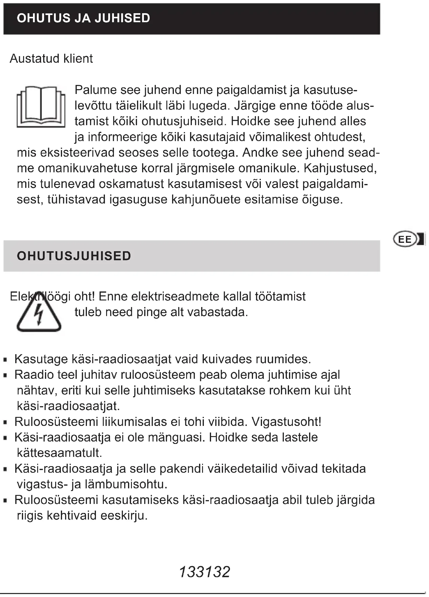 Austatud klient Palume see juhend enne paigaldamist ja kasutuse- levõttu täielikult läbi lugeda Järgige enne tööde alus- tamist kõiki ohutusjuhiseid Hoidke see juhend alles ja informeerige kõiki kasutajaid võimalikest ohtudest, mis eksisteerivad seoses selle tootega Andke see juhend sead- me omanikuvahetuse korral järgmisele omanikule Kahjustused, mis tulenevad oskamatust kasutamisest või valest paigaldami- sest, tühistavad igasuguse kahjunõuete esitamise õiguse OHUTUSJUHISED Elektrilöögi oht! Enne elektriseadmete kallal töötamist tuleb need pinge alt vabastada Kasutage käsi-raadiosaatjat vaid kuivades ruumides Raadio teel juhitav ruloosüsteem peab olema juhtimise ajal nähtav, eriti kui selle juhtimiseks kasutatakse rohkem kui üht käsi-raadiosaatjat Ruloosüsteemi liikumisalas ei tohi viibida Vigastusoht! Käsi-raadiosaatja ei ole mänguasi Hoidke seda lastele kättesaamatult Käsi-raadiosaatja ja selle pakendi väikedetailid võivad tekitada vigastus- ja lämbumisohtu Ruloosüsteemi kasutamiseks käsi-raadiosaatja abil tuleb järgida riigis kehtivaid eeskirju134 Patareisid tohib vahetada üksnes sama tüüpi patareide vastu: LR03 / AAA Ärge liikuge torumootoriga üle lõppasendite Kahjustuste oht!