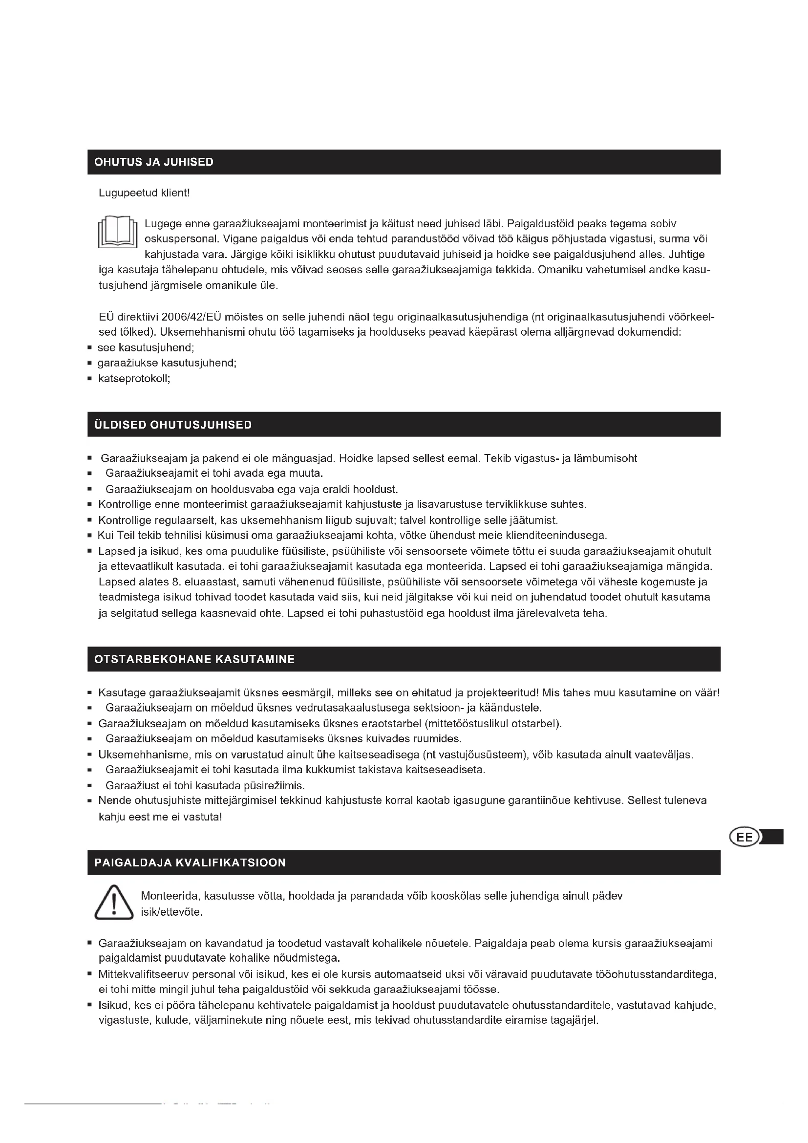 Lugupeetud klient! Lugege enne garaažiukseajami monteerimist ja käitust need juhised läbi. Paigaldustöid peaks tegema sobiv oskuspersonal. Vigane paigaldus või enda tehtud parandustööd võivad töö käigus põhjustada vigastusi, surma või kahjustada vara Järgige kõiki isiklikku ohutust puudutavaid juhiseid ja hoidke see paigaldusjuhend alles Juhtige iga kasutaja tähelepanu ohtudele, mis võivad seoses selle garaažiukseajamiga tekkida. Omaniku vahetumisel andke kasu- tusjuhend järgmisele omanikule üle EÜ direktiivi 2006/42/EÜ mõistes on selle juhendi näol tegu originaalkasutusjuhendiga (nt originaalkasutusjuhendi võõrkeel- sed tõlked). Uksemehhanismi ohutu töö tagamiseks ja hoolduseks peavad käepärast olema alljärgnevad dokumendid: see kasutusjuhend; garaažiukse kasutusjuhend; katseprotokoll; ÜLDISED OHUTUSJUHISED Garaažiukseajam ja pakend ei ole mänguasjad. Hoidke lapsed sellest eemal. Tekib vigastus- ja lämbumisoht Garaažiukseajamit ei tohi avada ega muuta. Garaažiukseajam on hooldusvaba ega vaja eraldi hooldust. Kontrollige enne monteerimist garaažiukseajamit kahjustuste ja lisavarustuse terviklikkuse suhtes. Kontrollige regulaarselt, kas uksemehhanism liigub sujuvalt; talvel kontrollige selle jäätumist. Kui Teil tekib tehnilisi küsimusi oma garaažiukseajami kohta, võtke ühendust meie klienditeenindusega. Lapsed ja isikud, kes oma puudulike füüsiliste, psüühiliste või sensoorsete võimete tõttu ei suuda garaažiukseajamit ohutult ja ettevaatlikult kasutada, ei tohi garaažiukseajamit kasutada ega monteerida. Lapsed ei tohi garaažiukseajamiga mängida. Lapsed alates 8 eluaastast, samuti vähenenud füüsiliste, psüühiliste või sensoorsete võimetega või väheste kogemuste ja teadmistega isikud tohivad toodet kasutada vaid siis, kui neid jälgitakse või kui neid on juhendatud toodet ohutult kasutama ja selgitatud sellega kaasnevaid ohte. Lapsed ei tohi puhastustöid ega hooldust ilma järelevalveta teha. OTSTARBEKOHANE KASUTAMINE Kasutage garaažiukseajamit üksnes eesmärgil, milleks see on ehitatud ja projekteeritud! Mis tahes muu kasutamine on väär! Garaažiukseajam on mõeldud üksnes vedrutasakaalustusega sektsioon- ja käändustele. Garaažiukseajam on mõeldud kasutamiseks üksnes eraotstarbel (mittetööstuslikul otstarbel). Garaažiukseajam on mõeldud kasutamiseks üksnes kuivades ruumides. Uksemehhanisme, mis on varustatud ainult ühe kaitseseadisega (nt vastujõusüsteem), võib kasutada ainult vaateväljas. Garaažiukseajamit ei tohi kasutada ilma kukkumist takistava kaitseseadiseta. Garaažiust ei tohi kasutada püsirežiimis. Nende ohutusjuhiste mittejärgimisel tekkinud kahjustuste korral kaotab igasugune garantiinõue kehtivuse Sellest tuleneva kahju eest me ei vastuta! PAIGALDAJA KVALIFIKATSIOON Monteerida, kasutusse võtta, hooldada ja parandada võib kooskõlas selle juhendiga ainult pädev isik/ettevõte Garaažiukseajam on kavandatud ja toodetud vastavalt kohalikele nõuetele. Paigaldaja peab olema kursis garaažiukseajami paigaldamist puudutavate kohalike nõudmistega Mittekvalitseeruv personal või isikud, kes ei ole kursis automaatseid uksi või väravaid puudutavate tööohutusstandarditega, ei tohi mitte mingil juhul teha paigaldustöid või sekkuda garaažiukseajami töösse. Isikud, kes ei pööra tähelepanu kehtivatele paigaldamist ja hooldust puudutavatele ohutusstandarditele, vastutavad kahjude, vigastuste, kulude, väljaminekute ning nõuete eest, mis tekivad ohutusstandardite eiramise tagajärjel154 155 ENNE MONTEERIMIST Garaažiukseajam ei ole mõeldud raskestikäivate uste käitamiseks. Kontrollige, kas uks on käega kergesti avatav ja suletav. Kontrollige, kas tasakaalustusvedrud on õigesti tasakaalustatud. Selleks tõstke uks umbes ühe meetri võrra üles ja laske seejärel lahti Selles asendis ei tohi uks liikuda alla ega üles Garaažiukse tasakaalustusvedrusid võib uuesti seada ainult pädev isik. Garaaži lagi peab garaažimehhanismi monteerimiseks sobima. Kontrollida tuleb täiendavate kinnitusdetailide vajadust