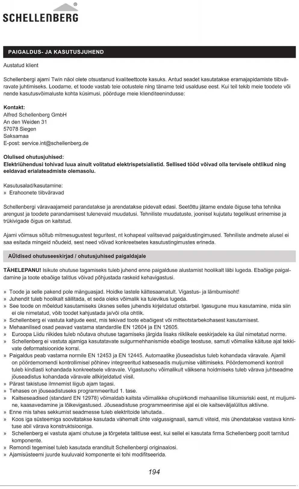 » Paigaldaja peab esitama kogu teabe süsteemi hädaolukorras käsitsi käitamise kohta ning süsteemi käitajale toote juurde kuuluva paigaldusjuhendi üle andma. » Ei lapsed ega täiskasvanud ei tohi käitamise ajal viibida väravaseadme vahetus läheduses. » Raadiojuhtimisseadmed ja kõik muud impulsisaatjad peavad asuma lastele kättesaamatus kohas, et vältida ajami juhus- likku käivitamist. » Väravatiibade vahelt tohib läbi minna/sõita alles siis, kui need on täielikult avanenud. » Kasutaja ei tohi teostada ajamil mingeid remonditöid ega seadet omavoliliselt muuta. Selleks pöörduge alati kvalitseeri- tud spetsialistide poole. » Kasutatud patareisid ei tohi visata olmejäätmete hulka! Patareid tuleb viia kauplustes olevatesse kogumiskastidesse. » Kõik toimingud, mida selles juhendis ei ole ette nähtud, on keelatud. » Väravaseadet ei tohi kasutusele võtta enne, kui on kindlaks tehtud, et see vastab kõigile kohalduvatele EÜ direktiividele. Paigalduseelne kontrollimine Selleks et tagada ajami nõutav ohutus ja tõrkevaba käitamine, tuleb kontrollida järgmisi eelduseid: » Elektroonilise juhtseadme korpus tuleb paigaldada ajamitest nii kaugele, et mootori kaablit ei tuleks mitte mingil juhul pikendada. » Müüritis- või betoonpostidel kasutamse korral soovitame liimtüübleid ja seguarmatuure, mis kindlustavad pingevaba kinnituse. » Värav peab ajamiga sobima. Eelkõige tuleb tagada see, et värav oleks piisavalt tugev ja jäik. Metallväravate korral soovitame luua ühenduse ajamiga otse kruvide abil. Puitväravate korral tuleb sise- ja väliskülje kinnituskruvid kinnitada metallplaadile, vastasel korral lõdvenevad kinnitused aja jooksul. » Mõõtmed ja kaalud peavad vastama tehnilistele andmetele. » Kontrollige tiibade tõrgeteta ja ühtlast liikumist, st kogu liikumise ajal ei tohi tekkida hõõrdumisi ega takistusi. » Jälgige, et liigendid oleksid laitmatus seisukorras. » Asendis „Värav kinni“ peavad olema mehaanilised piirajad. » Olemasolevad lukud ja riivid tuleb eemaldada. Sepistööd on soovitatav teha enne ajami paigaldamist. » Pidage silmas, et olenevalt avamisnurgast peab värava liikumisteel olema piisavalt vaba ruumi. Pärast paigaldamist » Liikuvate väravatiibade vahelt ei tohi läbi liikuda. Enne väravatiibade vahelt läbi liikumist peavad need olema täielikult avanenud. » Väravatiibade vahel viibimine on rangelt keelatud. » Väravaseadme vahetus lähedal viibimine ning selle juures esemete ladustamine on keelatud. See kehtib ka käitamise ajal. » Seetõttu ei tohi väravatiibade liikumist sihilikult takistada. » Oksad ja põõsad ei tohi automaatse väravaseadme käitamist takistada. » Väravatiibu tohib käsitsi liigutada alles siis, kui avariivabastus on rakendatud (vabastatud). » Enne mis tahes sekkumist seadmesse tuleb elektriline toitepinge lahutada. » Talitlusrikete korral tuleb väravatiivad riivistusest vabastada, et võimaldada läbi värava liikumist. Seejärel tuleb ära ooda- ta kvalitseeritud spetsialistide saabumine. » Soovitame vähemalt üks kord iga poole aasta järel lasta väravasüsteemi, kaitseseadiseid ja tarvikuid spetsialistidel kontrollida. » Talverežiimi abil (lk 199) tagate laitmatu talitluse talvekuude jooksul.196 Garantiitingimused Austatud klient; täname teid SCHELLENBERGI toote kasuks otsustamise eest. Kõiki SCHELLENBERGi tooteid kontrollitakse SCHELLENBERGi kvaliteedikontrolli raames. Seetõttu garanteerime, et meie tooted on materjali- ja tootmisvigadeta. Garantii alal ei kuulu kahjustused, mis on tekkinud järgmistel põhjustel: » kasutamisest tulenev normaalne kulumine » asjatundmatu paigaldus, ühendamine, kasutamine ja käsitsemine » vääramatu jõud või muud välised mõjud » asjatundmatu hooldus või remont kolmandate isikute poolt » kolmandate isikute poolt tehtud tehnilised muudatused Garantiijuhtumi korral me oma äranägemisel kas remondime toote või vahetame selle samaväärse SCHELLENBERGi toote vastu. Remonditud ja asendatud toote garantiiaeg ei pikene. Käesolev tootja garantii ei puuduta seadusest tulenevaid garan- tiinõudeid, millele teil kui tarbijal võib olla õigus kehtivate seaduste järgi, kaasa arvatud spetsiaalsed tarbijakaitsemäärused. Garantii ei välista ega piira seadusest tulenevaid garantiisid. Garantii eelduseks on originaalostutšeki esitamine. Kui saa- date meile toote, pange sellega alati kaasa originaalostutšekk ja tekkinud vea kirjeldus. Ajami Twin 300 garantiiperiood on 24 kuud alates ostukuupäevast. Garantiijuhtumi korral, varuosade tellimisel või küsimuste tekkimisel toote paigalduse koha pöörduge meie klienditeenindusse. Teie SCHELLENBERGi meeskond aitab teid alati meeleldi. Seadmete saatmise aadress: Alfred Schellenberg GmbH Endverbraucher-Service An den Weiden 31 D-57078 Siegen Klienditeenindus: e-post: service.int@schellenberg.de Soovime teile tootest palju rõõmu. Teie SCHELLENBERGi meeskond197 (vastavalt EÜ masinadirektiivile 2006/42/EÜ, lisa II, punkt 1 A) Käesolevaga kinnitame meie, Tootja: Alfred Schellenberg GmbH An den Weiden 31 57078 Siegen Tegevjuht: Sascha Schellenberg et järgnevalt nimetatdu toode: Pöördvärava ajam TWIN 300 vastab oma konstruktsiooni ja ehituse poolest meie poolt turustataval kujul kohalduvatele peamistele ohutus- ja tervisekait- senõuetele, mis sisalduvad järgnevates EÜ/EL-i direktiivides/määrustes: EL-i elektromagnetilise taluvuse direktiiv 2014/30/EL EL-i direktiiv RED 2014/53/EL EÜ masinadirektiiv 2006/42/EÜ EL-i direktiiv RoHS 2011/65/EL EÜ direktiiv WEEE 2012/19/EÜ Kasutatud ja kohaldatud normid ja spetsikatsioonid: EN 301489-1, EN 301489-3, EN 300220-1, EN 300220-2, EN 60335-1, EN 60335-2, EN 62233, EN 12453, EN 12445 Märkus: Lõpptoote või selle kombinatsiooni kasutuselevõtmine on ettevõtte Alfred Schellenberg GmbH poolt keelatud, kuni pole kindlaks tehtud lõpptoote või selle kombinatsiooni vastavus nimetatud pöördvärava ajami ja väravaga, vastavalt kohal- duv
