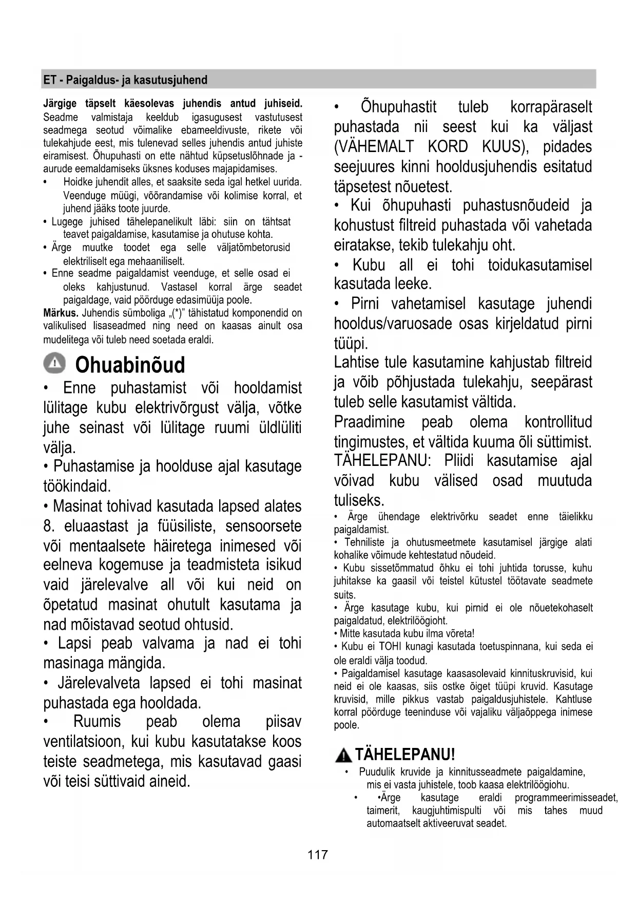 - Kui õhupuhasti puhastusnõudeid ja kohustust filtreid puhastada või vahetada eiratakse, tekib tulekahju oht.