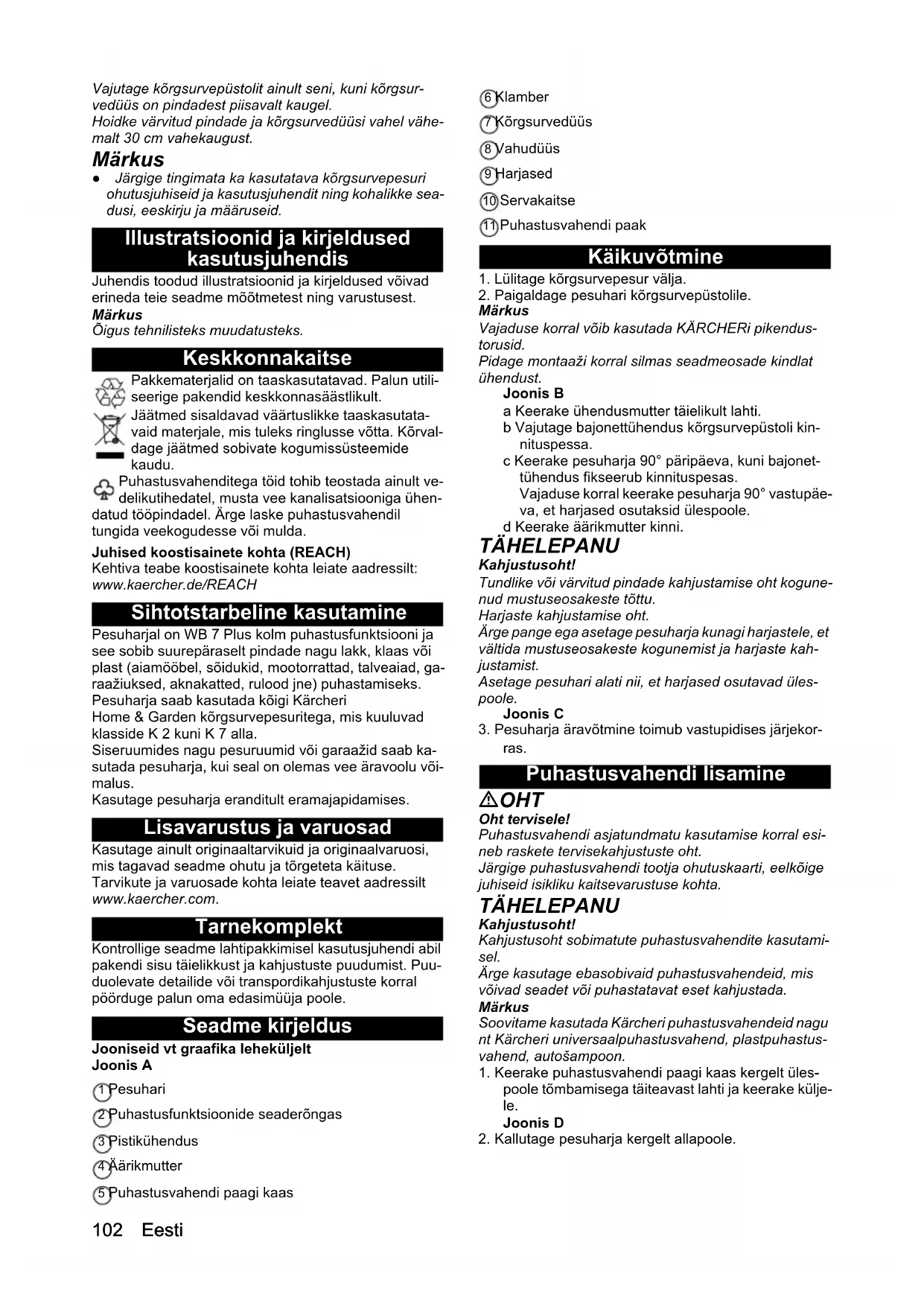 -близкия оторизиран сервиз, като представите касовата бележка. (Адрес, вж. задната страна) Sisukord Üldised juhised Enne seadme esmakordset kasutamist lugege läbi see algupärane kasutusju- hend ning Kärcheri kõrgsurvepesuri ka- sutusjuhend ja ohutusjuhised, millega seadet kasutama hakatakse. Toimige sellele vastavalt. Hoidke kõik brošüürid hilisemaks kasutamiseks või järg- mise omaniku tarbeks alles. Ohutusjuhised 몇 ETTEVAATUS ● Ärge võtke seadet käiku, kui seadme läheduses on teisi inimesi või loomi. ● Lülitage pärast puhastustööde lõpetamist kõrgsurve- pesur välja ja lahutage seade kõrgsurvepüstolist en- ne seadme kontrollimist või hooldamist. ● Vigastusoht tagasilöögi tõttu. Hoolitsege kindla sei- suasendi eest ja hoidke kõrgsurvepüstolist hästi kin- ni. ● Maksimaalne lubatud veetemperatuur on 60°C. TÄHELEPANU Kahjustusoht! Kahjustusoht kõrgsurvedüüsi liiga väikese vahekaugu- se tõttu. От дюзата за пяна не излиза или излиза твърде малко почистваща пяна. Пръстенът за настройка на функции за почистване не е завъртян на положение “Почистваща пяна”.