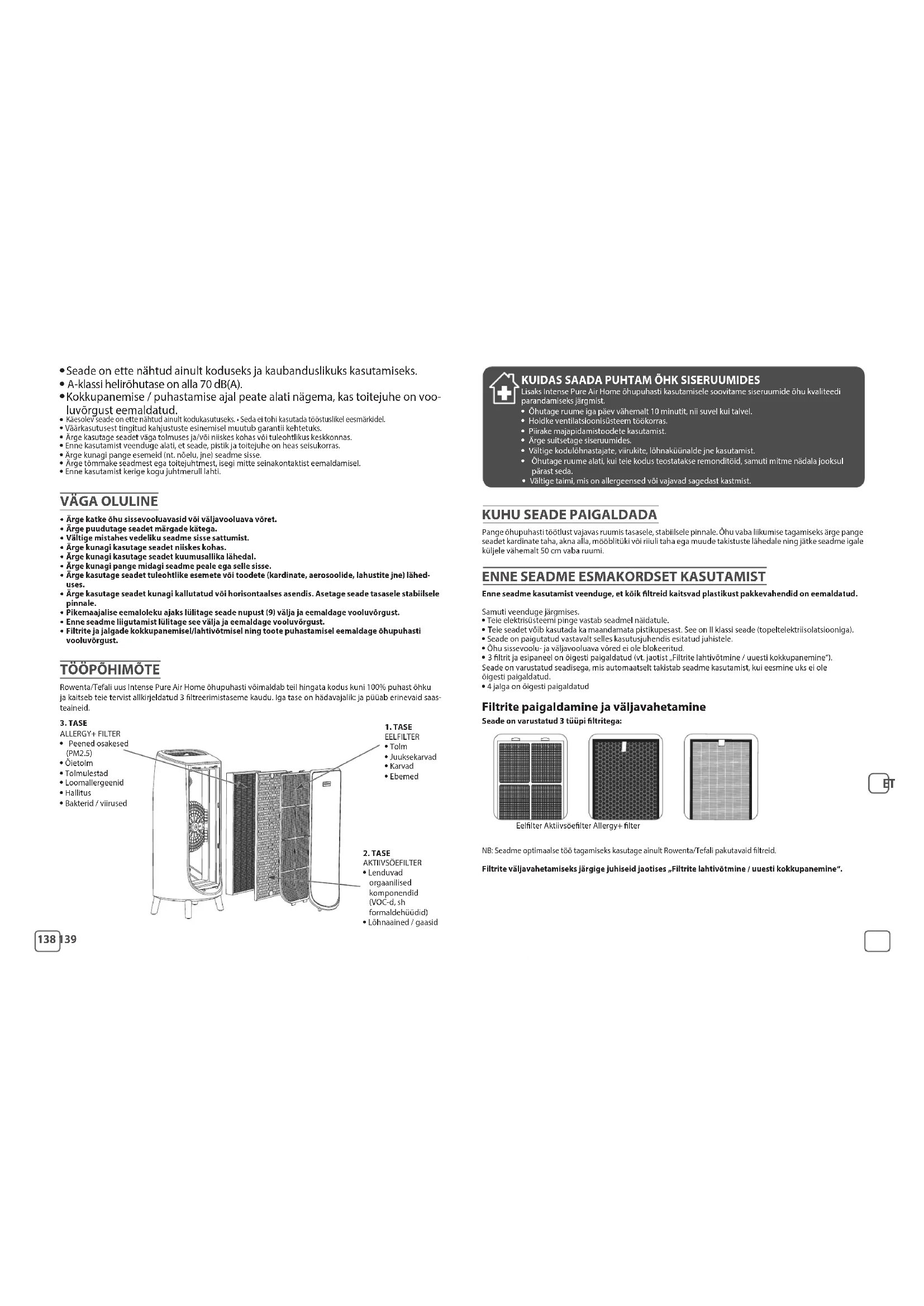 - 4 jalga on õigesti paigaldatud Filtrite paigaldamine ja väljavahetamine Seade on varustatud 3 tüüpi ltritega: Eellter Aktiivsöelter Allergy+ lter NB: Seadme optimaalse töö tagamiseks kasutage ainult Rowenta/Tefali pakutavaid ltreid. Filtrite väljavahetamiseks järgige juhiseid jaotises „Filtrite lahtivõtmine / uuesti kokkupanemine“.