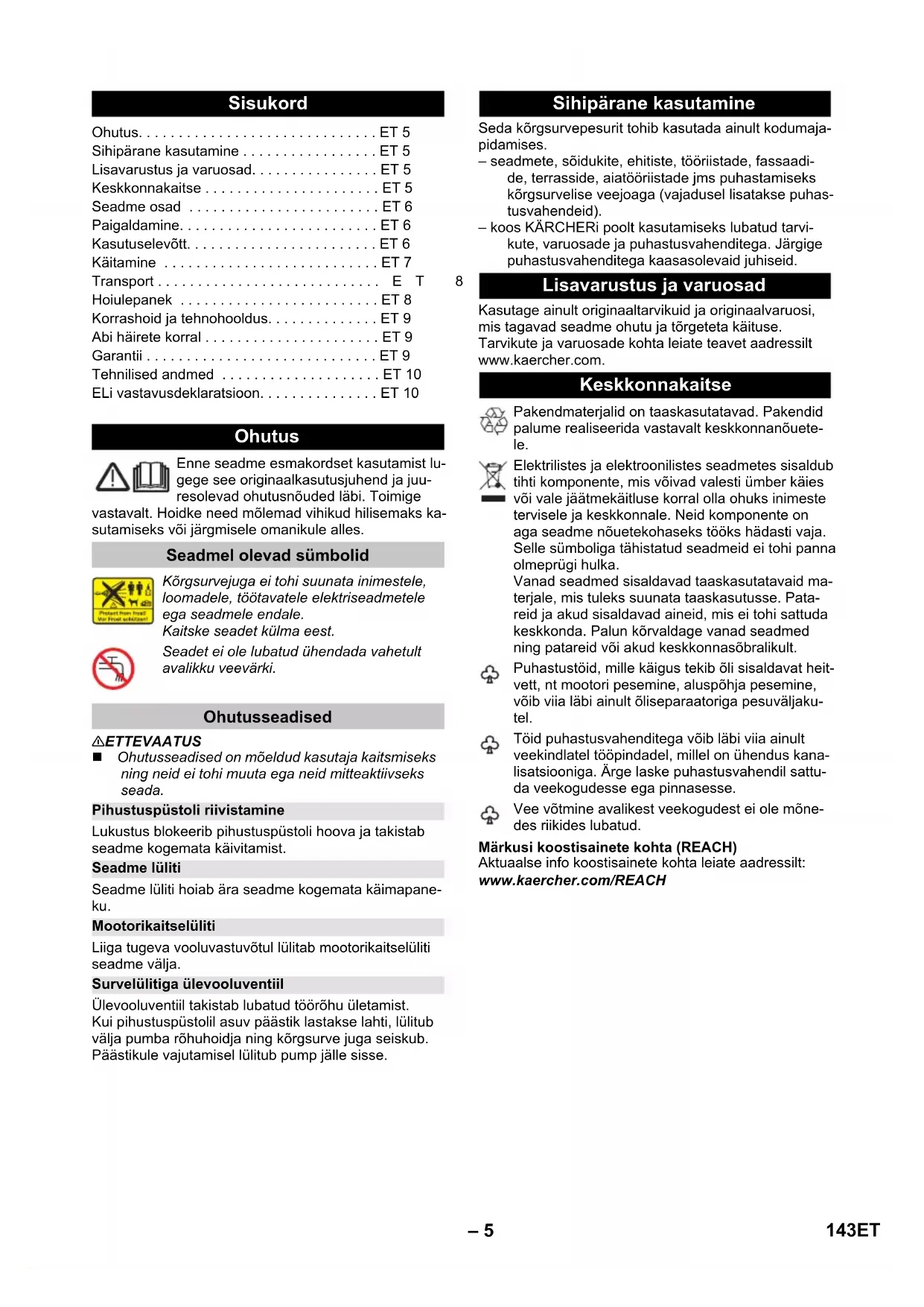 EN 60335–1 EN 60335–2–79 EN 62233: 2008 EN 55014–1: 2017 + A11: 2020 EN 55014–2: 2015 EN 61000–3–2: 2014 EN 61000–3–11: 2000 EN IEC 63000: 2018 Приложен метод за оценка на съответствието: 2000/14/ЕО: Приложение V ниво на шум dB(A) Измерено: 92 Гарантирано: 95 Winnenden, 2021/06/01 Chairman of the Board of Management Director Regulatory Affairs & Certification 142 BG– 5 Enne seadme esmakordset kasutamist lu- gege see originaalkasutusjuhend ja juu- resolevad ohutusnõuded läbi. Toimige vastavalt. Hoidke need mõlemad vihikud hilisemaks ka- sutamiseks või järgmisele omanikule alles. 몇 ETTEVAATUS Ohutusseadised on mõeldud kasutaja kaitsmiseks ning neid ei tohi muuta ega neid mitteaktiivseks seada. Lukustus blokeerib pihustuspüstoli hoova ja takistab seadme kogemata käivitamist. Seadme lüliti hoiab ära seadme kogemata käimapane- ku. Liiga tugeva vooluvastuvõtul lülitab mootorikaitselüliti seadme välja. Ülevooluventiil takistab lubatud töörõhu ületamist. Kui pihustuspüstolil asuv päästik lastakse lahti, lülitub välja pumba rõhuhoidja ning kõrgsurve juga seiskub. Päästikule vajutamisel lülitub pump jälle sisse. Seda kõrgsurvepesurit tohib kasutada ainult kodumaja- pidamises. – seadmete, sõidukite, ehitiste, tööriistade, fassaadi- de, terrasside, aiatööriistade jms puhastamiseks kõrgsurvelise veejoaga (vajadusel lisatakse puhas- tusvahendeid). – koos KÄRCHERi poolt kasutamiseks lubatud tarvi- kute, varuosade ja puhastusvahenditega. Järgige puhastusvahenditega kaasasolevaid juhiseid. Kasutage ainult originaaltarvikuid ja originaalvaruosi, mis tagavad seadme ohutu ja tõrgeteta käituse. Tarvikute ja varuosade kohta leiate teavet aadressilt www.kaercher.com. Märkusi koostisainete kohta (REACH) Aktuaalse info koostisainete kohta leiate aadressilt: www.kaercher.com/REACH Sisukord Ohutus. . . . . . . . . . . . . . . . . . . . . . . . . . . . . . ET 5 Sihipärane kasutamine . . . . . . . . . . . . . . . . . ET 5 Lisavarustus ja varuosad. . . . . . . . . . . . . . . . ET 5 Keskkonnakaitse . . . . . . . . . . . . . . . . . . . . . . ET 5 Seadme osad . . . . . . . . . . . . . . . . . . . . . . . . ET 6 Paigaldamine. . . . . . . . . . . . . . . . . . . . . . . . . ET 6 Kasutuselevõtt. . . . . . . . . . . . . . . . . . . . . . . . ET 6 Käitamine . . . . . . . . . . . . . . . . . . . . . . . . . . . ET 7 Transport . . . . . . . . . . . . . . . . . . . . . . . . . . . .ET 8 Hoiulepanek . . . . . . . . . . . . . . . . . . . . . . . . . ET 8 Korrashoid ja tehnohooldus. . . . . . . . . . . . . . ET 9 Abi häirete korral . . . . . . . . . . . . . . . . . . . . . . ET 9 Garantii . . . . . . . . . . . . . . . . . . . . . . . . . . . . . ET 9 Tehnilised andmed . . . . . . . . . . . . . . . . . . . . ET 10 ELi vastavusdeklaratsioon. . . . . . . . . . . . . . . ET 10 Ohutus Seadmel olevad sümbolid Kõrgsurvejuga ei tohi suunata inimestele, loomadele, töötavatele elektriseadmetele ega seadmele endale. Kaitske seadet külma eest. Seadet ei ole lubatud ühendada vahetult avalikku veevärki. Ohutusseadised Pihustuspüstoli riivistamine Seadme lüliti Mootorikaitselüliti Survelülitiga ülevooluventiil Sihipärane kasutamine Lisavarustus ja varuosad Keskkonnakaitse Pakendmaterjalid on taaskasutatavad. Pakendid palume realiseerida vastavalt keskkonnanõuete- le. Elektrilistes ja elektroonilistes seadmetes sisaldub tihti komponente, mis võivad valesti ümber käies või vale jäätmekäitluse korral olla ohuks inimeste tervisele ja keskkonnale. Neid komponente on aga seadme nõuetekohaseks tööks hädasti vaja. Selle sümboliga tähistatud seadmeid ei tohi panna olmeprügi hulka. Vanad seadmed sisaldavad taaskasutatavaid ma- terjale, mis tuleks suunata taaskasutusse. Pata- reid ja akud sisaldavad aineid, mis ei tohi sattuda keskkonda. Palun kõrvaldage vanad seadmed ning patareid või akud keskkonnasõbralikult. Puhastustöid, mille käigus tekib õli sisaldavat heit- vett, nt mootori pesemine, aluspõhja pesemine, võib viia läbi ainult õliseparaatoriga pesuväljaku- tel. Töid puhastusvahenditega võib läbi viia ainult veekindlatel tööpindadel, millel on ühendus kana- lisatsiooniga. Ärge laske puhastusvahendil sattu- da veekogudesse ega pinnasesse. Vee võtmine avalikest veekogudest ei ole mõne- des riikides lubatud. 143ET– 6 Selle seadme tarnekomplekt on kujutatud pakendil. Kontrollige lahti pakkides paki sisu. Kui tarvikuid on puudu või transpordikahjustuste korral teatage palun kaupmehele. Joonised vt lk 2 1 Veevõtuliitmik, sisseehitatud sõelaga 2 Ühendusdetail veevõtuliitmikule 3 Kõrgsurvevooliku kiirühendus 4 Kõrgsurve-pesupüstoli hoiustamine 5 Seadme lüliti „0/VÄLJAS“ / „I/SEES“ 6 Puhastusvahendi doseerimisregulaator 7 Kõrgsurve-pesupüstoli hoiustamine 8 Transpordikäepide 9 Plug 'n' Clean puhastusvahendi pudel kaanega 10 Hoiukoht Plug 'n' Clean puhastusvahendi pudelile koos puhastusvahendi liitmikuga 11 Kõrgsurvevooliku hoiukoht 12 Joatoru hoiukoht 13 Konks toitekaabli hoidmiseks 14 Toitepistikuga toitekaabel 15 Transpordiratas 16 Kõrgsurve-pesupüstol 17 Pihustuspüstoli riivistamine 18 Klahv kõrgsurvevooliku lahutamiseks pihustuspüs- tolist 19 Kõrgsurvevoolik 20 Pritsetoru mustusefreesiga tugeva mustuse jaoks 21 Rõhu reguleerimisega joatoru (Vario Power) Kõige tavalisemateks puhastustöödeks Töörõhku saab sujuvalt suurendada „SOFT“ pealt„HARD“ peale. Töörõhu reguleerimiseks laske kõrgsurve-pesupüstoli hoob lahti ja keerake joatoru soovitud asendisse. Sobib puhastusvahendiga töötamiseks. Jooniseid vt volditavatelt lehekülgedelt! Paigaldage enne kasutuselevõttu seadmega kaasas olevad lahtised osad. Joonis Pange alumine hoidik õnarustesse ja lükake ette. Hoidik fikseerub kuuldavalt asendisse. Joonis Pange ülemine hoidik kohale ja suruge lõpuni alla. Joonis Suruge hoidekonks sisse ja laske asendisse fik- see