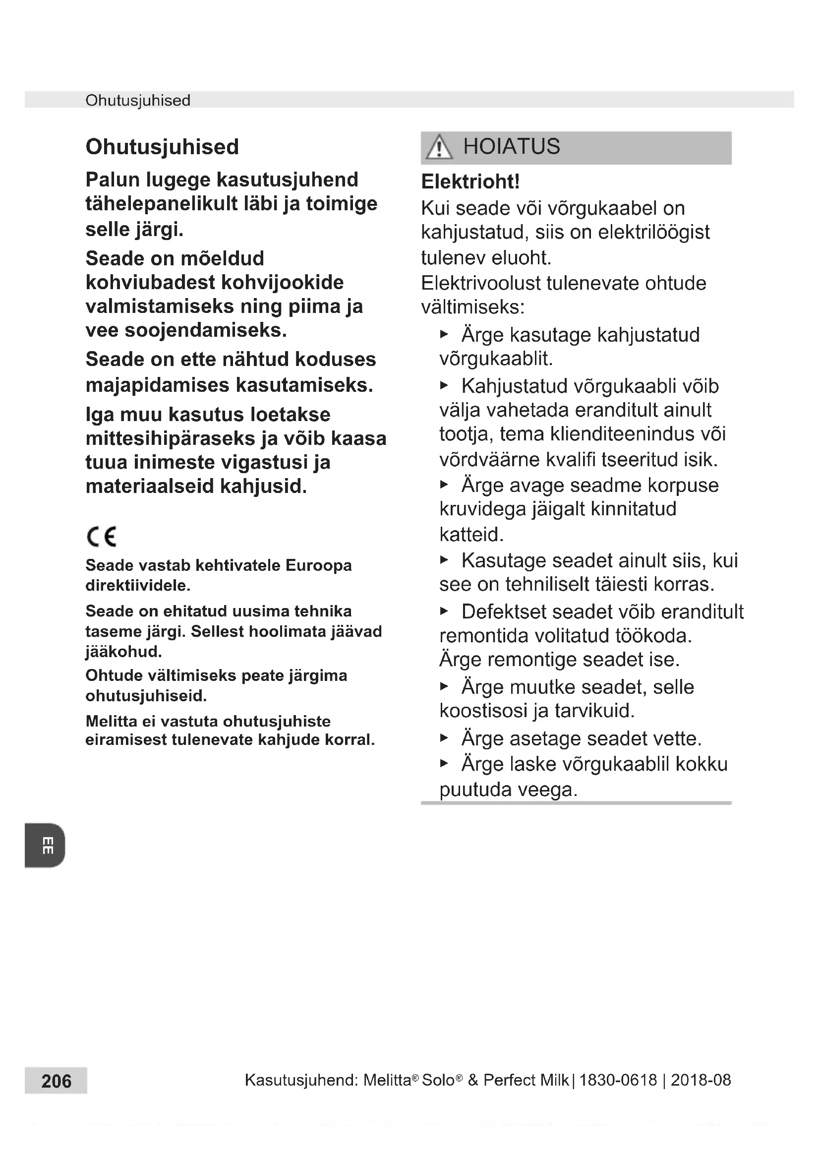 Ohutusjuhised Palun lugege kasutusjuhend tähelepanelikult läbi ja toimige selle järgi. Seade on mõeldud kohviubadest kohvijookide valmistamiseks ning piima ja vee soojendamiseks. Seade on ette nähtud koduses majapidamises kasutamiseks. Iga muu kasutus loetakse mittesihipäraseks ja võib kaasa tuua inimeste vigastusi ja materiaalseid kahjusid. Seade vastab kehtivatele Euroopa direktiividele. Seade on ehitatud uusima tehnika taseme järgi. Sellest hoolimata jäävad jääkohud. Ohtude vältimiseks peate järgima ohutusjuhiseid. Melitta ei vastuta ohutusjuhiste eiramisest tulenevate kahjude korral. HOIATUS Elektrioht! Kui seade või võrgukaabel on kahjustatud, siis on elektrilöögist tulenev eluoht. Elektrivoolust tulenevate ohtude vältimiseks: ▶ Ärge kasutage kahjustatud võrgukaablit. ▶ Kahjustatud võrgukaabli võib välja vahetada eranditult ainult tootja, tema klienditeenindus või võrdväärne kvalifi tseeritud isik. ▶ Ärge avage seadme korpuse kruvidega jäigalt kinnitatud katteid. ▶ Kasutage seadet ainult siis, kui see on tehniliselt täiesti korras. ▶ Defektset seadet võib eranditult remontida volitatud töökoda. Ärge remontige seadet ise. ▶ Ärge muutke seadet, selle koostisosi ja tarvikuid. ▶ Ärge asetage seadet vette. ▶ Ärge laske võrgukaablil kokku puutuda veega.Kasutusjuhend: Melitta