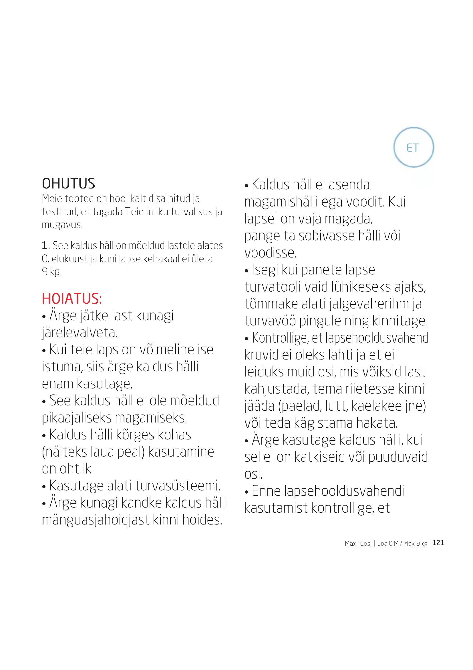 Maxi-Cosi järgida käesolevas kasutusjuhendis toodud juhiseid, teise tootega kasutamisest tekkinud kahjustused, selliste teenusepakkujate teenuste kasutamisest tekkinud kahjustused, kes ei ole meie poolt volitatud, või toote varastamise korral, kui mis tahes märgis või identifitseerimisnumber on tootelt eemaldatud või seda on muudetud. Normaalse kulumise alla kuulub rataste ja kanga kulumine tavakasutusel ning värvide ja materjalide loomulik kulumine pikaaegsel kasutamisel. Mida teha defektide korral: Probleemide või defektide ilmnemisel on kiire teeninduse saamiseks parim lahendus külastada teie volitatud turustajat või jaemüüjat. Nemad (1) aktsepteerivad meie 24-kuulist garantiid. Peate esitama ostudokumendi, mis on väljastatud kuni 24 kuud enne garantiiteenuse taotlemist. Kõige lihtsam on, kui kiidame teie garantiiteenuse taotluse eelnevalt heaks. Kui esitate garantiiperioodi ajal taotluse, võime paluda teil toote kooskõlas meie juhistega volitatud turustaja või jaemüüja juurde toimetada. Meie tasume toote transpordi- ja tagastamiskulud, kui olete juhiseid järginud. Kahjustused ja/ või defektid, millele meie garantii ega kliendi seaduslikud õigused ei laiene, ja/ või toodete kahjustused ja/või defektid, mida meie garantii ei kata, saab kõrvaldada mõistliku tasu eest. Kliendi õigused: Kliendil on seaduslikud õigused kooskõlas tarbijakaitseseadustega, mis võivad riigiti erineda. Kliendi õigusi, mis on kooskõlas kehtivate riiklikke seadustega, see garantii ei mõjuta. (1) Jaemüüjatelt või edasimüüjatelt ostetud tooteid, mille sildid või identifitseerimisnumbrid on eemaldatud või muudetud, ei aktsepteerita. Samuti ei aktsepteerita volitamata jaemüüjatelt ostetud tooteid. Nendele toodetele garantii ei laiene, kuna nende autentsust ei ole võimalik tuvastada. ETMaxi-Cosi