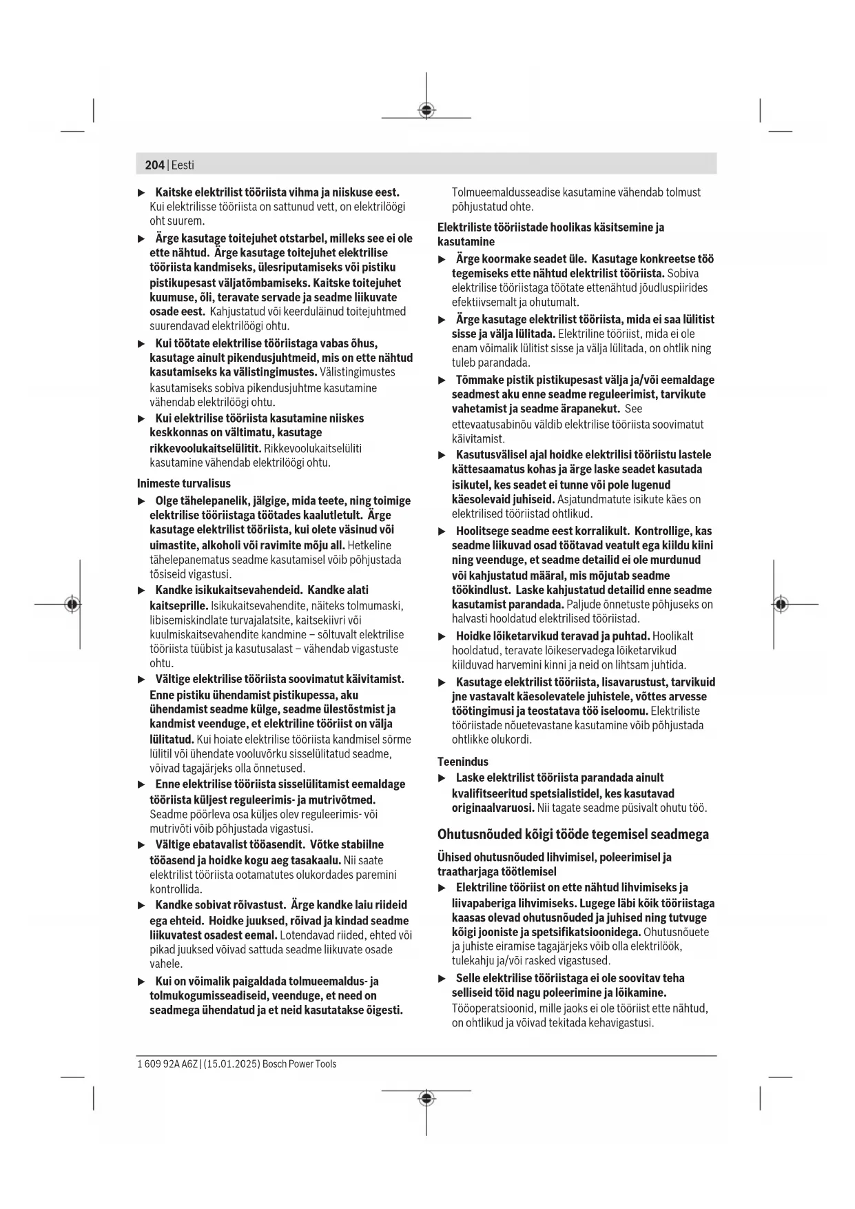 Isključivanje kod povratnog udarca U slučaju iznenadnog povratnog udarca električnog alata, npr. blokiranja kod glodanja, elektronički se prekida električno napajanje motora. Za ponovno puštanje u rad pomaknite prekidač za uključivanje/isključivanje(5)/(11) u isključeni položaj i ponovno uključite električni alat. Zaštita od ponovnog pokretanja Zaštita od ponovnog pokretanja sprječava nekontrolirano pokretanje električnog alata nakon prekida električnog napajanja. Za ponovno puštanje u rad pomaknite prekidač za uključivanje/isključivanje(5)/(11) u isključeni položaj i ponovno uključite električni alat. Napomena: U slučaju vrlo brzog isključivanja i ponovnog uključivanja može doći do toga da se aktivira zaštita od ponovnog pokretanja i da se električni alat neće pokrenuti unatoč pritisnutom prekidaču za uključivanje/ isključivanje(5)/(11). Pomaknite prekidač za uključivanje/ isključivanje(5)/(11) u isključeni položaj i ponovno uključite električni alat. Meki start Elektronički meki start ograničava zakretni moment pri uključivanju i time produljuje vijek trajanja motora. 1 609 92A A6Z | (15.01.2025) Bosch Power ToolsEesti | 203 Upute za rad u Prije svih radova na električnom alatu izvucite mrežni utikač iz utičnice. u Brusne alate čuvajte zaštićene od udaraca.u Električni alat ne opterećujte toliko jako da se zaustavi pod opterećenjem. u Nakon većeg opterećenja električni alat ostavite još nekoliko minuta da radi u praznom hodu kako bi se nastavak ohladio. u Brusna tijela se jako zagriju tijekom rada. Ne dirajte ih dok se ne ohlade. Za postizanje optimalnog radnog rezultata brusno tijelo pomičite ravnomjerno laganim pritiskom amo-tamo. Prejaki pritisak smanjuje učinak električnog alata i uzrokuje brže trošenje brusnog tijela. Održavanje i servisiranje Održavanje i čišćenje u Prije svih radova na električnom alatu izvucite mrežni utikač iz utičnice. u Održavajte električni alat i ventilacijske proreze čistima kako biste radili dobro i sigurno. u Kod ekstremnih uvjeta po mogućnosti uvijek koristite stacionarni uređaj za usisavanje. Često ispuhavajte otvore za hlađenje i predspojite zaštitnu strujnu sklopku (PRCD). Kod obrade metala vodljiva prašina se može nakupiti unutar električnog alata. To može negativno utjecati na zaštitnu izolaciju električnog alata. Pažljivo uskladištite i postupajte s priborom. Ako je potrebna zamjena priključnog kabela, tada je treba provesti u Bosch servisu ili u ovlaštenom servisu za Bosch električne alate kako bi se izbjeglo ugrožavanje sigurnosti. Servisna služba i savjeti o uporabi Servisna služba odgovorit će na sva vaša pitanja o popravljanju i održavanju ovog proizvoda te o rezervnim dijelovima. Povećane crteže i informacije o rezervnim dijelovima naći ćete i na adresi: www.bosch-pt.com Tim za savjetovanje o primjeni u tvrtki Bosch rado će vam pomoći sa svim pitanjima o našim proizvodima i njihovom priboru. Za sva pitanja i narudžbe rezervnih dijelova svakako navedite 10-znamenkasti broj artikla naveden na označnoj pločici. Hrvatski Robert Bosch d.o.o PT/SHR-BSC Kneza Branimira 22 10040 Zagreb Tel.: +385 12 958 051 Fax: +385 12 958 050 E-Mail: RBKN-bsc@hr.bosch.com www.bosch.hr Dodatne adrese servisa naći ćete na: www.bosch-pt.com/serviceaddresses Zbrinjavanje Električne alate, pribor i ambalažu treba dovesti na ekološki prihvatljivo recikliranje. Električne alate ne bacajte u kućni otpad! Samo za zemljeEU: Neupotrebljivi električni alati moraju se odvojeno zbrinuti. Koristite predviđene sustave prikupljanja otpada. Ako se otpadna električna i elektronička oprema nepropisno zbrine, to može imati štetne učinke na okoliš i zdravlje ljudi zbog moguće prisutnosti opasnih tvari. Eesti Ohutusnõuded Üldised ohutusnõuded HOIATUS Lugege läbi kõik ohutusnõuded ja juhised. Ohutusnõuete ja juhiste eiramise tagajärjeks võib olla elektrilöök, tulekahju ja/või rasked vigastused. Hoidke kõik ohutusnõuded ja juhised edasiseks kasutamiseks hoolikalt alles. Ohutusnõuetes sisalduv mõiste "elektriline tööriist" käib nii vooluvõrku ühendatud (juhtmega) elektriliste tööriistade kui ka akutoitega (juhtmeta) elektriliste tööriistade kohta. Ohutusnõuded tööpiirkonnas u Hoidke tööpiirkond puhas ja hästi valgustatud. Korrastamata või valgustamata töökoht võib põhjustada õnnetusi. u Ärge kasutage elektrilist tööriista plahvatusohtlikus keskkonnas, kus leidub tuleohtlikke vedelikke, gaase või tolmu. Elektrilistest tööriistadest lööb sädemeid, mis võivad tolmu või aurud süüdata. u Elektrilise tööriista kasutamise ajal hoidke lapsed ja teised inimesed töökohast eemal. Kui teie tähelepanu juhitakse kõrvale, võib seade teie kontrolli alt väljuda. Elektriohutus u Elektrilise tööriista pistik peab pistikupessa sobima. Pistiku kallal ei tohi teha mingeid muudatusi. Ärge kasutage kaitsemaandusega elektriliste tööriistade puhul adapterpistikuid. Muutmata pistikud ja sobivad pistikupesad vähendavad elektrilöögi ohtu. u Vältige kehalist kontakti maandatud pindadega, näiteks torude, radiaatorite, pliitide ja külmikutega. Kui Teie keha on maandatud, on elektrilöögi oht suurem. Bosch Power Tools 1 609 92A A6Z | (15.01.2025)204 | Eesti u Kaitske elektrilist tööriista vihma ja niiskuse eest. Kuielektrilisse tööriista on sattunud vett, on elektrilöögi oht suurem. u Ärge kasutage toitejuhet otstarbel, milleks see ei ole ette nähtud. Ärge kasutage toitejuhet elektrilise tööriista kandmiseks, ülesriputamiseks või pistiku pistikupesast väljatõmbamiseks. Kaitske toitejuhet kuumuse, õli, teravate servade ja seadme liikuvate osade eest. Kahjustatud või keerduläinud toitejuhtmed suurendavad elektrilöögi ohtu. u Kui töötate elektrilise tööriistaga vabas õhus, kasutage ainult pikendusjuhtmeid, mis on ette nähtud kasutamiseks ka välistingimustes. Välistingimustes kasutamiseks sobiva pikendus