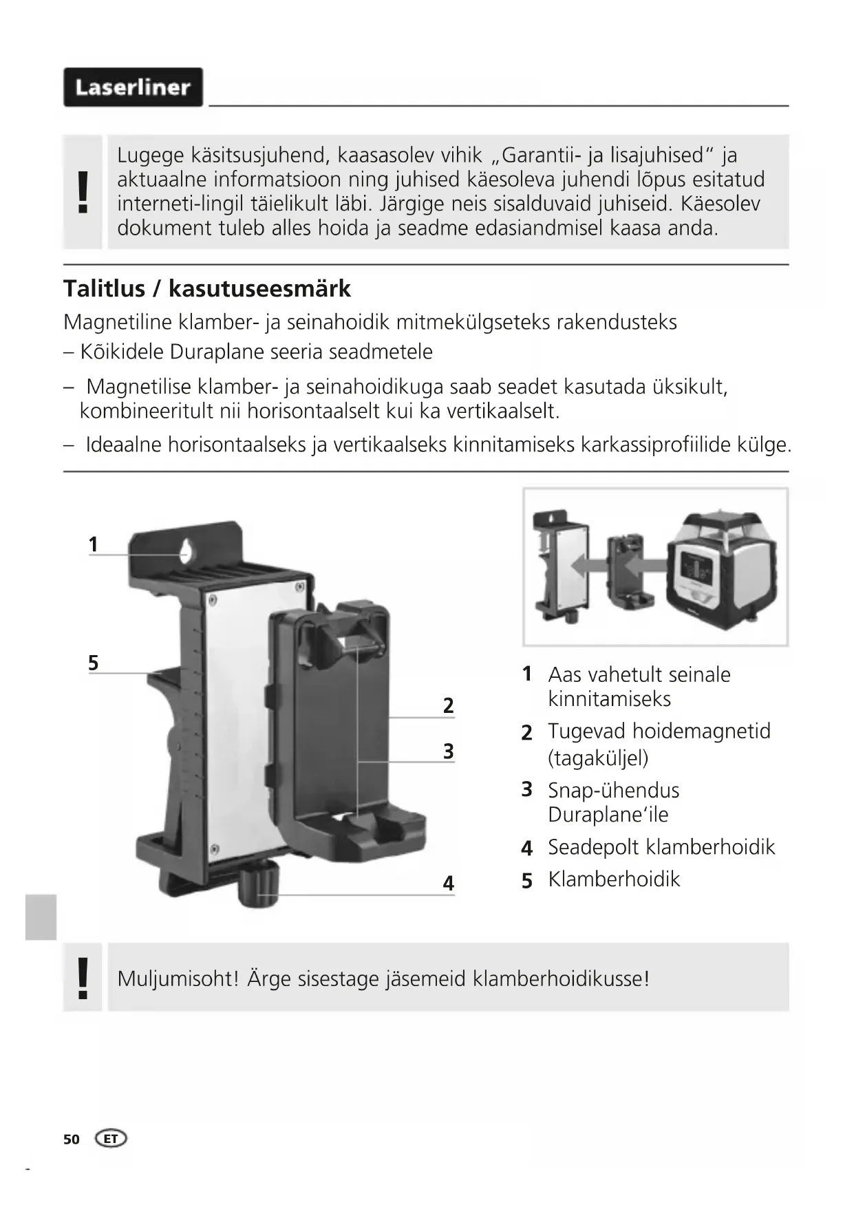 Talitlus / kasutuseesmärk Magnetiline klamber- ja seinahoidik mitmekülgseteks rakendusteks – Kõikidele Duraplane seeria seadmetele – Magnetilise klamber- ja seinahoidikuga saab seadet kasutada üksikult, kombineeritult nii horisontaalselt kui ka vertikaalselt. – Ideaalne horisontaalseks ja vertikaalseks kinnitamiseks karkassiproilide külge. Lugege käsitsusjuhend, kaasasolev vihik „Garantii- ja lisajuhised“ ja aktuaalne informatsioon ning juhised käesoleva juhendi lõpus esitatud interneti-lingil täielikult läbi. Järgige neis sisalduvaid juhiseid. Käesolev dokument tuleb alles hoida ja seadme edasiandmisel kaasa anda.