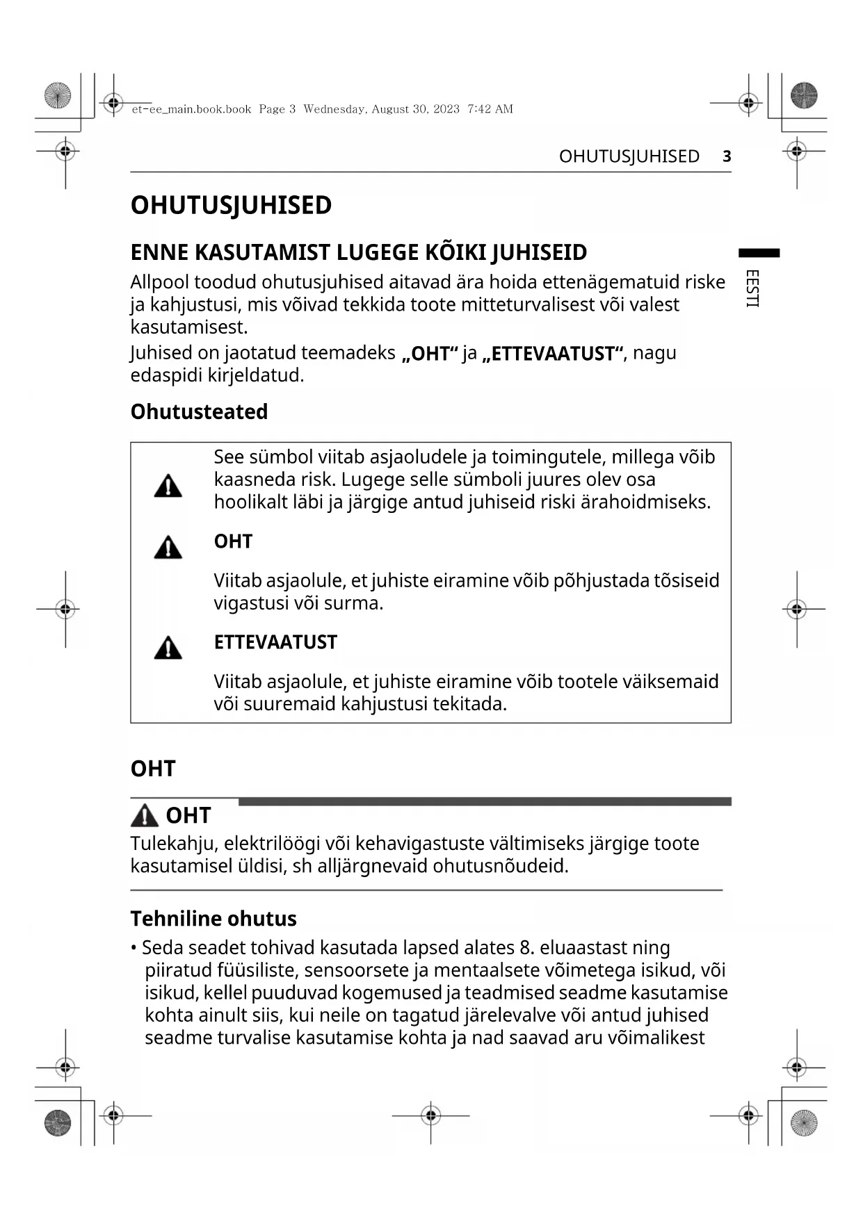 - Seda seadet tohivad kasutada lapsed alates 8. eluaastast ning piiratud füüsiliste, sensoorsete ja mentaalsete võimetega isikud, või isikud, kellel puuduvad kogemused ja teadmised seadme kasutamise kohta ainult siis, kui neile on tagatud järelevalve või antud juhised seadme turvalise kasutamise kohta ja nad saavad aru võimalikest See sümbol viitab asjaoludele ja toimingutele, millega võib kaasneda risk. Lugege selle sümboli juures olev osa hoolikalt läbi ja järgige antud juhiseid riski ärahoidmiseks. OHT Viitab asjaolule, et juhiste eiramine võib põhjustada tõsiseid vigastusi või surma. ETTEVAATUST Viitab asjaolule, et juhiste eiramine võib tootele väiksemaid või suuremaid kahjustusi tekitada. et-ee_main.book.book Page 3 Wednesday, August 30, 2023 7:42 AM4 OHUTUSJUHISED ohtudest. Lapsed ei tohi seadmega mängida. Lapsed ei tohi teha seadme puhastus- ja hooldustöid ilma järelevalve.