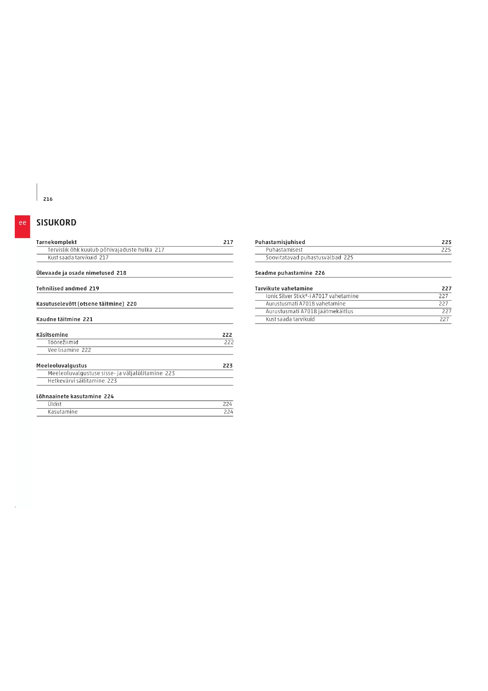 SISUKORD Tarnekomplekt 217 Tervislik õhk kuulub põhivajaduste hulka 217 Kust saada tarvikuid 217 Ülevaade ja osade nimetused 218 Tehnilised andmed 219 Kasutuselevõtt (otsene täitmine) 220 Kaudne täitmine 221 Käsitsemine 222 Töörežiimid 222 Vee lisamine 222 Meeleoluvalgustus 223 Meeleoluvalgustuse sisse- ja väljalülitamine 223 Hetkevärvi säilitamine 223 Lõhnaainete kasutamine 224 Üldist 224 Kasutamine 224 Puhastamisjuhised 225 Puhastamisest 225 Soovitatavad puhastusvälbad 225 Seadme puhastamine 226 Tarvikute vahetamine 227 Ionic Silver Stick®-i A7017 vahetamine 227 Aurustusmati A7018 vahetamine 227 Aurustusmati A7018 jäätmekäitlus 227 Kust saada tarvikuid 227217