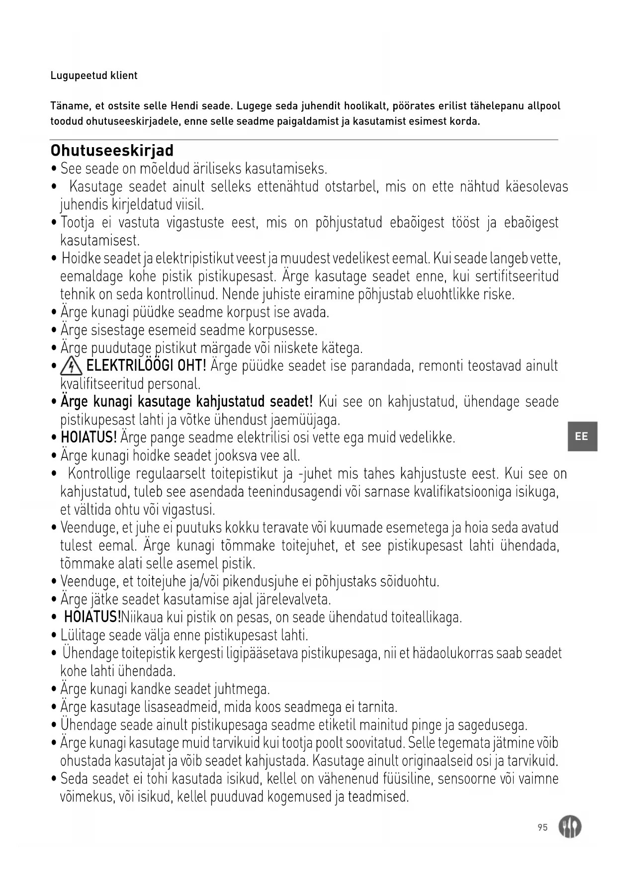 - Seda seadet peaks kasutama ainult koolitatud personal restorani köögis, sööklates, baarides jne.