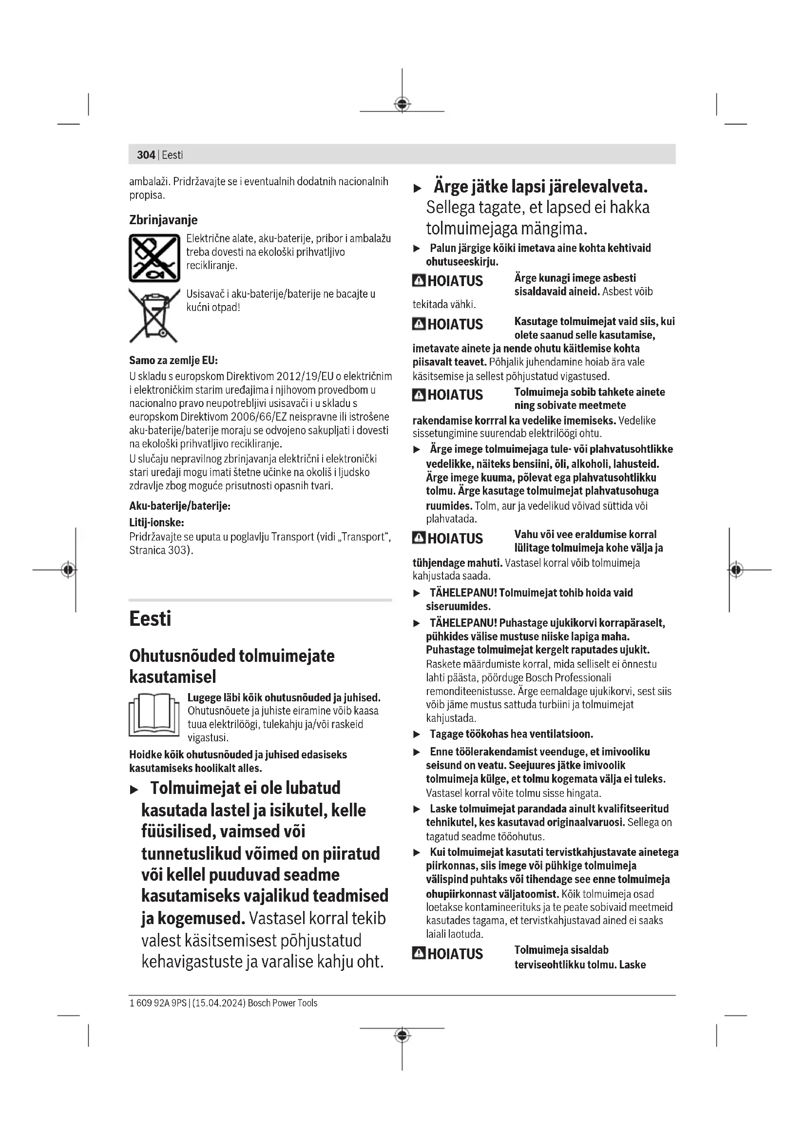 Imemine Ladestunud tolmu imemine Toote ja selle omaduste kirjeldus Pange tähele kasutusjuhendi esiosas olevaid jooniseid. Nõuetekohane kasutamine Tolmuimeja on ette nähtud puitlaastude ning mittepõleva kuiva tolmu, mittepõleva vedeliku ja vedeliku-õhu-segu kogumiseks, sisseimemiseks, transpordiks ning eraldamiseks.Tolmuimejat on tolmutehniliselt katsetatud ja see vastab tolmuklassileM. See ei sobi tööstuslikul kasutamisel (tootmisettevõtetes, töökodades) tekkiva suurema koormuse jaoks. Bosch Power Tools 1 609 92A 9PS | (15.04.2024)306 | Eesti Rahvusvahelise standardi IEC/EN60335-2-69 kohase tolmuklassiga M tolmuimejaid tohib kasutada ainult kontsentratsiooni piirmääraga ≥0,1mg/m