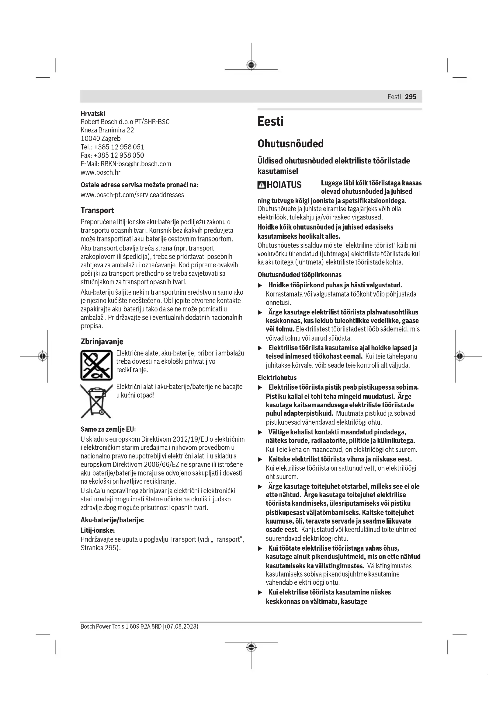 Selles juhendis toodud vibratsioonitaseme ja mürapäästu väärtused on mõõdetud standardset mõõtemeetodit kasutades ja neid saab kasutada elektriliste tööriistade omavaheliseks võrdlemiseks. Need sobivad ka vibratsioonitaseme ja mürapäästu esialgseks hindamiseks. Toodud vibratsioonitaseme ja mürapäästu väärtused on iseloomulikud elektrilise tööriista põhiliste rakenduste korral. Kui aga elektrilist tööriista kasutatakse muudes rakendustes, muude vahetatavate tööriistadega või ebapiisavalt hooldades, võivad vibratsioonitaseme ja mürapäästu väärtused nendest erinevad olla. See võib kogu tööaja vibratsioonitaset ja mürapäästu tunduvalt suurendada. Vibratsioonitaseme ja mürapäästu täpseks hindamiseks tuleb arvesse võtta ka aega, mil seade on välja lülitatud või mil seade on küll sisse lülitatud, kuid tegelikult tööle rakendamata. See võib kogu tööaja vibratsioonitaset ja mürapäästu tunduvalt vähendada. Rakendage kasutaja kaitsmiseks vibratsiooni mõju eest täiendavaid kaitsemeetmeid, nagu näiteks: elektrilise tööriista ja vahetatavate tööriistade hooldus, kätesoojendus, töökorraldus. Aku Bosch müüb ka juhtmeta elektrilisi tööriistu ilma akuta. Pakendilt näete, kas aku kuulub teie elektrilise tööriista tarnekomplekti. Aku laadimine u Kasutage üksnes tehnilistes andmetes loetletud laadimisseadmeid. Vaid need laadimisseadmed on ette nähtud elektrilises tööriistas kasutatud liitium-ioonaku laadimiseks. Juhis: liitiumioonakud tarnitakse tehasest rahvusvaheliste transpordieeskirjade põhjal osaliselt laetutena. Selleks et aku täielikku võimsust tagada, laadige aku enne esimest kasutamist täielikult täis. Aku paigaldamine Lükake laetud aku akuhoidikusse nii, et see tuntavalt fikseeruks. Aku eemaldamine Aku eemaldamiseks vajutage lukustuse vabastamise nuppe ja tõmmake aku välja. Ärge rakendage seejuures jõudu. Akulon kakslukustusastet, mis takistavad aku väljakukkumist aku lukustuse vabastamisnupu kogemata vajutamisel. Elektritööriista paigaldatud akut hoiab õiges asendis vedru. Aku laetuse taseme näidik Märkus: kõikidel akutüüpidel ei ole laetuse taseme indikaatorit. 1 609 92A 8RD | (07.08.2023) Bosch Power ToolsEesti | 299 Rohelised LEDid aku laetuse taseme näidikul näitavad aku laetuse taset. Ohutuse huvides saab aku laetuse taset vaadata ainult väljalülitatud elektrilisel tööriistal. Laetuse taseme vaatamiseks vajutage laetuse taseme näidiku nuppu või . See on võimalik ka väljavõetud aku korral. Kui laetuse taseme näidiku nupuvajutamisel ei sütti ükski LED, on aku defektne ja tuleb välja vahetada. Aku tüüp GBA 18V... LED Mahtuvus Pidev tuli 3× roheline 60–100% Pidev tuli 2× roheline 30–60% Pidev tuli 1× roheline 5–30% Vilkuv tuli 1× roheline 0–5% Aku tüüp ProCORE18V... LED Mahtuvus Pidev tuli 5× roheline 80–100% Pidev tuli 4× roheline 60–80% Pidev tuli 3× roheline 40–60% Pidev tuli 2× roheline 20–40% Pidev tuli 1× roheline 5–20% Vilkuv tuli 1× roheline 0–5% Juhised aku käsitsemiseks Kaitske akut niiskuse ja vee eest. Hoidke aku temperatuuril –20 °C kuni 50 °C. Ärge jätke akut suvel autosse. Puhastage aku ventilatsiooniavasid pehme, puhta ja kuiva pintsliga. Oluliselt lühenenud kasutusaeg pärast laadimist näitab, et aku on muutunud kasutuskõlbmatuks ja tuleb välja vahetada. Järgige ringlussevõtu juhiseid. Paigaldus u Eemaldage aku seadmest enne mis tahes töid seadme kallal (nt hooldus, tarvikute vahetus jmt), samuti enne seadme transportimist ja hoiulepanekut. Lüliti (sisse/ välja) juhuslik käsitsemine toob kaasa vigastuste ohu. Tööriistavahetus u Tööriista vahetamisel kandke kaitsekindaid. Vahetatavate tööriistadega kokkupuutel võite end vigastada. Vahetatava tööriista valik Kasutage oma elektrilise tööriista jaoks ette nähtud vahetatavaid tööriistu. Vahetatav tööriist GOP18V‑34 Järgnevas tabelis on toodud vahetatavate tööriistade näited. Rohkem vahetatavaid tööriistu leiate Boschi ulatuslikust lisavarustuseprogrammist. Vahetatav tööriist Materjal Kasutamine AIZ 10 AB Starlock 10 × 20mm bimetall- sukelsaeleht puidule ja metallile Pehme puit, pehmed plastid, kipsplaat, õhukeseseinalised alumiiniumist ja värvilisest metallist profiilid, õhukesed plekid, karastamata naelad ja kruvid Väiksemad järkamis- ja sukellõiked; filigraansed kohandustööd puidus Näide: väljalõike tegemine pistikupesa jaoks, sukellõiked kipsplaatides, avade saagimine lukkudele ja furnituuridele AIZ 32 EPC Starlock 32 × 50mmHCS- sukelsaeleht puidule Pehme puit Rebestusteta järkamis- ja sukellõiked tänu ümmargusele saeservale (Curved-Tec); ka servalähedaseks saagimiseks nurkades ja raskesti ligipääsetavates piirkondades; Näide: sukellõige õhutusvõre paigaldamiseks või ava pistikupesade jaoks AIZ 32 APB/ AIZ 32 APIB Starlock 32×50mm Puitkomposiitmaterjalid ja raua mittesisaldavad metallid, karastamata naelad ja kruvid, Rebestusteta, tasased lõiked ja sukellõiked puidus, rauda mittesisaldavates metallides ja plastis tänu ümmargusele saeservale (Curved-Tec); Bosch Power Tools 1 609 92A 8RD | (07.08.2023)300 | Eesti Vahetatav tööriist Materjal Kasutamine bimetall- sukelsaeleht puidule ja metallile mitteraudmetallist väiksemate mõõtmetega torud ja profiilid Näide: avad pistikupesadele ja torudele, karastamata naelte ja kruvide pinnaga tasaseks lõikamine PAIZ 32 APB StarlockPlus 32 × 60mm bimetall- sukelsaeleht puidule ja metallile Puitkomposiitmaterjalid ja värvilised metallid, karastamata naelad ja kruvid, värvilisest metallist väiksemate mõõtmetega torud ja profiilid Kiired ja sügavad sukellõiked puidus, abrasiivsetes puitmaterjalides ja plastides, rebenemisvaba töötlemine tänu ümmargusele lõikeservale (Curved-Tec); Näide: värvilisest metallist väiksemat mõõtu torude ja profiilide kiire järkamine, karastamata naelte, kruvide ja väiksemat mõõtu terasprofiilide tavaline lõikamine AIZ 32 BSP