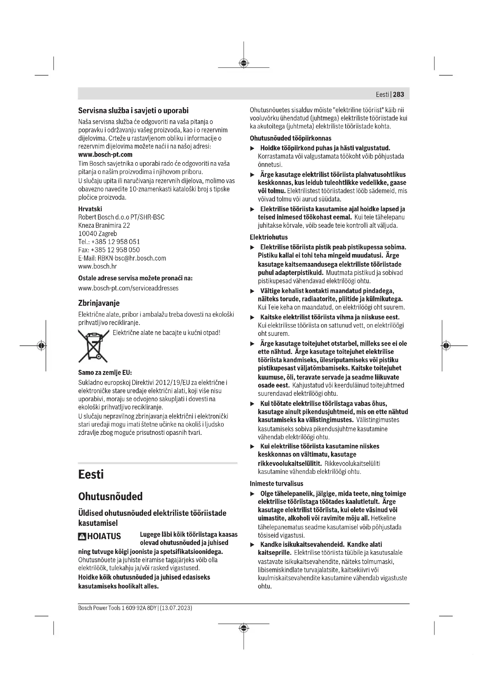 Õhukeste plekkide või muude kergelt vibreeruvate suurepinnaliste materjalide lihvimine võib põhjustada kuni 15 dB võrra suurenenud mürapäästu. Suurenenud mürapäästu saab vähendada sobivate raskete summutusmattide kasutamisega. Suurenenud müraemissiooni tuleb arvestada nii müravõimsuse riskihindamisel kui sobiva kuulmiskaitse valikul. Selles juhendis toodud vibratsioonitaseme ja mürapäästu väärtused on mõõdetud standardset mõõtemeetodit kasutades ja neid saab kasutada elektriliste tööriistade omavaheliseks võrdlemiseks. Need sobivad ka vibratsioonitaseme ja mürapäästu esialgseks hindamiseks. Toodud vibratsioonitaseme ja mürapäästu väärtused on iseloomulikud elektrilise tööriista põhiliste rakenduste korral. Kui aga elektrilist tööriista kasutatakse muudes rakendustes, muude vahetatavate tööriistadega või ebapiisavalt hooldades, võivad vibratsioonitaseme ja mürapäästu väärtused nendest erinevad olla. See võib kogu tööaja vibratsioonitaset ja mürapäästu tunduvalt suurendada. Vibratsioonitaseme ja mürapäästu täpseks hindamiseks tuleb arvesse võtta ka aega, mil seade on välja lülitatud või mil seade on küll sisse lülitatud, kuid tegelikult tööle rakendamata. See võib kogu tööaja vibratsioonitaset ja mürapäästu tunduvalt vähendada. Rakendage kasutaja kaitsmiseks vibratsiooni mõju eest täiendavaid kaitsemeetmeid, nagu näiteks: elektrilise tööriista ja vahetatavate tööriistade hooldus, kätesoojendus, töökorraldus. Taaskäivitumiskaitse Taaskäivitumiskaitse hoiab ära seadme kontrollimatu käivitumise pärast voolukatkestust. Taaskasutuselevõtuks viige sisse-/väljalüliti (3) väljalülitatud asendisse ja lülitage elektriline tööriist uuesti sisse. Paigaldus Kaitseseadise paigaldamine u Enne mistahes tööde teostamist elektrilise tööriista kallal tõmmake pistik pistikupesast välja. Märkus: Juhul kui lihvketas töötamise ajal murdub või kui kettakaitse/elektrilise tööriista kinnitusseadised saavad kahjustada, tuleb elektriline tööriist toimetada viivitamatult hoolduskeskusse; aadressid on toodud jaotises “Klienditeenindus ja kasutusalane nõustamine". Kaitsekate lihvimiseks Asetage kaitsekate (7) elektrilisel tööriistal olevale hoidikule, nii et kaitsekatte kodeerimisnagad kattuvad hoidikuga. Vajutage sealjuures ja hoidke vajutatult lukustuse vabastamishooba (1). Vajutage kaitsekate (7) spindlikaelale, kuni kaitsekatte ühenduskoht toetub elektrilise tööriista äärikule ja pöörake kaitsekatet, nii et see selgelt kuuldavalt fikseerub. Sobitage kaitsekate (7) tööoperatsiooni nõuetega. Suruge selleks lukustuse vabastamishoob (1) üles ja pöörake kaitsekate (7) soovitud asendisse. u Seadke kaitsekate(7) alati nii, et lukustuse vabastamishoova(1) mõlemad nagad oleksid kaitsekatte(7) vastavates väljalõigetes. u Reguleerige kaitsekate (7) välja nii, et sädemeid ei lendu kasutaja suunas. u Lisavarustuse pöörlemissuunas peab saama kaitekatet(7) pöörata ainult lukustuse vabastamishooba(1) käsitsedes! Vastasel korral ei tohi elektrilist tööriista mitte mingil juhul edasi kasutada ja see tuleb üle anda klienditeenindusele. Suunis: Kodeerimisnagad kaitsekattel (7) tagavad, et elektrilisele tööriistale saab paigaldada ainult sobiva kaitsekatte. Imikate lihvimiseks Värvide, lakkide ja plastide lihvimiseks kõvasulam- kausskettaga (11) võite kasutada tomueemalduskatet (6). Tolmueemalduskate (6) ei sobi metallide töötlemiseks. Tolmueemalduskattega (6) saab ühendada sobiva Boschi tolmuimeja. Asetage selleks tolmueemaldusadapteriga imivoolik tolmueemalduskatte sellekohasesse ühendusotsakusse. Kaitsekate lõikamiseks u Kasutage lõikamiseks alati lõikamise kaitsekatet (8) või lihvimise kaitsekatet (7) koos lõikamiskattega(9). u Kivi lõikamisel tuleb tagada piisavalt tõhus tolmuimemine. Lõikamise kaitsekate(8) paigaldatakse samamoodi kui lihvimise kaitsekate (7). Metallist lõikamiskate Paigaldage metallist lõikamiskate (9) lihvimise kaitsekattele (7) (vaata joonist A): pöörake hoidelook tagasi (➊). Asetage kate (9) lihvimise kaitsekattele (7) (➋). Suruge hoidelook tugevalt vastu kaitsekatet (7) (➌). Eemaldamiseks (vaata joonist B) suruge hoideloogal olevat nuppu (➊) ja pöörake hoidelook tagasi(➋). Tõmmake kate (9) kaitsekattelt (7) maha (➌). 1 609 92A 8DY | (13.07.2023) Bosch Power ToolsEesti | 289 Plastist lõikamiskate Asetage plastist lõikamiskate(9) lihvimise kaitsekattele(7) (vaata joonistC). Kate(9) fikseerub kuuldavalt ja nähtavalt kaitsekattele(7). Eemaldamiseks (vaata joonistD) vabastage kate(9) lukustusest kaitsekattel(7) (➊) vaskult või paremalt poolt ja tõmmake kate maha (➋). Juhtkelguga kaitsekate lõikamiseks Juhtkelguga lõikamise tolmueemalduskate(30) paigaldatakse samamoodi kui lihvimise kaitsekate. Lisakäepideme (5)/(4) kinnitamisega läbi tolmueemalduskatte ajami korpusele ühendatakse elektriline tööriist kindlalt tolmueemalduskattega. Juhtkelguga tolmueemaldamiskattega (30) saab ühendada sobiva Boschi tolmuimeja. Asetage selleks tolmueemaldusadapteriga imivoolik tolmueemalduskatte sellekohasesse ühendusotsakusse. Suunis: Tolmu poolt tolmu imemise ajal tekitatav hõõrdumine imivoolikus ja lisavarustuses põhjustab elektrostaatilise laengu, mille lahendumist võib kasutaja (olenevalt keskkonnateguritest ja oma füsioloogilisest seisundist) tunda.Bosch soovitab üldiselt kasutada kuivade materjalide peentolmu imemiseks antistaatilist imivoolikut (lisavarustus). Käekaitse u Paigaldage kummist lihvtaldrikuga(23) või kaussharja/koonusharja/teemant-puurkrooniga töötamisel alati käekaitse(22). Kinnitage käekaitse (22) lisakäepidemega (5)/(4). Standardne lisakäepide / vibratsiooni summutav lisakäepide Kruvige lisakäepide (5)/(4) olenevalt tööviisist paremalt või vasakult poolt ajamipeale. u Kasutage oma elektrilist tööriista ainult lisakäepidemega (5)/(4). u Lõpetage elektrilise tööriista kasutamine, kui lisakäepi