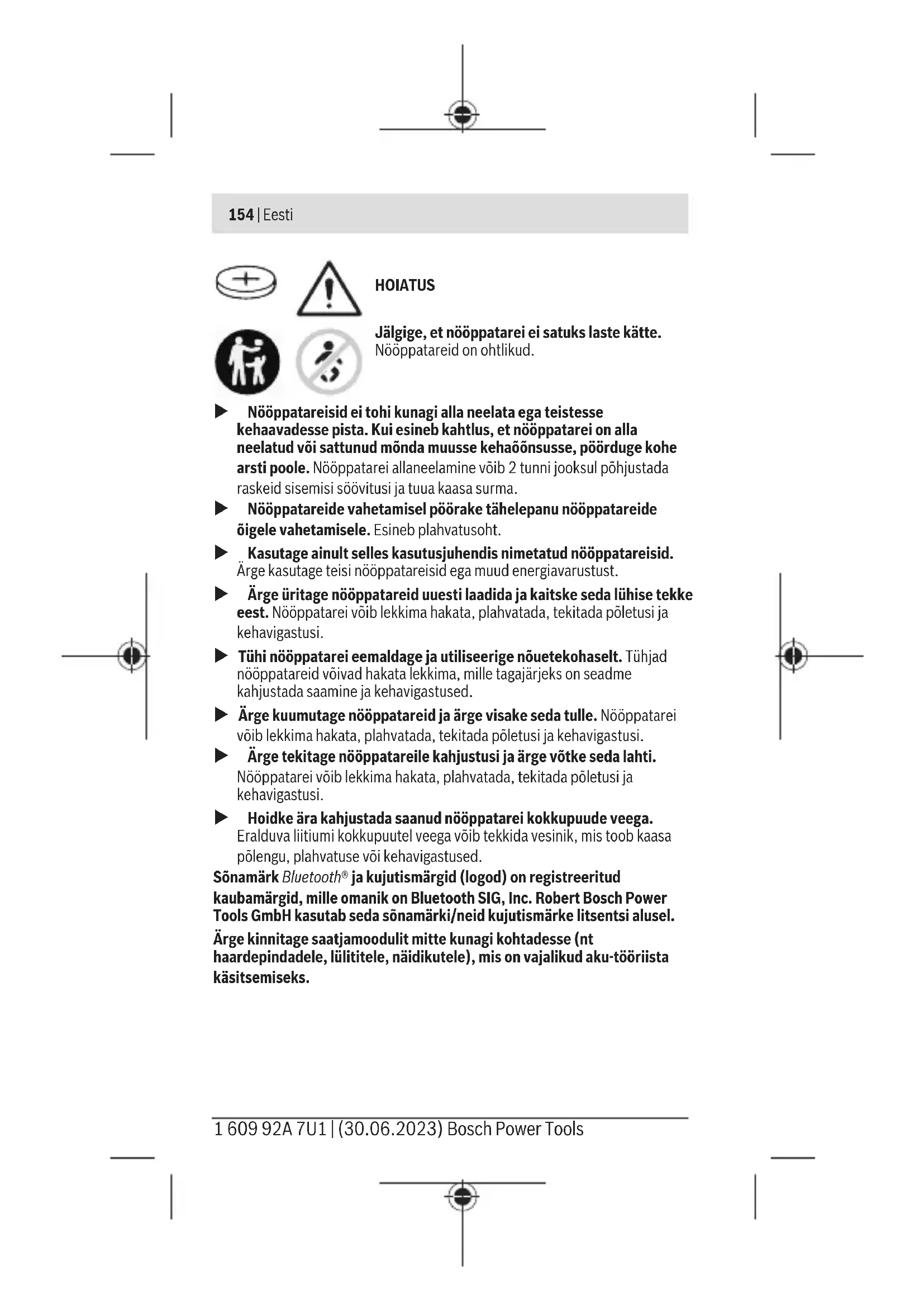 Kollane – Nööppatarei on peaagu tühi Vahetage peagi nööppatarei Punane – Ühendus on moodustamata või – Nööppatarei on tühi – Käivitage ühenduse moodustamiskatse uuesti või – Vahetage nööppatarei Bosch Power Tools 1 609 92A 7U1 | (30.06.2023)158 | Eesti Hooldus ja korrashoid Hooldus ja puhastamine Eemaldage mustus pintsliga või niiske riidelapiga. Ärge kasutage puhastusvahendeid ega lahusteid. Nööppatarei vahetamine u Tähelepanu! Nööpelemendi peab asendama alati sama tüüpi nööpelemendiga. Esineb plahvatusoht. u Tühi nööppatarei eemaldage ja utiliseerige nõuetekohaselt. Tühjad nööppatareid võivad hakata lekkima, mille tagajärjeks on seadme kahjustada saamine ja kehavigastused. – Avage patareipesa kaas saatjamooduli tagaküljel mündi abil. – Võtke nööppatarei ettevaatlikult välja ja pange sisse uus nööppatarei. Nööppatarei õigeks paigaldamiseks järgige tähistust. – Sulgege patareipesa kaas mündi abil. Korrektse sulgumise tagamiseks pöörake kaant kuni toeni. Klienditeenindus ja kasutusalane nõustamine Klienditeeninduse töötajad vastavad teie küsimustele teie toote remondi ja hoolduse ning varuosade kohta. Joonised ja info varuosade kohta leiate ka veebisaidilt: www.bosch-pt.com Boschi nõustajad on meeleldi abiks, kui teil on küsimusi toodete ja lisatarvikute kasutamise kohta. Päringute esitamisel ja varuosade tellimisel teatage meile kindlasti toote tüübisildil olev 10‑kohaline tootenumber. Eesti Vabariik Teeninduskeskus Tel.: (+372) 6549 575 Faks: (+372) 6549 576 E-posti: service-pt@lv.bosch.com Muud teeninduse aadressid leiate jaotisest: www.bosch-pt.com/serviceaddresses Kasutuskõlbmatuks muutunud seadmete ringlussevõtt Saatjamoodul, lisavarustus ja pakendid tuleb suunata keskkonnasäästlikku taaskasutusse. 1 609 92A 7U1 | (30.06.2023) Bosch Power ToolsLatviešu | 159 Ärge visake elektroonikadetaile ja patareisid olmejäätmete hulka! Latviešu Drošības noteikumi Lai varētu arGCT 30-42 strādāt droši un bez riska, rūpīgi izlasiet un ievērojiet visus norādījumus. Saglabājiet šos norādījumus un, ja nododatGCT 30-42 tālāk, nododiet tos līdzi.