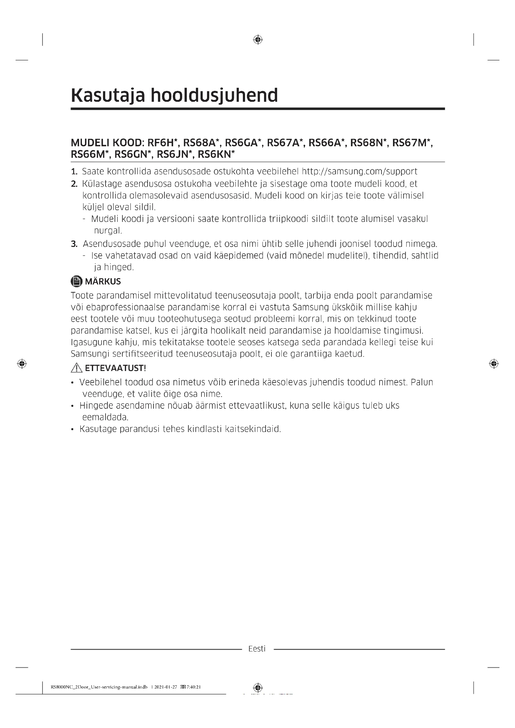 - Ise vahetatavad osad on vaid käepidemed (vaid mõnedel mudelitel), tihendid, sahtlid ja hinged. MÄRKUS Toote parandamisel mittevolitatud teenuseosutaja poolt, tarbija enda poolt parandamise või ebaprofessionaalse parandamise korral ei vastuta Samsung ükskõik millise kahju eest tootele või muu tooteohutusega seotud probleemi korral, mis on tekkinud toote parandamise katsel, kus ei järgita hoolikalt neid parandamise ja hooldamise tingimusi. Igasugune kahju, mis tekitatakse tootele seoses katsega seda parandada kellegi teise kui Samsungi sertitseeritud teenuseosutaja poolt, ei ole garantiiga kaetud. ETTEVAATUST!