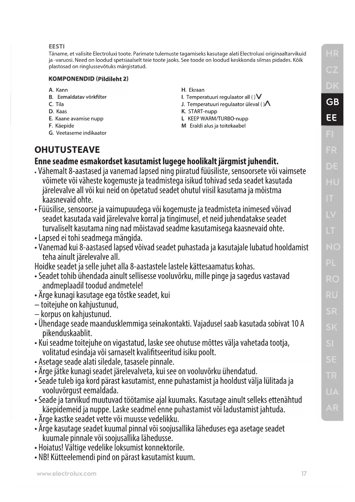J. Temperatuuri regulaator üleval ( ) K. START-nupp L KEEP WARM/TURBO-nupp M Eraldi alus ja toitekaabel OHUTUSTEAVE Enne seadme esmakordset kasutamist lugege hoolikalt järgmist juhendit.