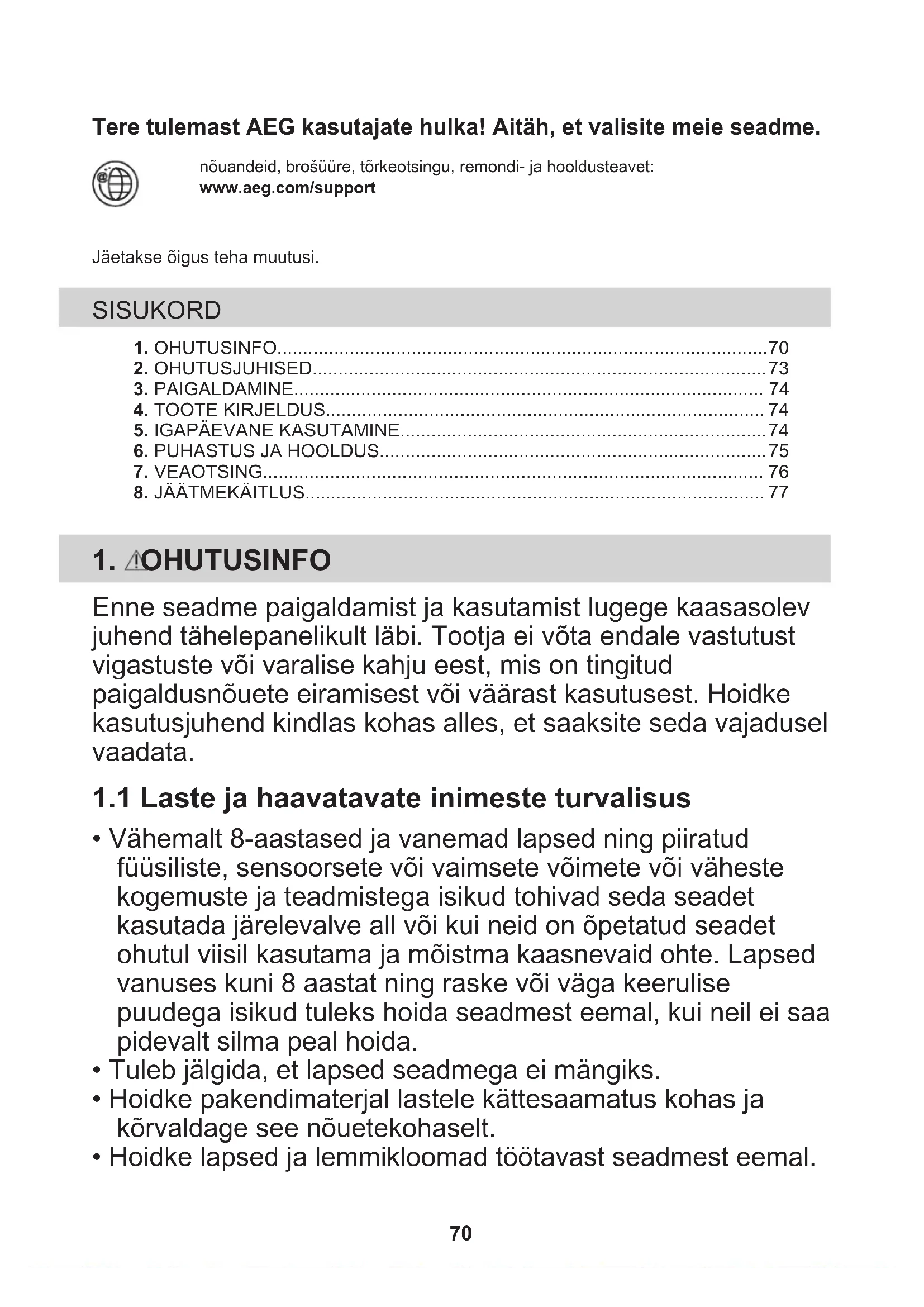 - Vähemalt 8-aastased ja vanemad lapsed ning piiratud füüsiliste, sensoorsete või vaimsete võimete või väheste kogemuste ja teadmistega isikud tohivad seda seadet kasutada järelevalve all või kui neid on õpetatud seadet ohutul viisil kasutama ja mõistma kaasnevaid ohte. Lapsed vanuses kuni 8 aastat ning raske või väga keerulise puudega isikud tuleks hoida seadmest eemal, kui neil ei saa pidevalt silma peal hoida.
